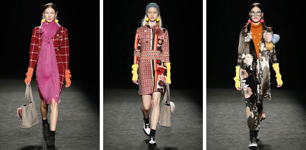 Another label that has been going strong for decades is Naulover, which was created in 1975. Produced locally and best known for knitwear, today it’s led by Carme Noguera, Creative Director and the daughter of its founder. This season, the collection was both elegant and playful, with an emphasis on ‘geek chic’. Grown up and lady-like classics, such as a checked skirt suit, boxy tweed jacket or polo neck jumper, were given a new lease of life using clashing colours and prints, and accessorized with oversized scarves in checks and stripes, wrist warmers in coral and canary yellow, pompom earrings in hot pink and an array of mismatched brooches. The nerd factor was ramped up with mannish brogues and trainers and owl-like jewelled glasses (perhaps a nod to Iris Apfel, last season’s guest of honour?)