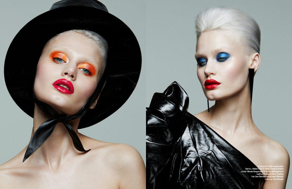 Max Liebenstein’s photography takes us on a colour odyssey, in this Schön! online beauty editorial. Make up and hair by Ina Cierniak explores a pale palette, interspersed with brilliant pops of red, blue and green painted across the eyes and lips of model Nicole Gregorczuk.