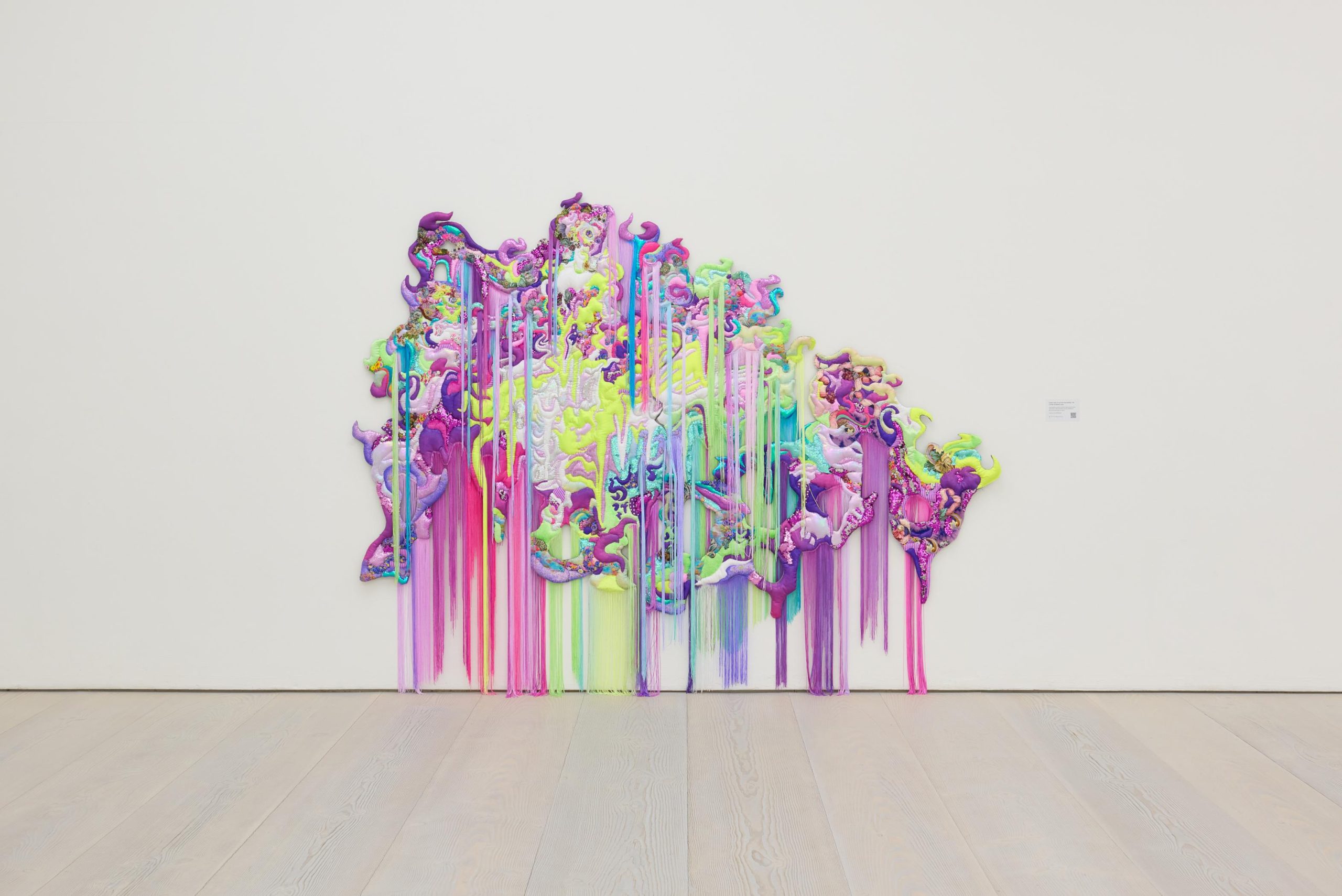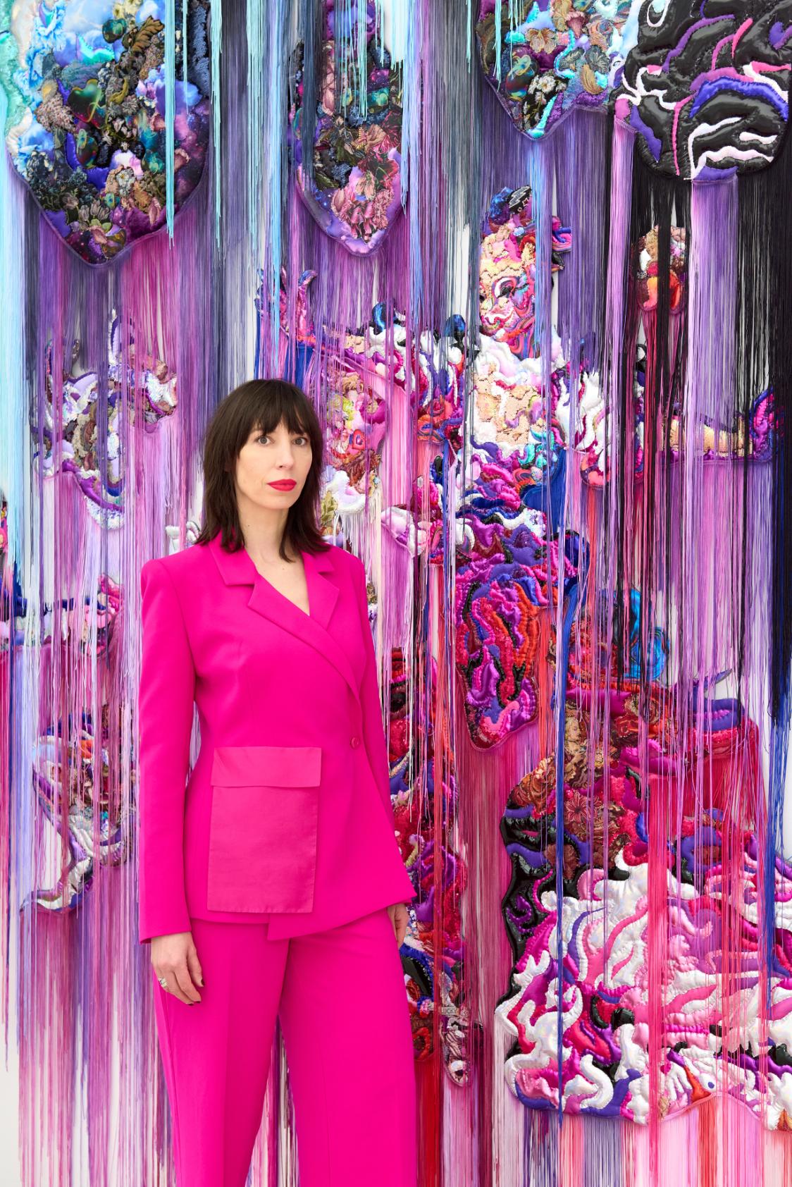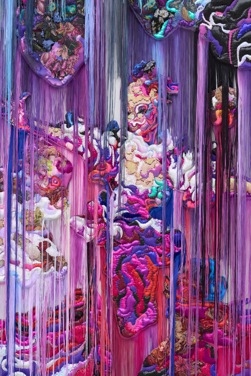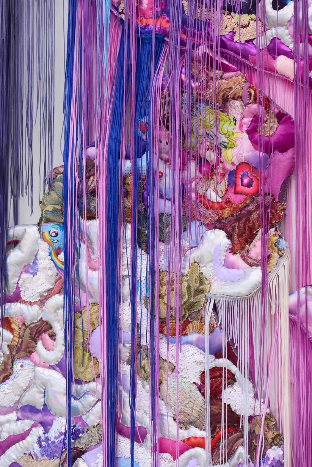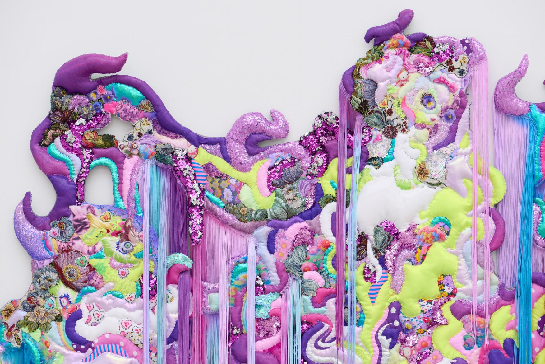 Tactile and whimsical, von Freyburg’s large-scale pieces are astounding for several reasons. The most obvious argument is the creative’s steadfast grip on textile art. Since completing her Goldsmiths Masters in 2016, von Freyburg has garnered attention for her intricate patchwork and stitched compositions. Blended with an alchemy of acrylic inks, collaged fabric, sequins, tassel fringes and eccentric ephemera, her works reimagine textile as a medium within the tradition of painting. “It’s one of the biggest drives behind my work and my aim is to blur these [craft and fine art] boundaries,” says the artist. As well as being aesthetically compelling, the artist’s waterfalls of fanciful embellishments also hold social and personal gravitas. “Making large-scale work from fabrics that are quite kitschy and gaudy and overly feminine is really empowering and fun for me,” says von Freyburg. “It makes me deal with difficult topics and frustrations in a light-hearted way.”