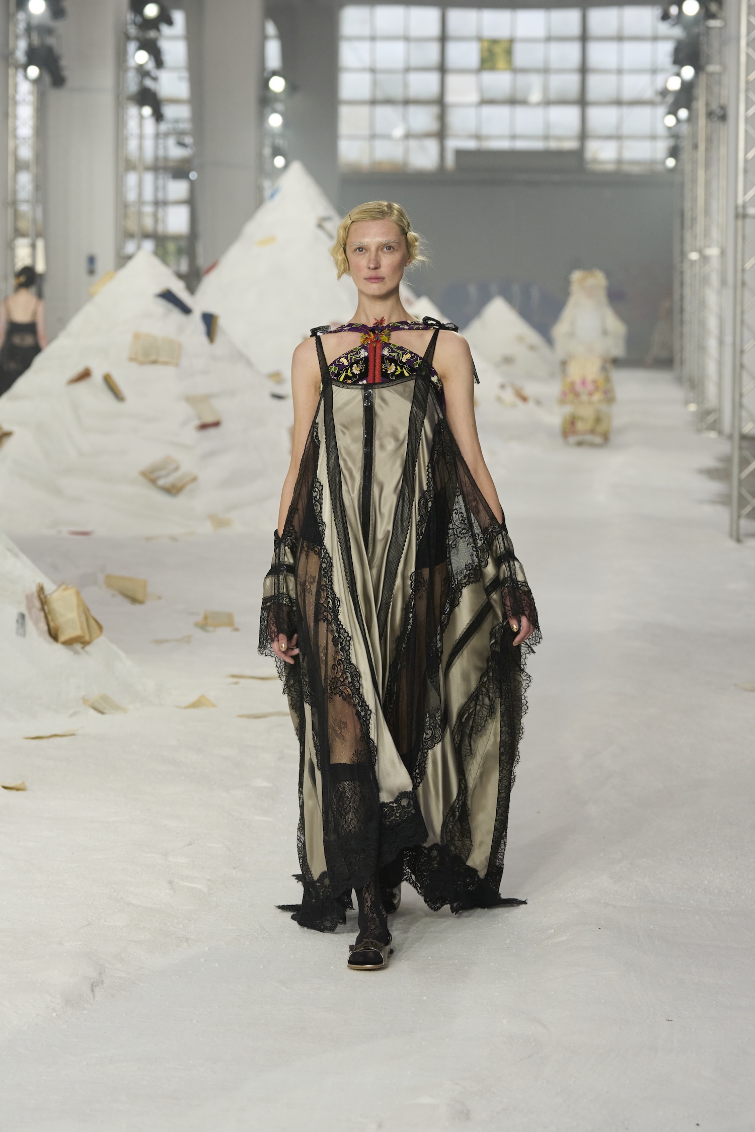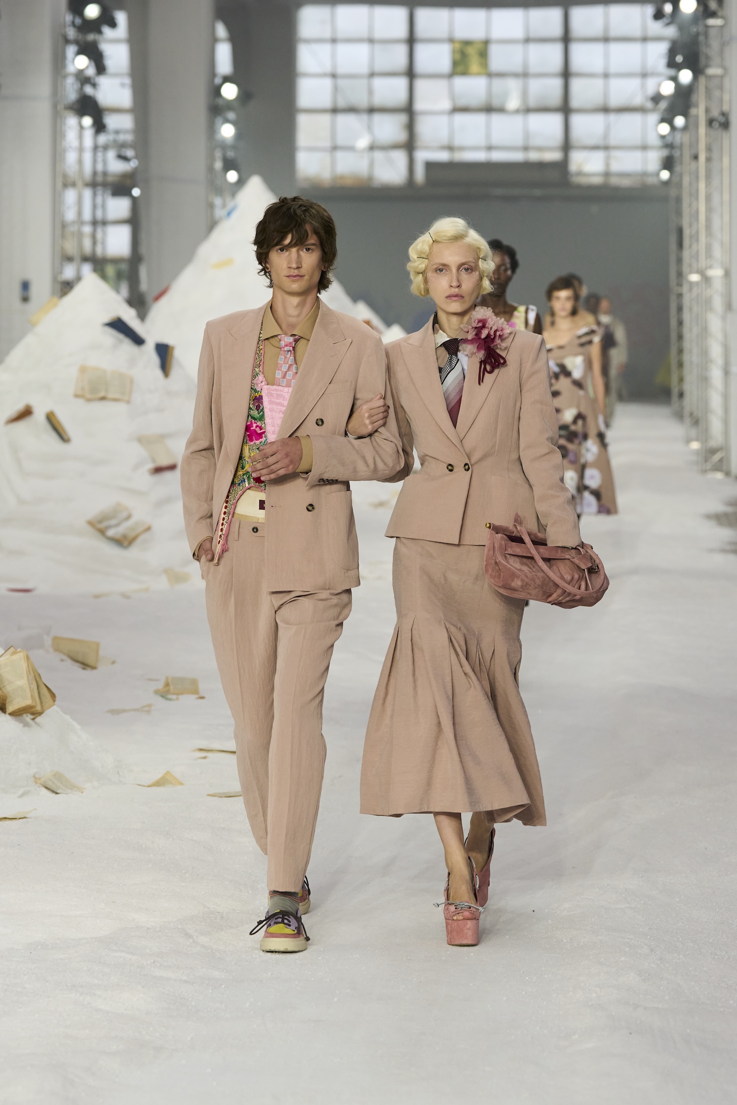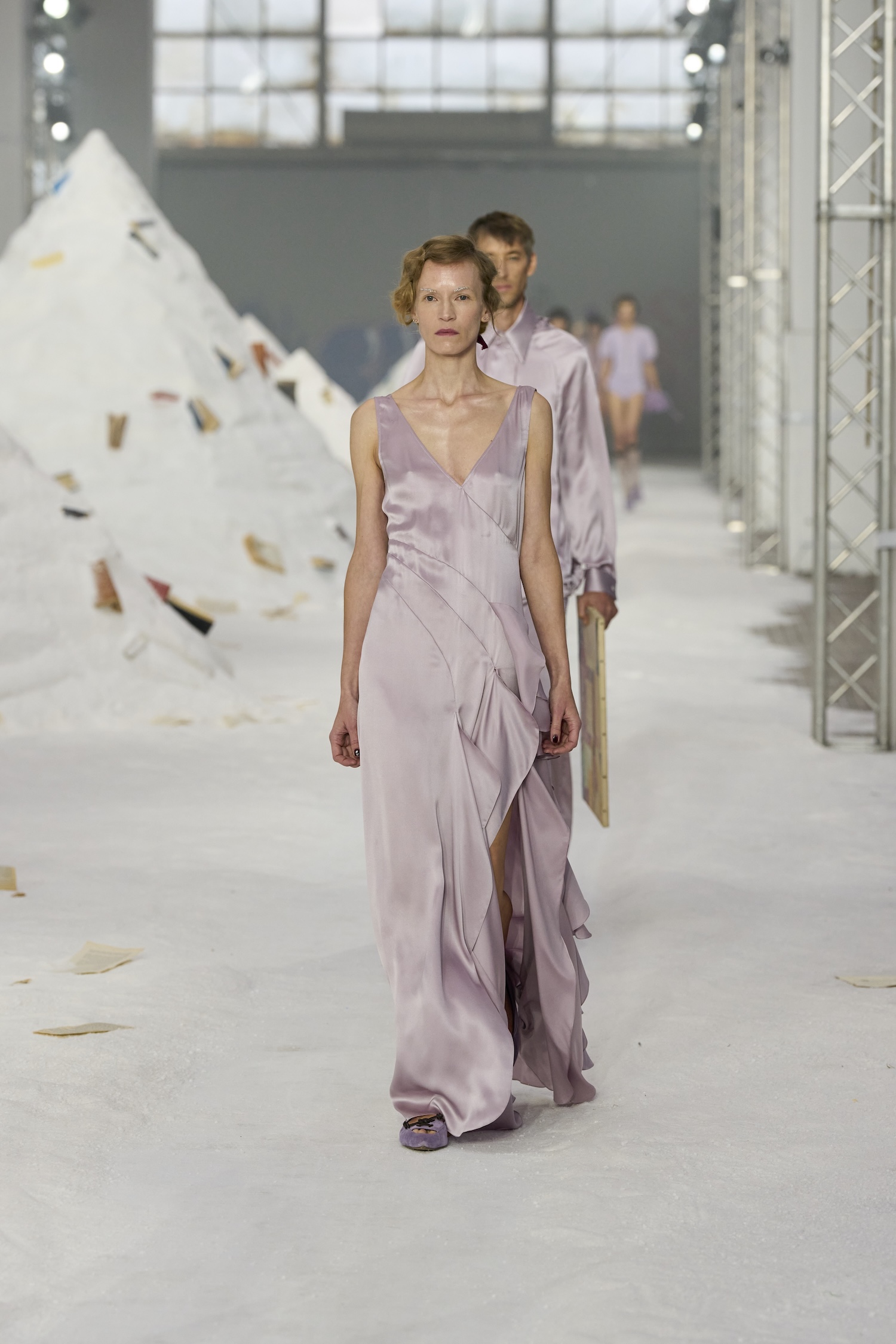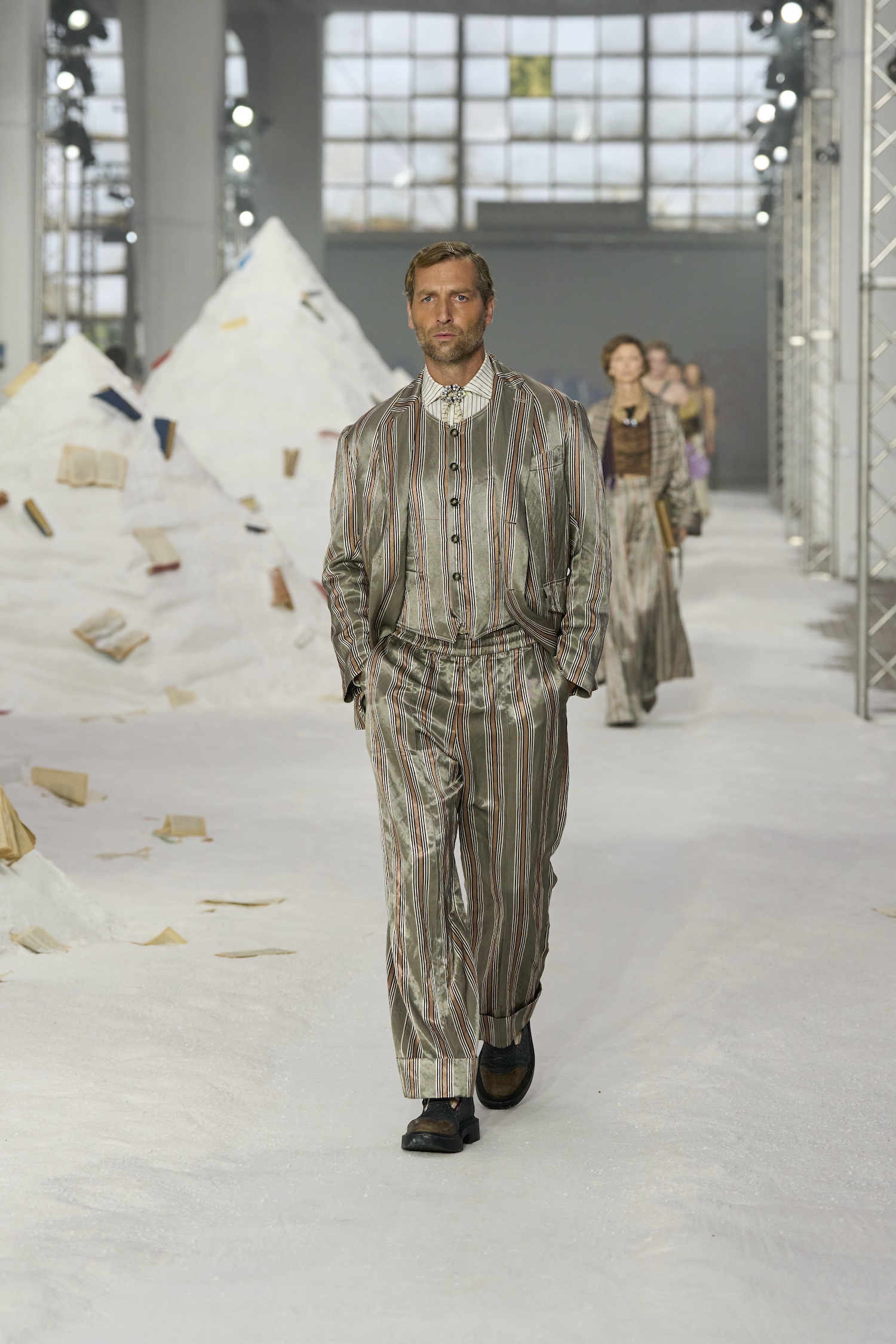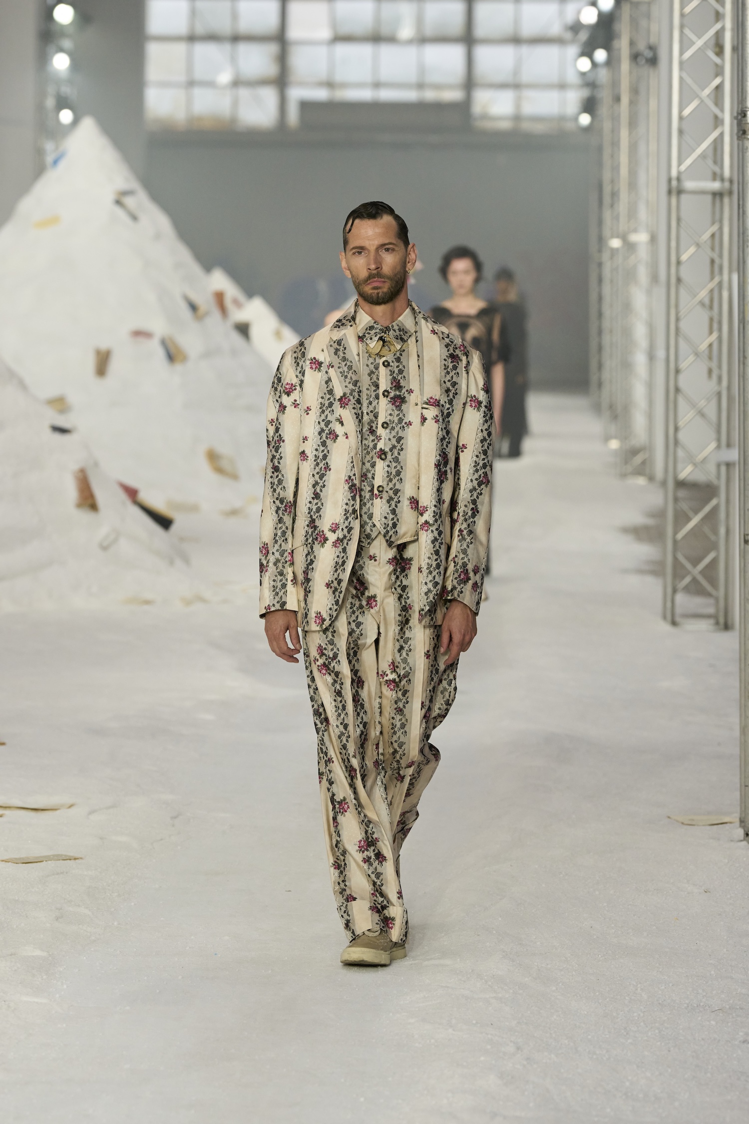Silhouettes refused singularity. Sweeping gowns swirled with ruffles and draping worthy of Gloria Swanson; men’s robes evoked Hercule Poirot’s composed elegance. Tailored suits brushed against cocktail dresses, pyjama sets slipped into eveningwear. Knitwear mimicked embroidery, leather disrupted lace, and hand-embroidered pieces blurred like watercolours – just like the dozens of sketches pictured in the show notes. Men and women wore the same fabrics, reinterpreted in divergent ways and collapsing the rules of gendered dressing – which is at the heart of Marras’ vision.