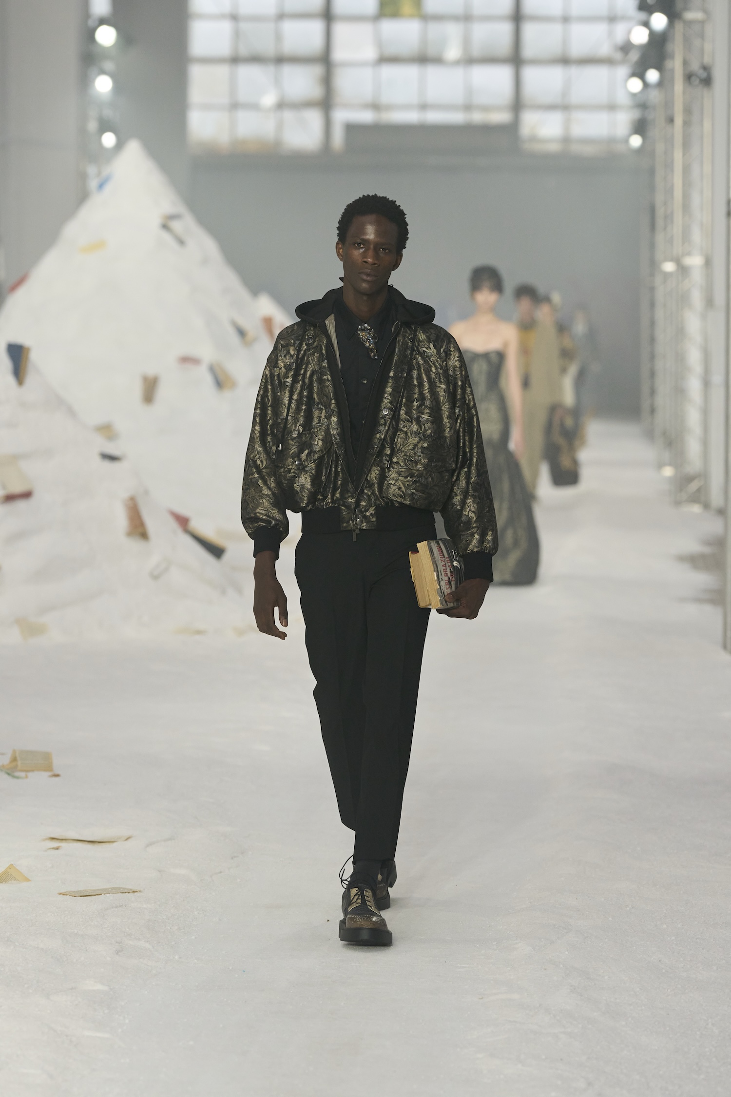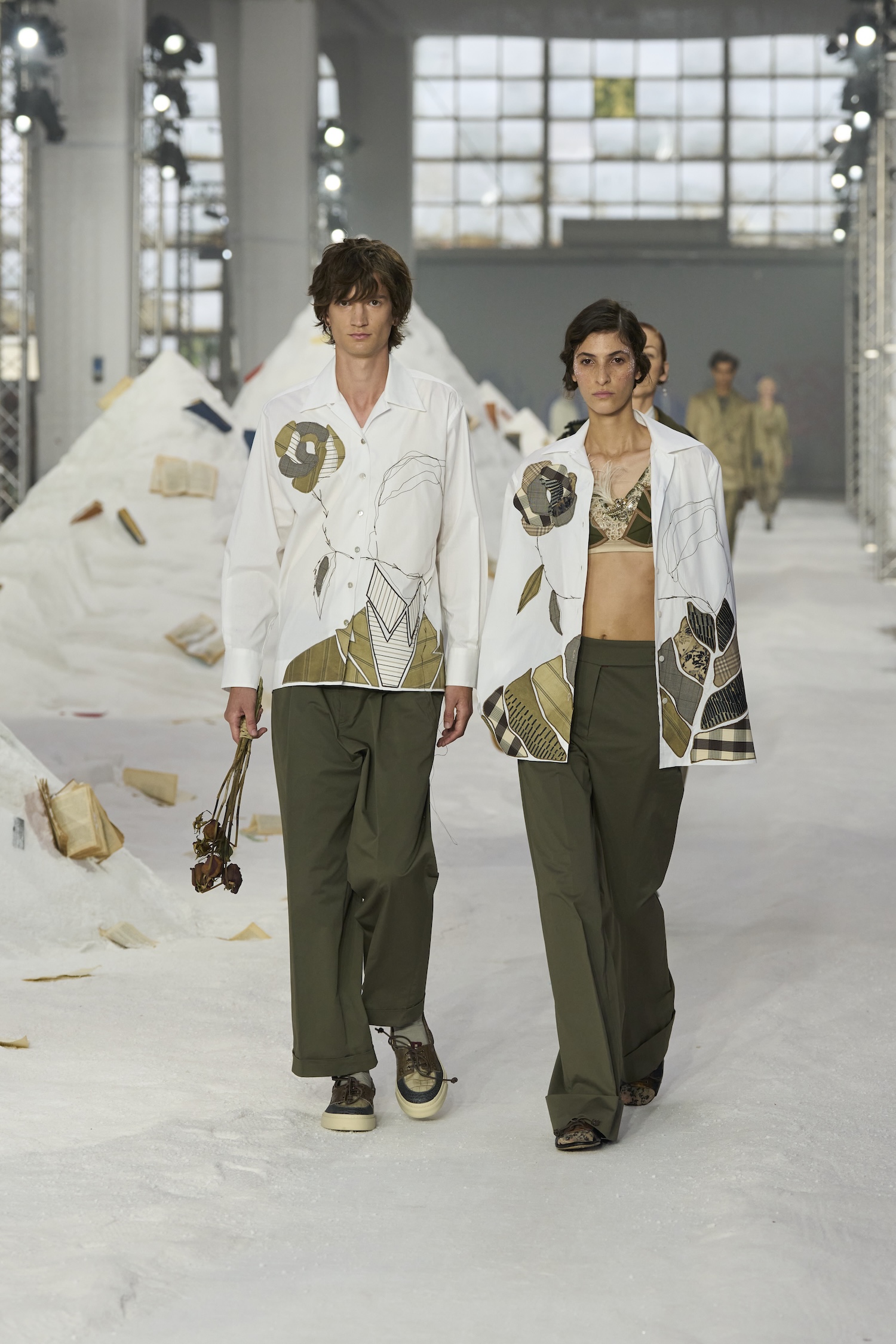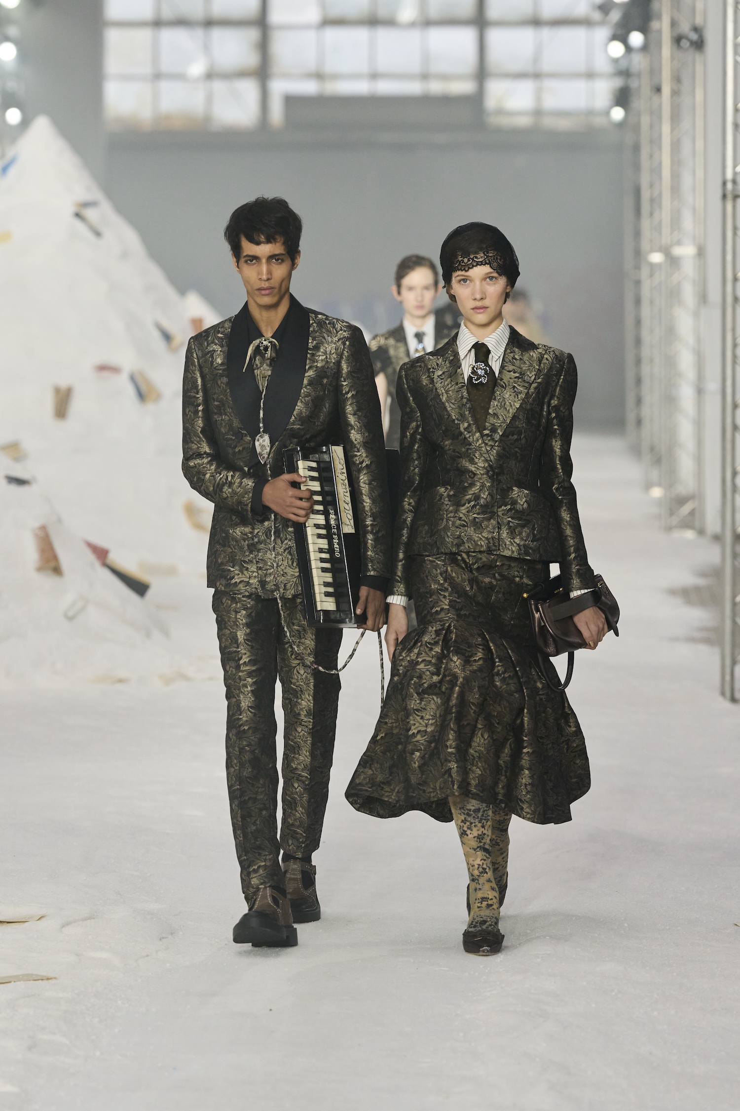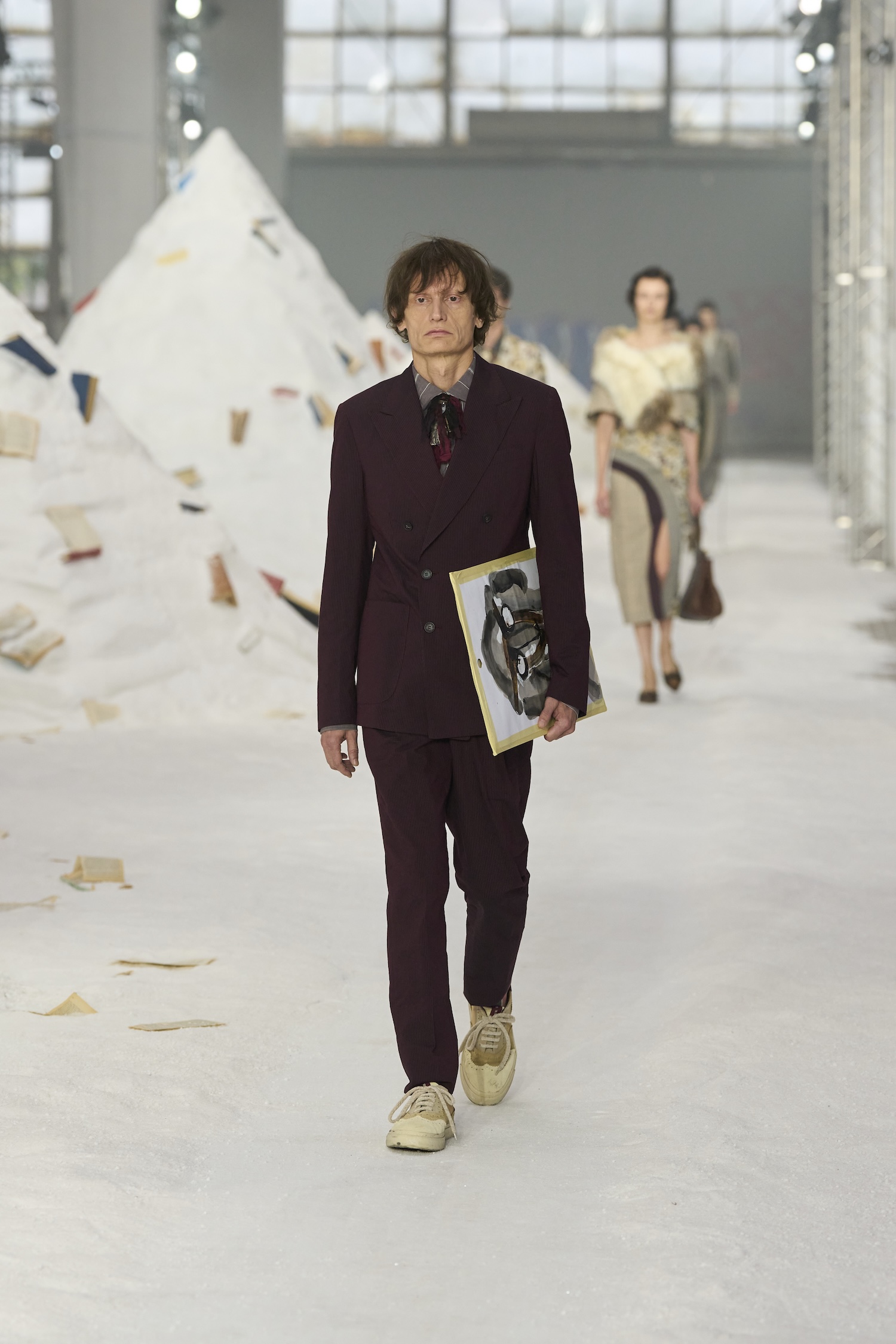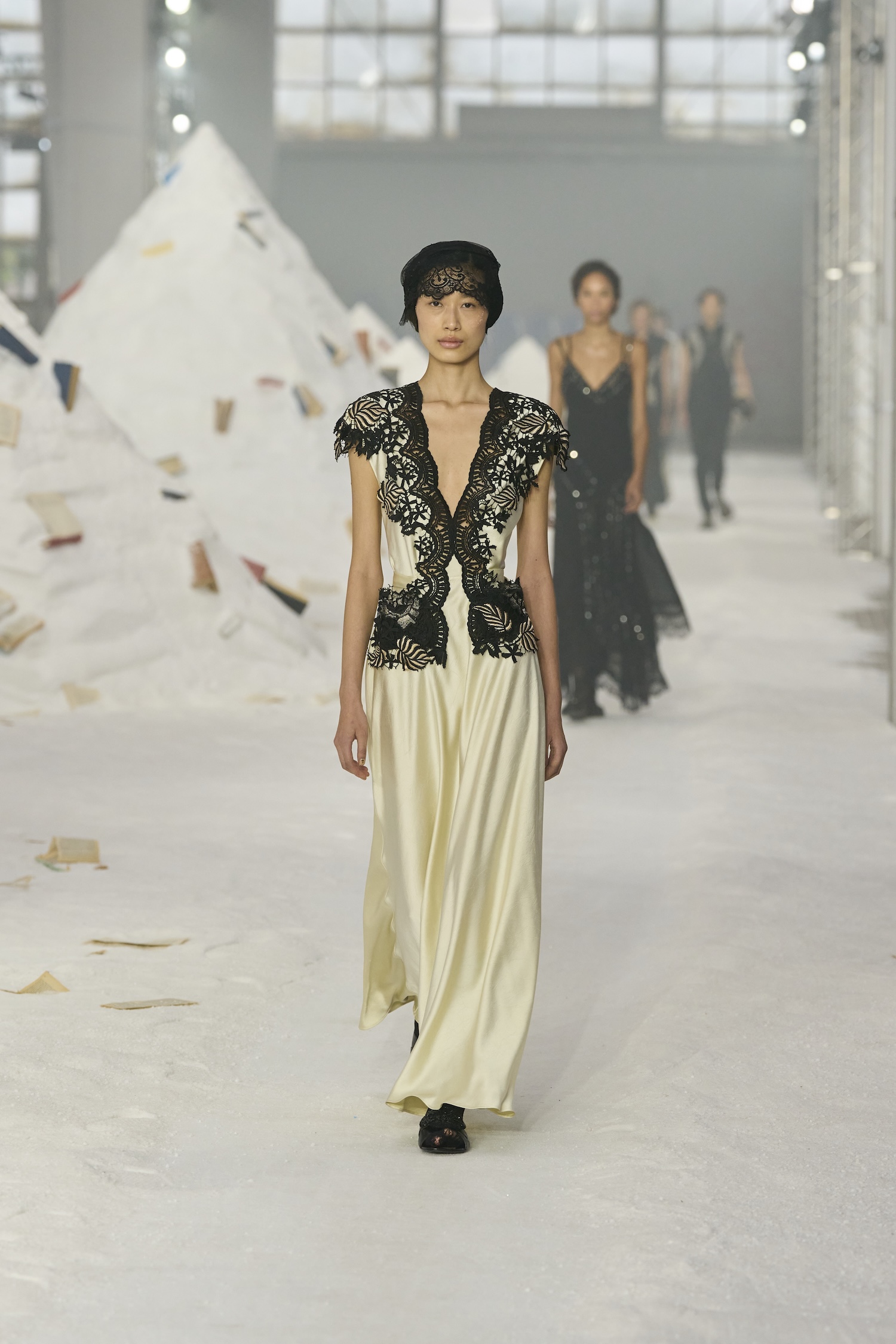 Silhouettes refused singularity. Sweeping gowns swirled with ruffles and draping worthy of Gloria Swanson; men’s robes evoked Hercule Poirot’s composed elegance. Tailored suits brushed against cocktail dresses, pyjama sets slipped into eveningwear. Knitwear mimicked embroidery, leather disrupted lace, and hand-embroidered pieces blurred like watercolours – just like the dozens of sketches pictured in the show notes. Men and women wore the same fabrics, reinterpreted in divergent ways and collapsing the rules of gendered dressing – which is at the heart of Marras’ vision.