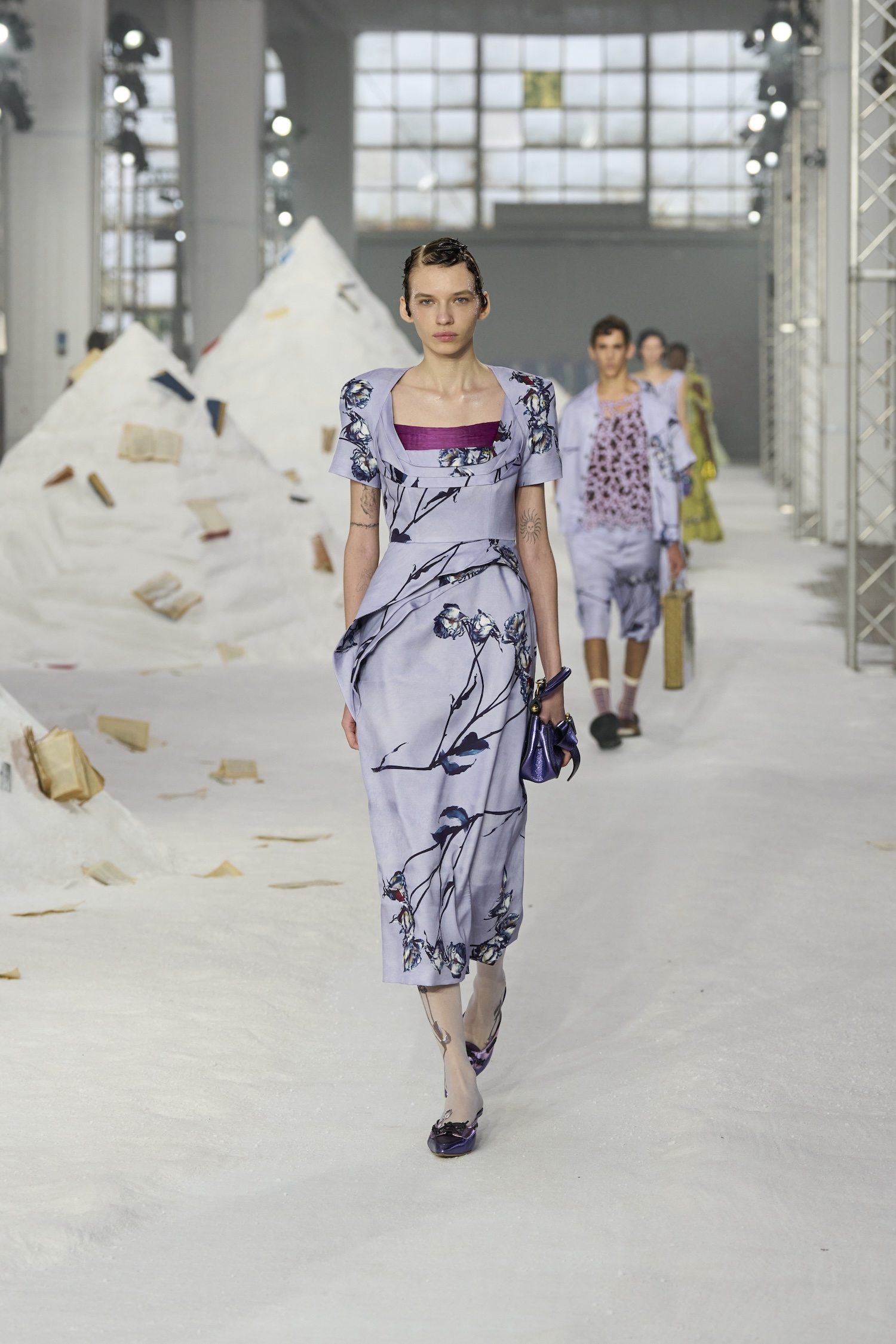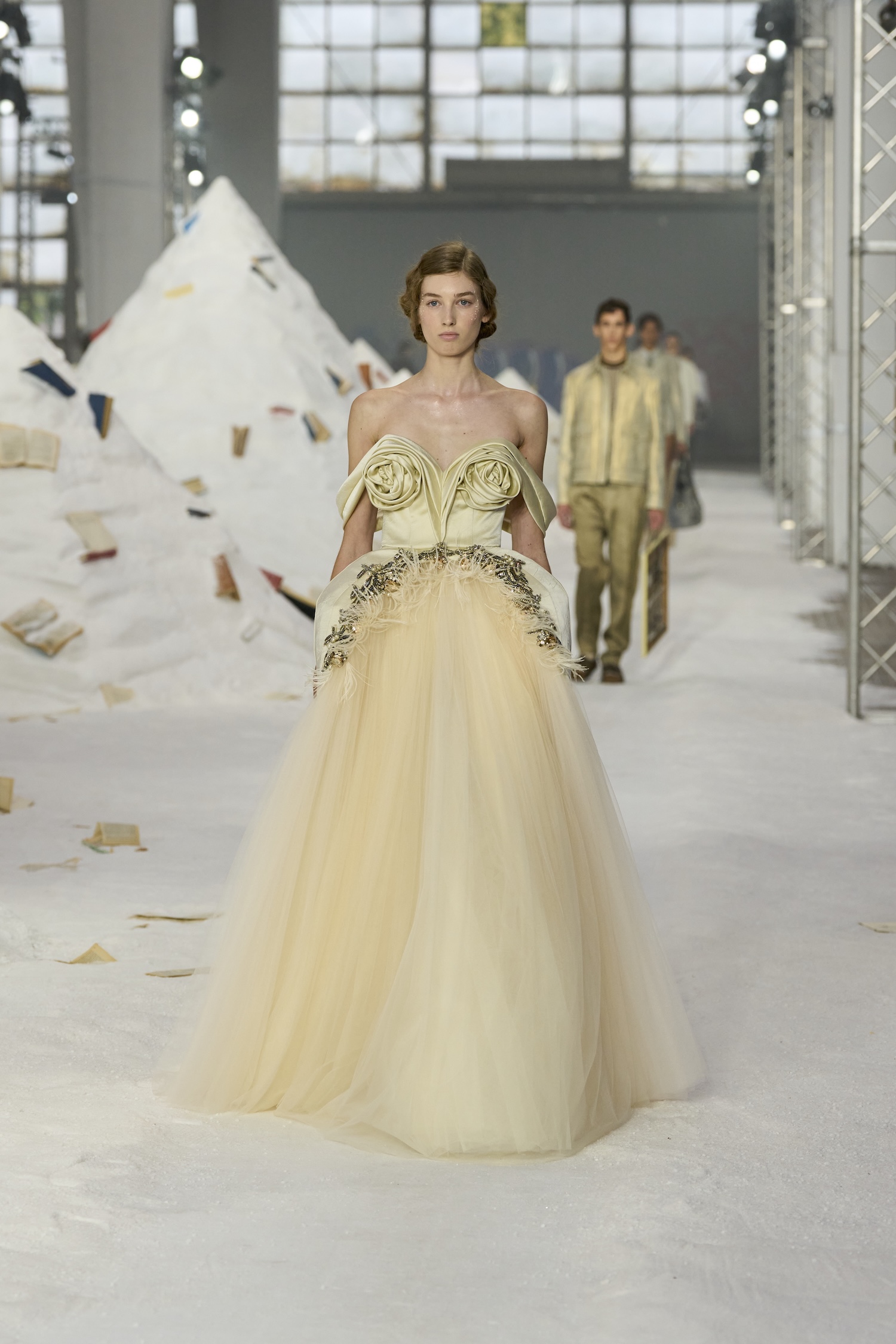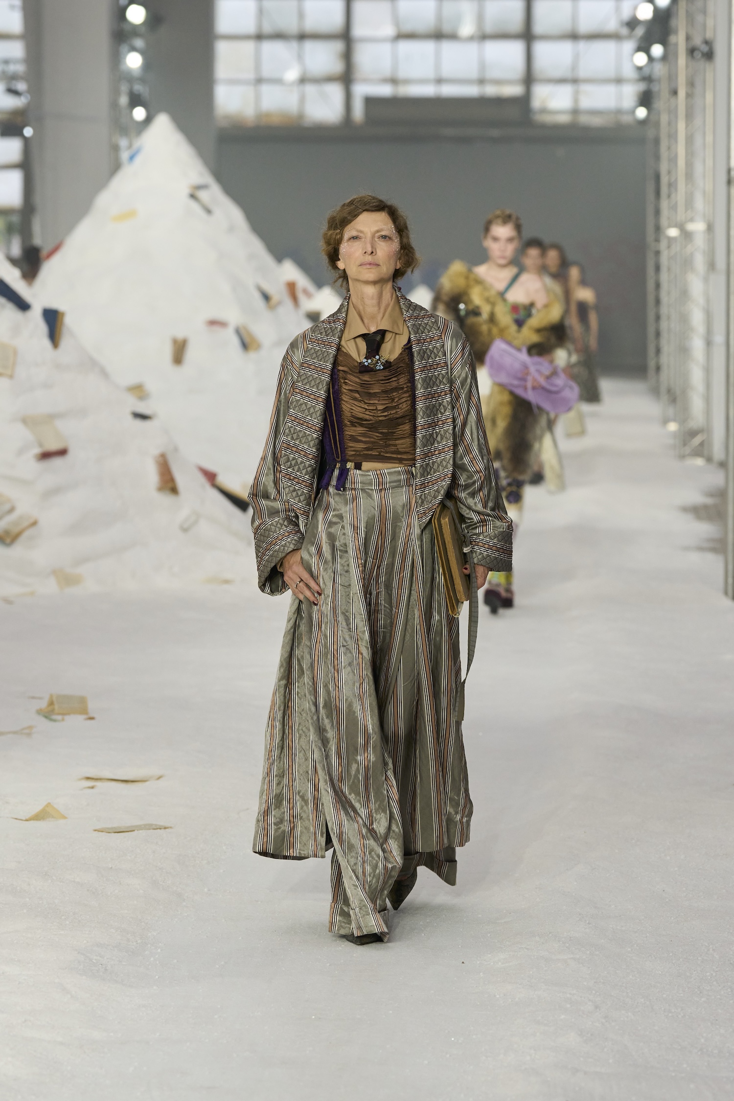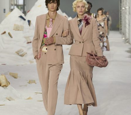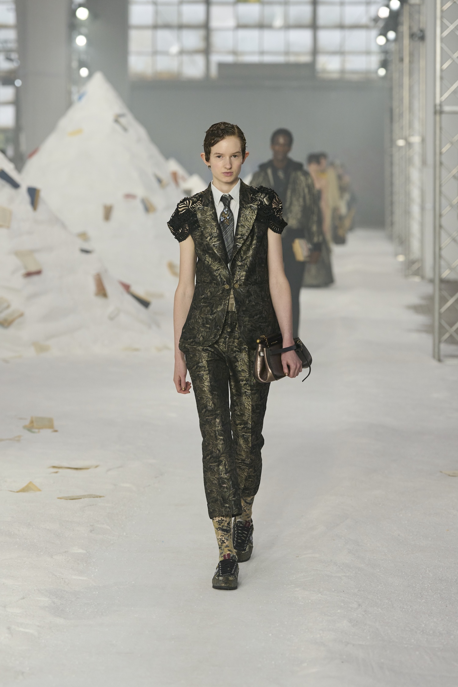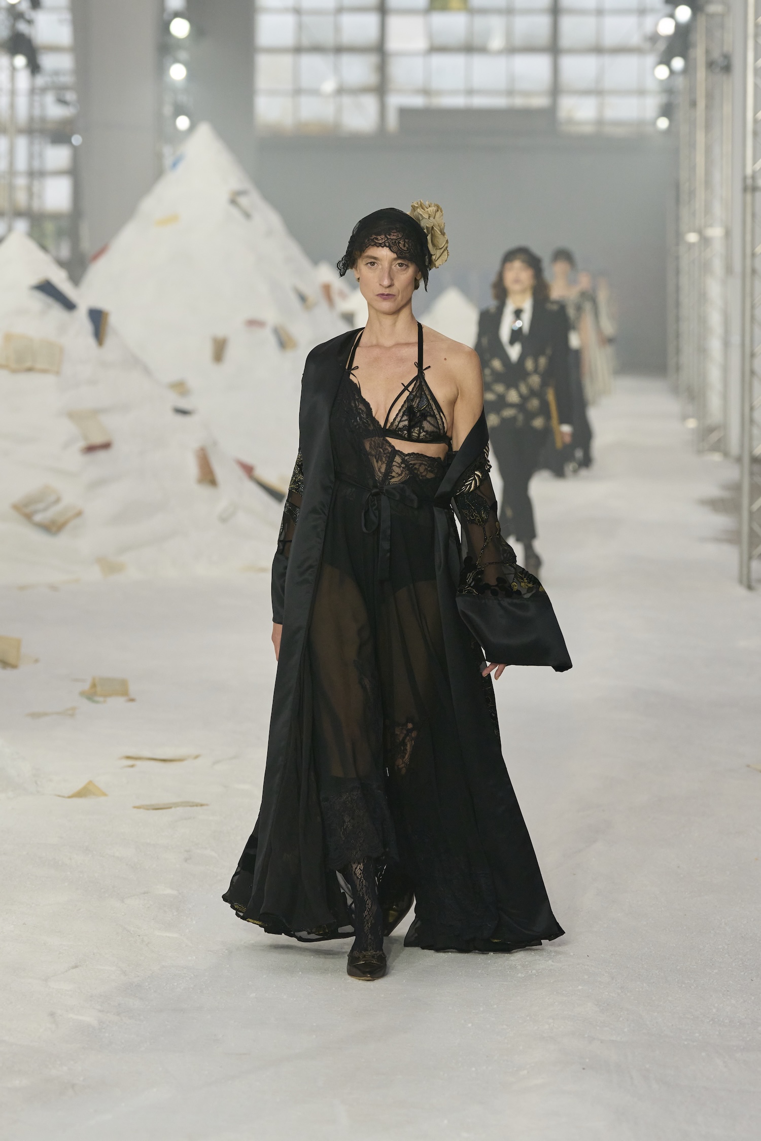 Silhouettes refused singularity. Sweeping gowns swirled with ruffles and draping worthy of Gloria Swanson; men’s robes evoked Hercule Poirot’s composed elegance. Tailored suits brushed against cocktail dresses, pyjama sets slipped into eveningwear. Knitwear mimicked embroidery, leather disrupted lace, and hand-embroidered pieces blurred like watercolours – just like the dozens of sketches pictured in the show notes. Men and women wore the same fabrics, reinterpreted in divergent ways and collapsing the rules of gendered dressing – which is at the heart of Marras’ vision.