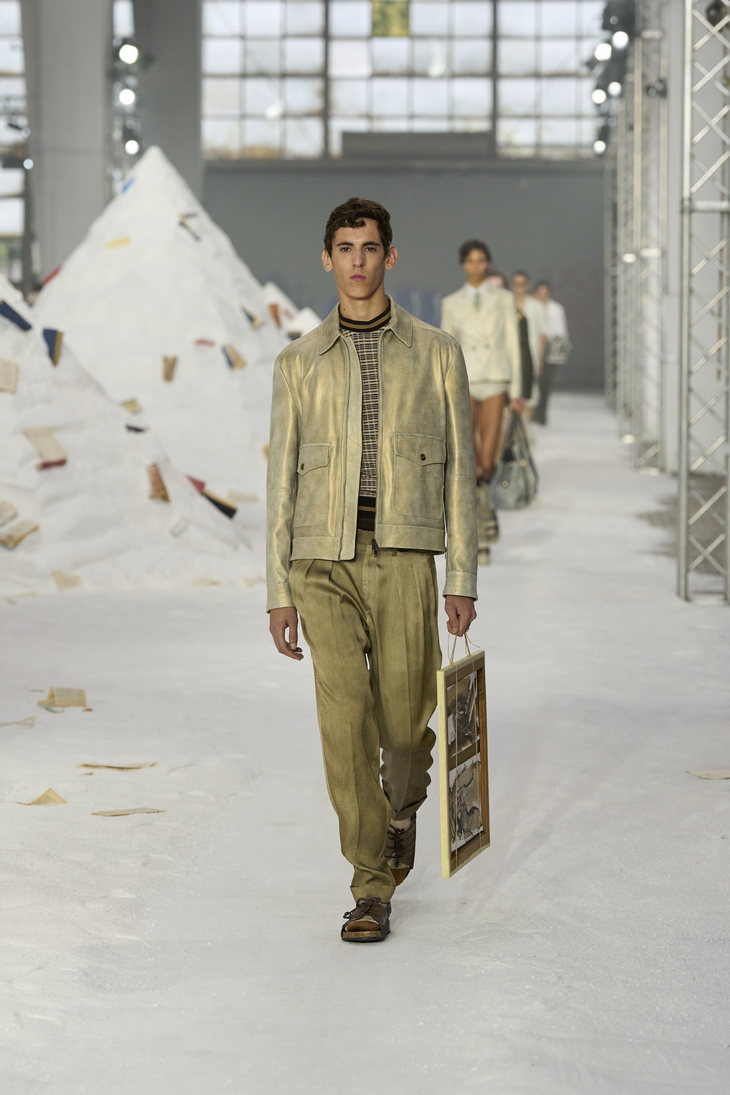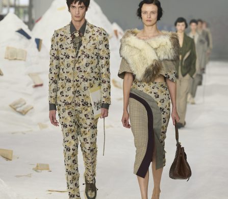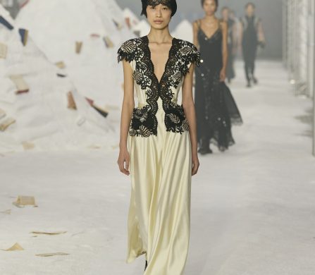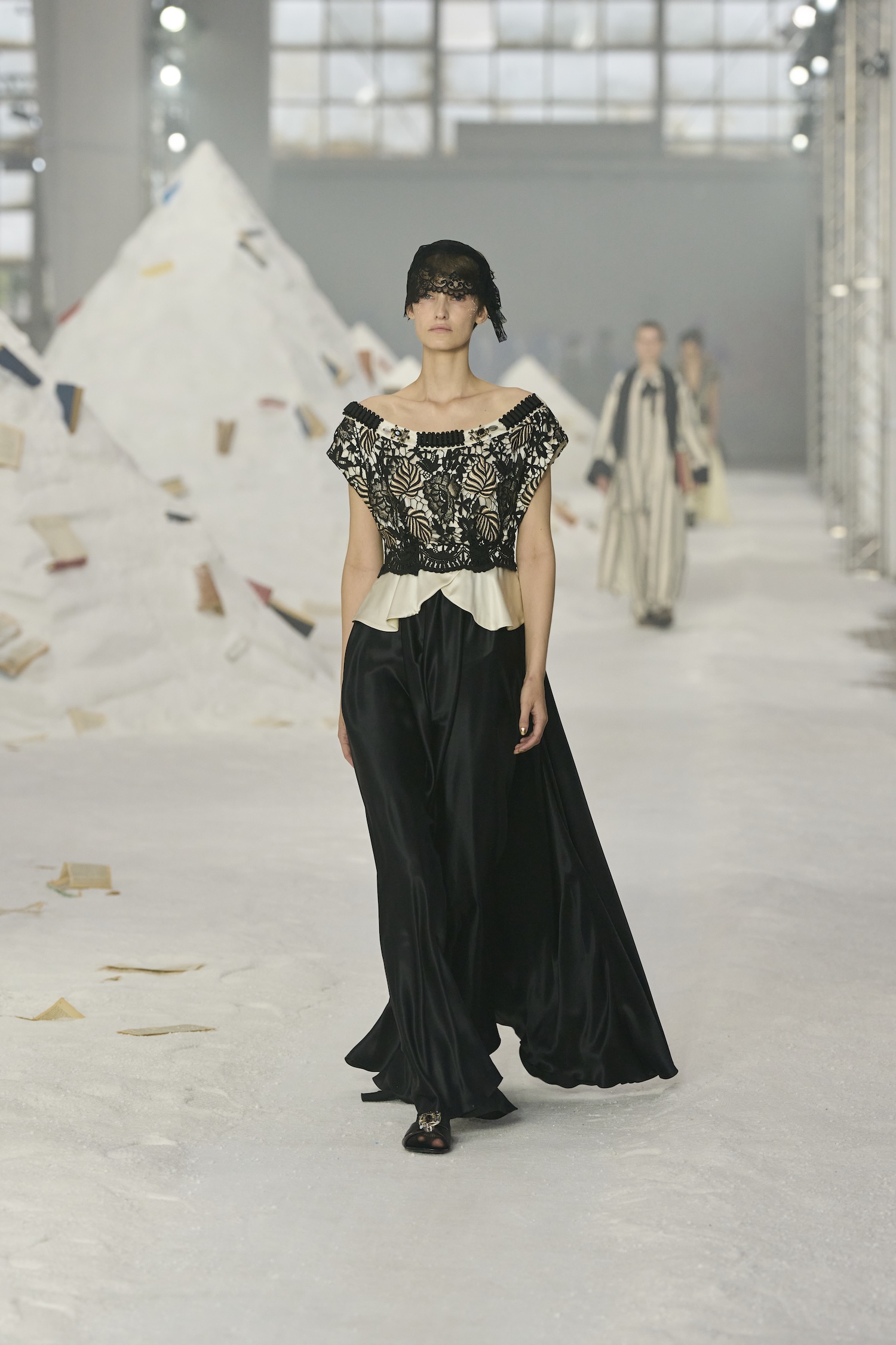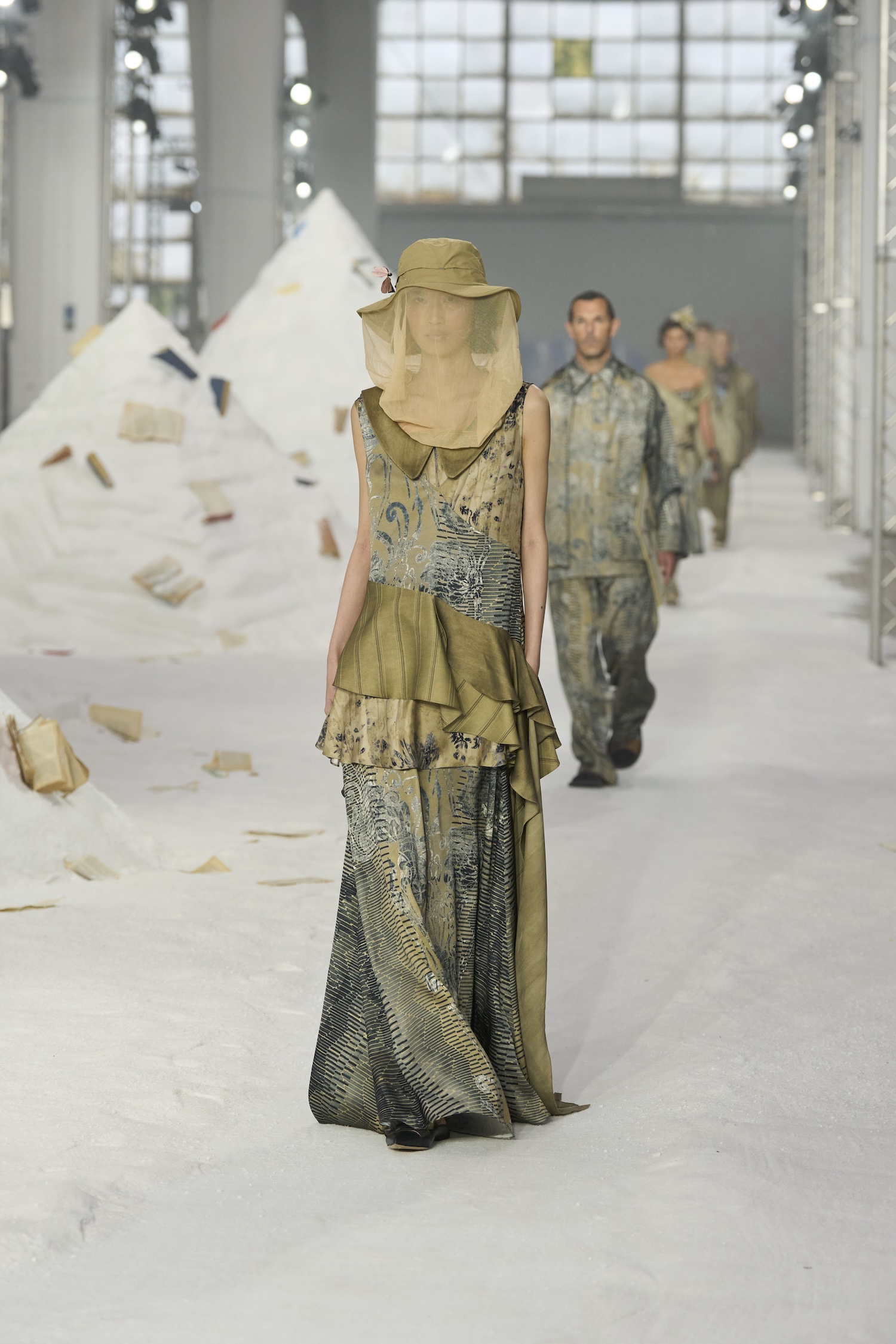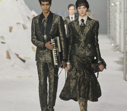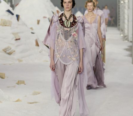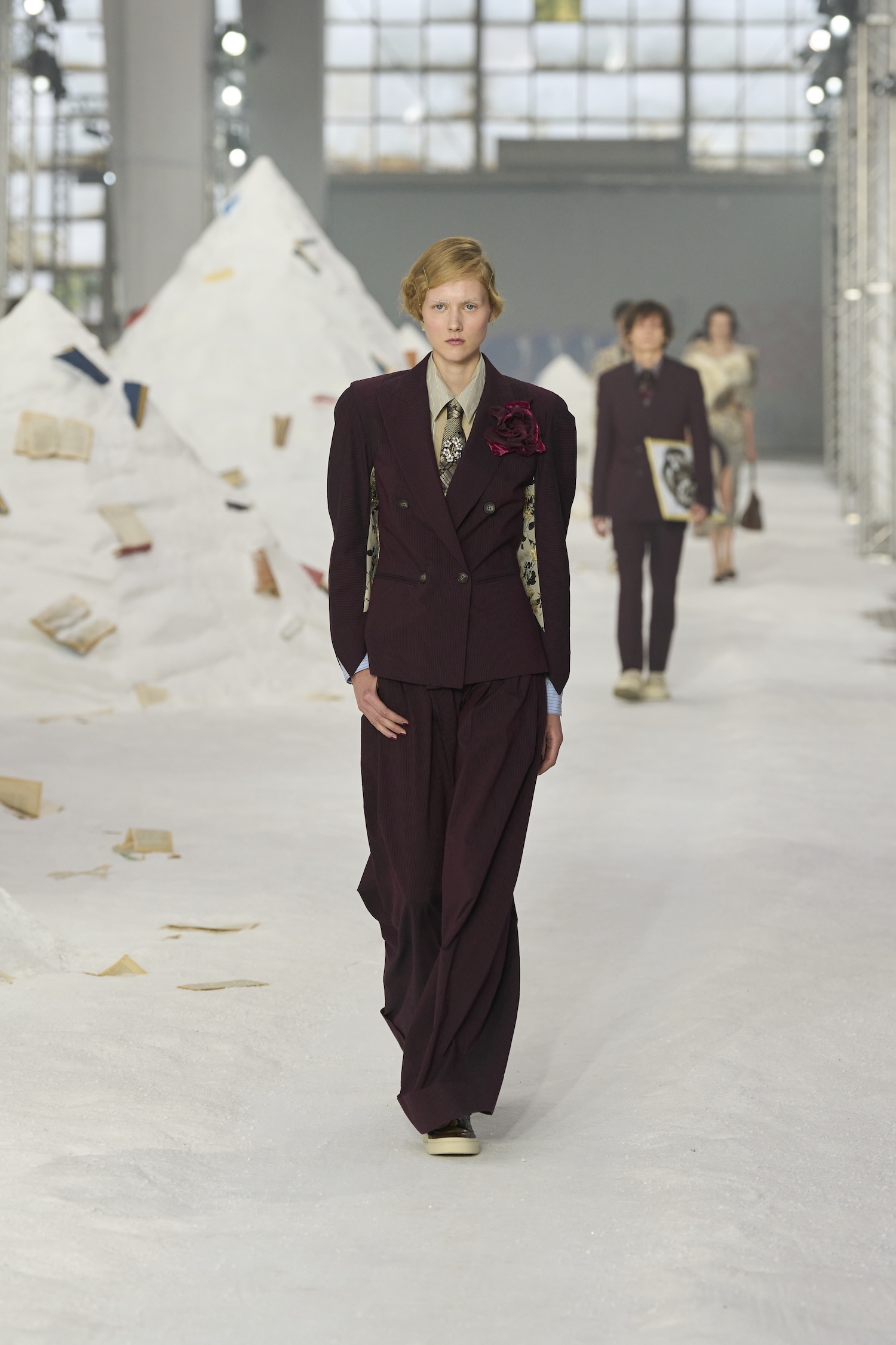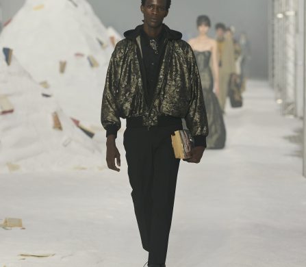 Silhouettes refused singularity. Sweeping gowns swirled with ruffles and draping worthy of Gloria Swanson; men’s robes evoked Hercule Poirot’s composed elegance. Tailored suits brushed against cocktail dresses, pyjama sets slipped into eveningwear. Knitwear mimicked embroidery, leather disrupted lace, and hand-embroidered pieces blurred like watercolours – just like the dozens of sketches pictured in the show notes. Men and women wore the same fabrics, reinterpreted in divergent ways and collapsing the rules of gendered dressing – which is at the heart of Marras’ vision.
