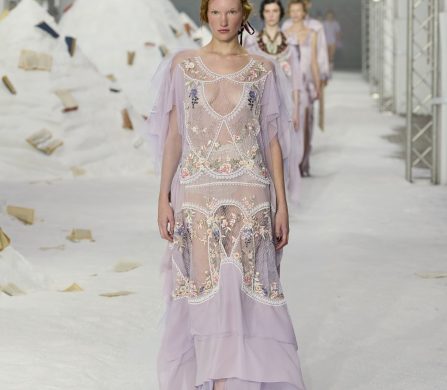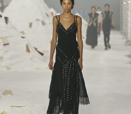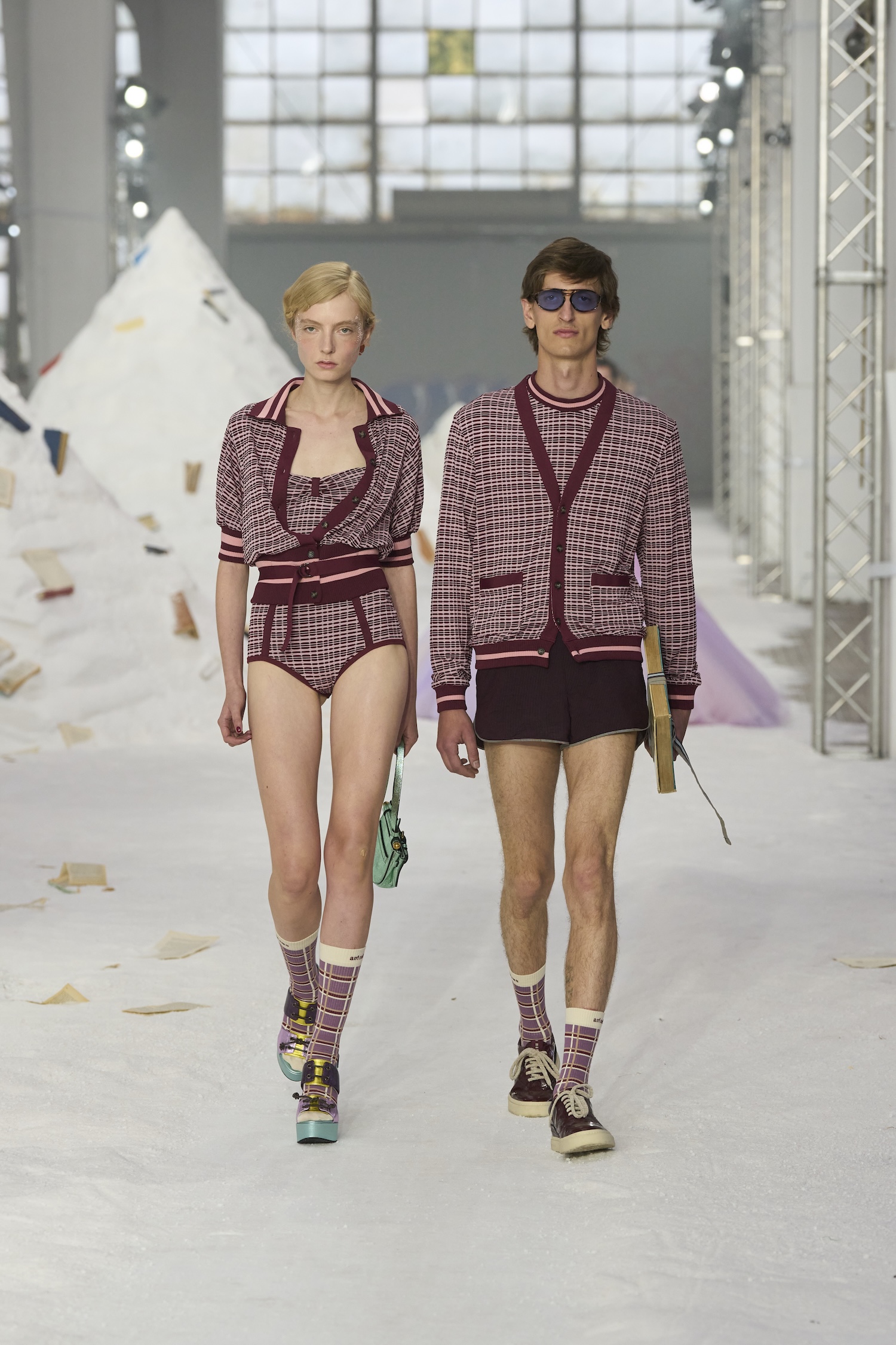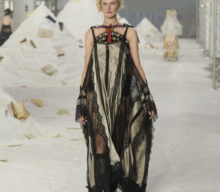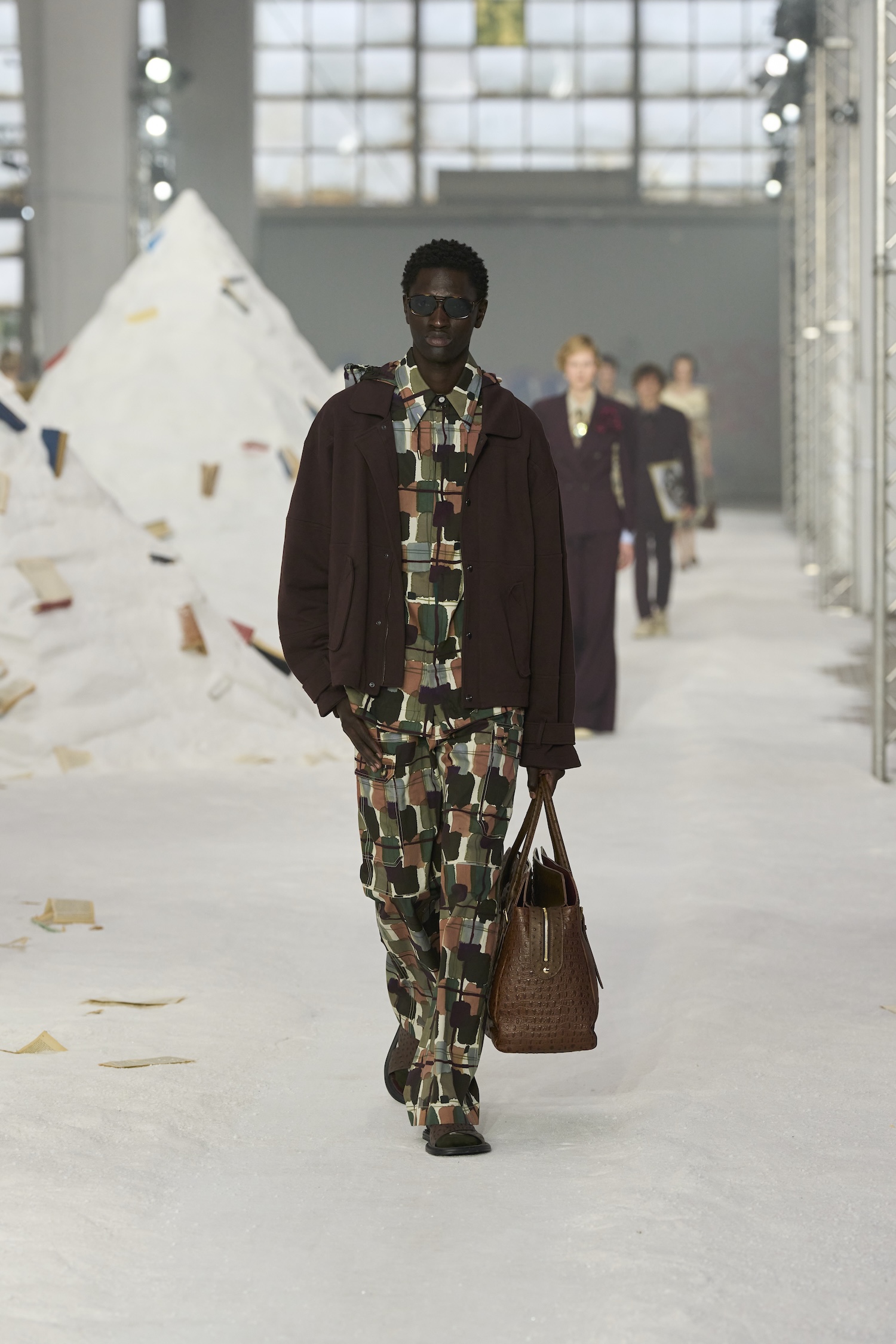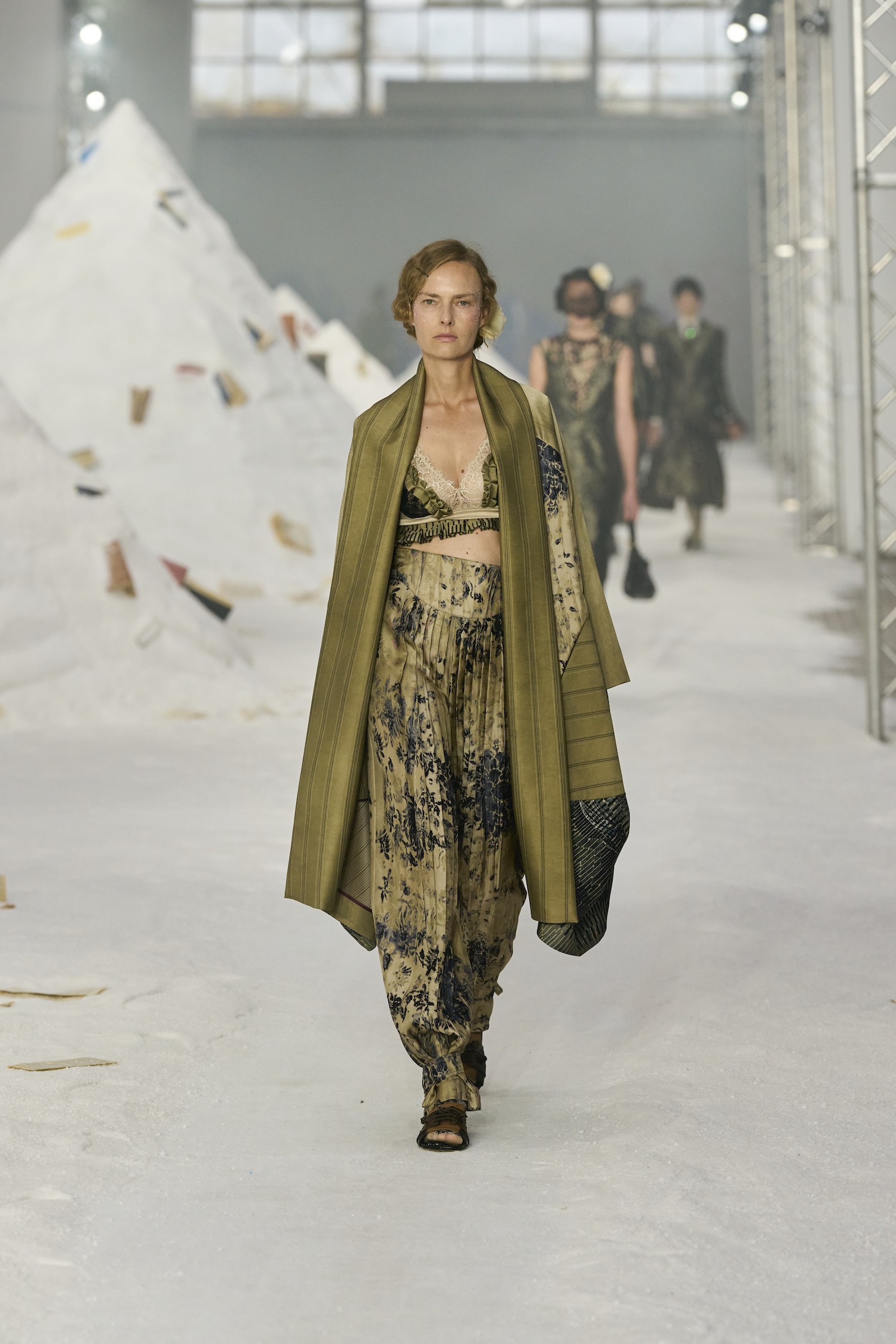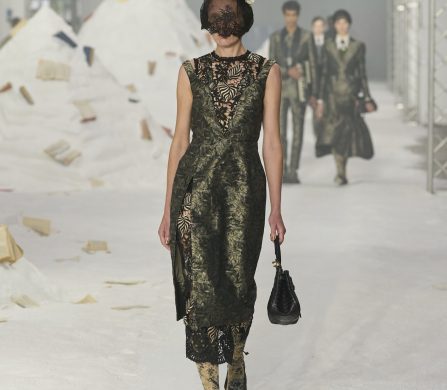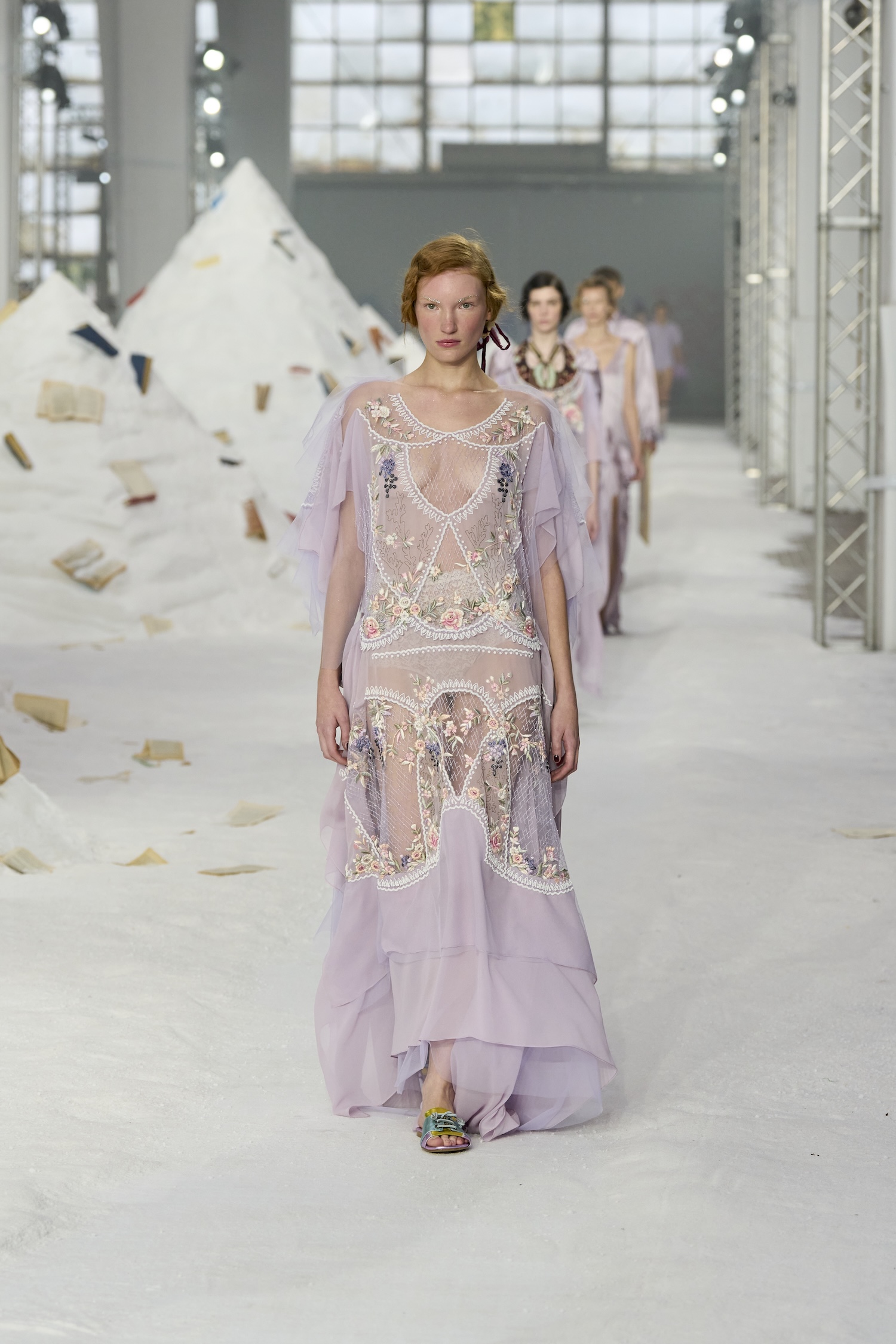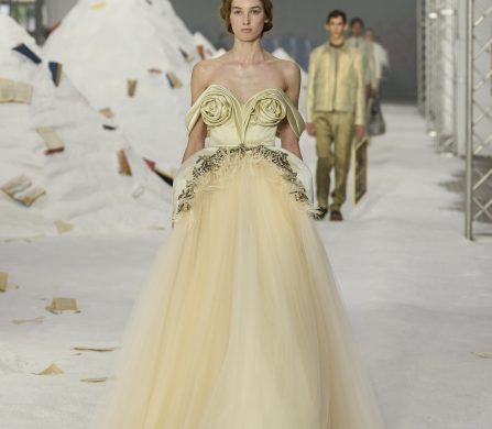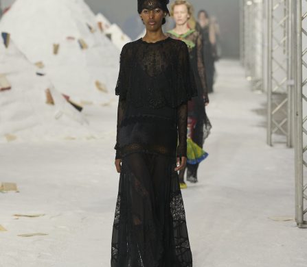 Silhouettes refused singularity. Sweeping gowns swirled with ruffles and draping worthy of Gloria Swanson; men’s robes evoked Hercule Poirot’s composed elegance. Tailored suits brushed against cocktail dresses, pyjama sets slipped into eveningwear. Knitwear mimicked embroidery, leather disrupted lace, and hand-embroidered pieces blurred like watercolours – just like the dozens of sketches pictured in the show notes. Men and women wore the same fabrics, reinterpreted in divergent ways and collapsing the rules of gendered dressing – which is at the heart of Marras’ vision.