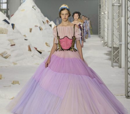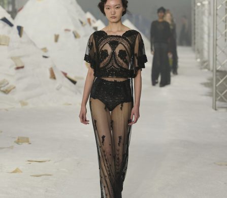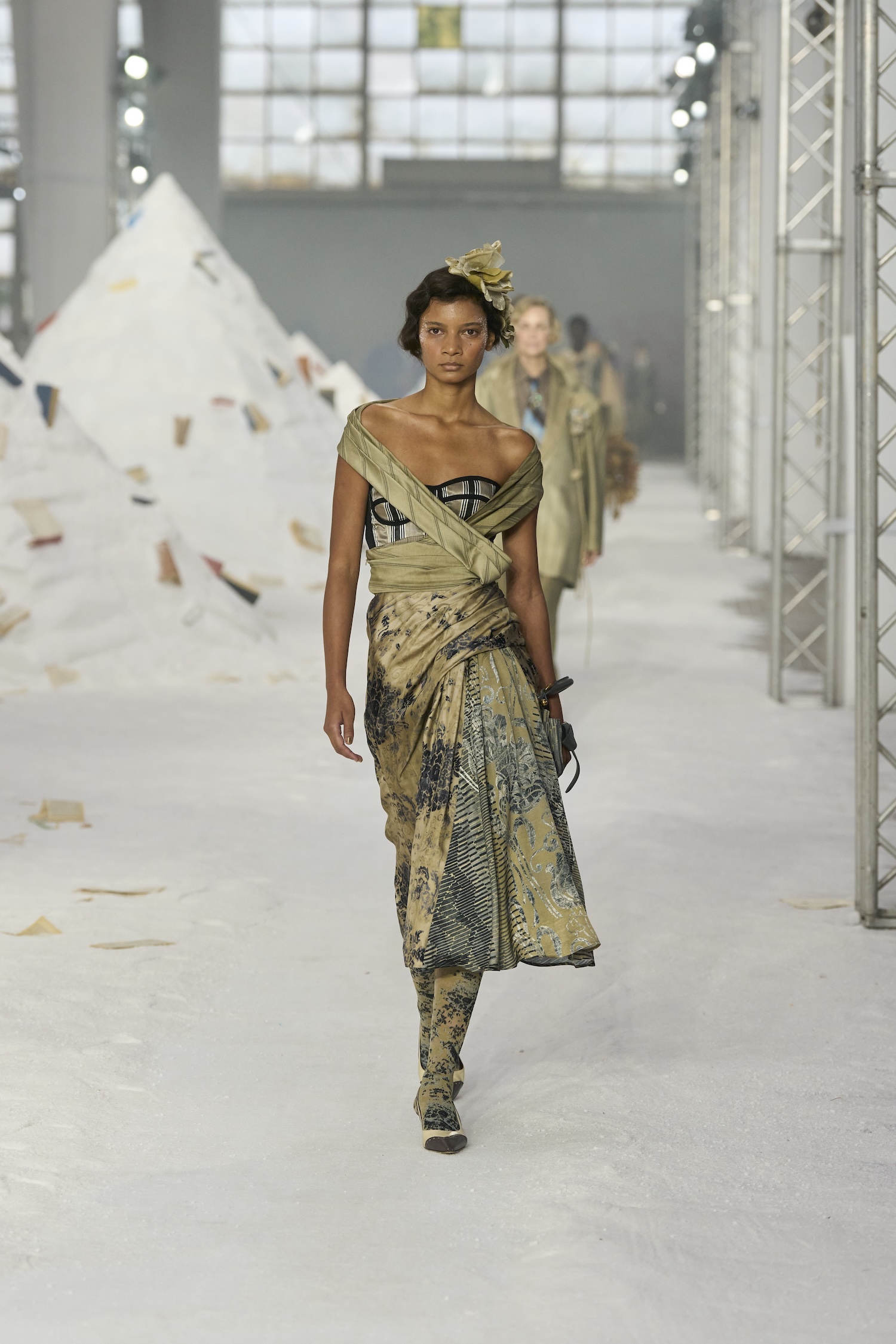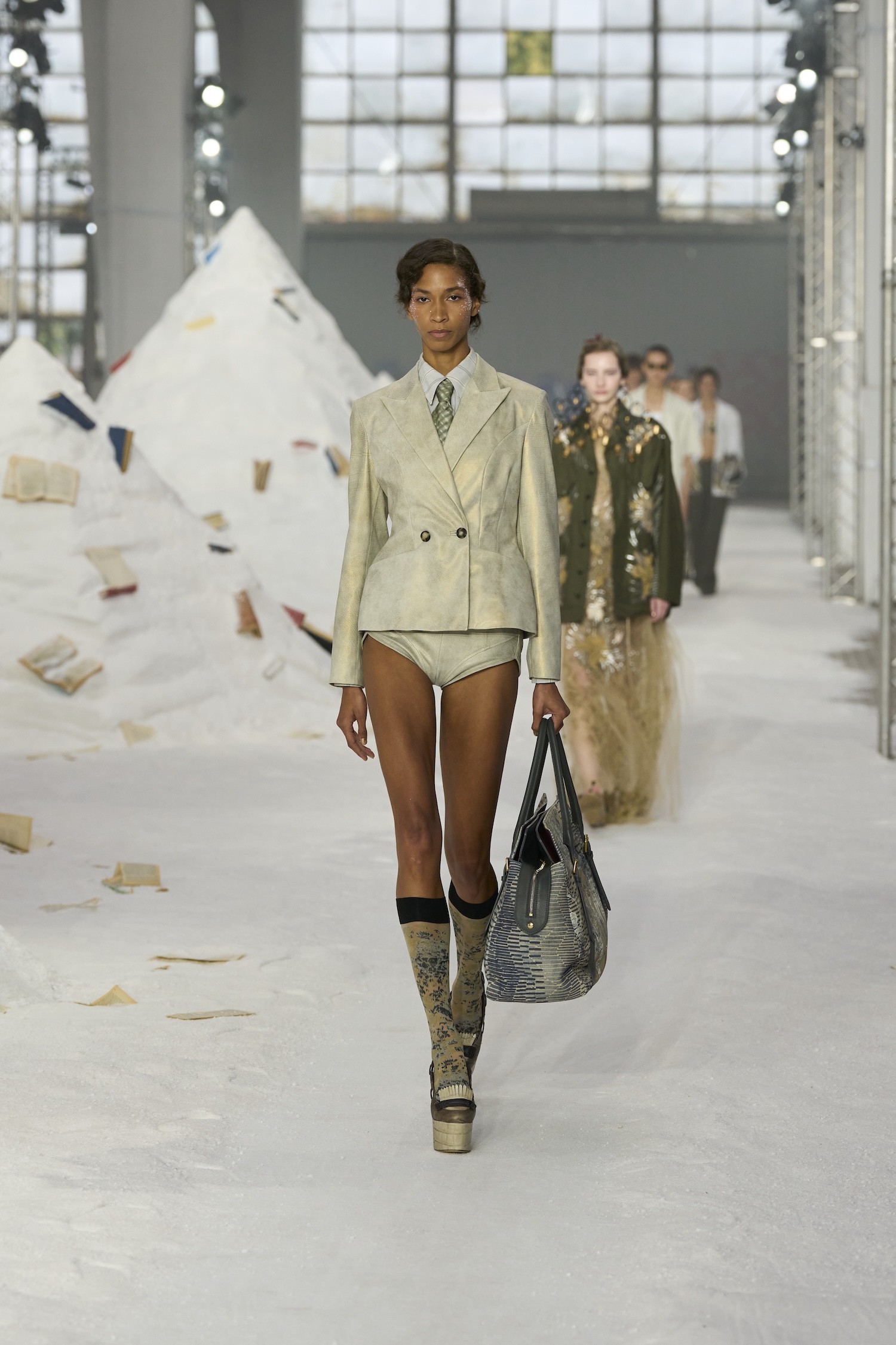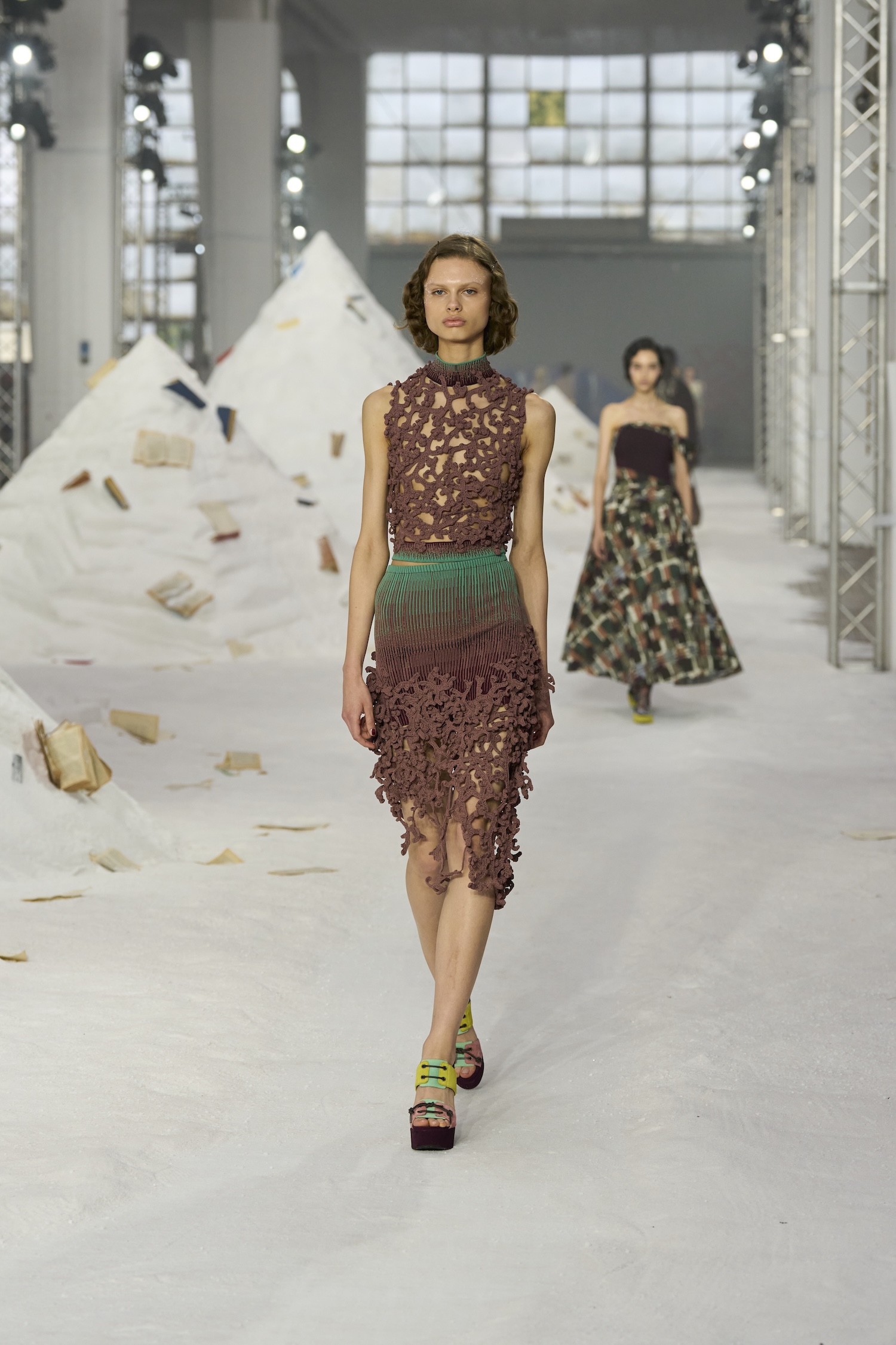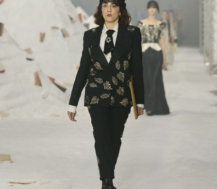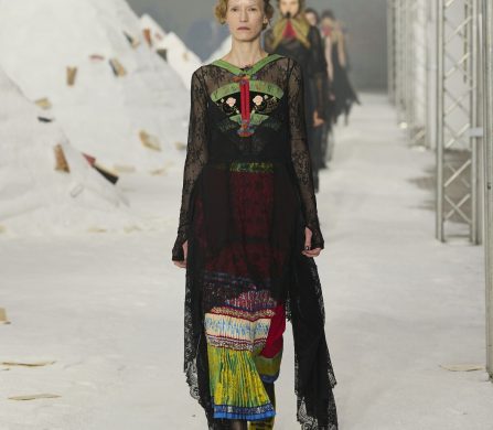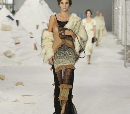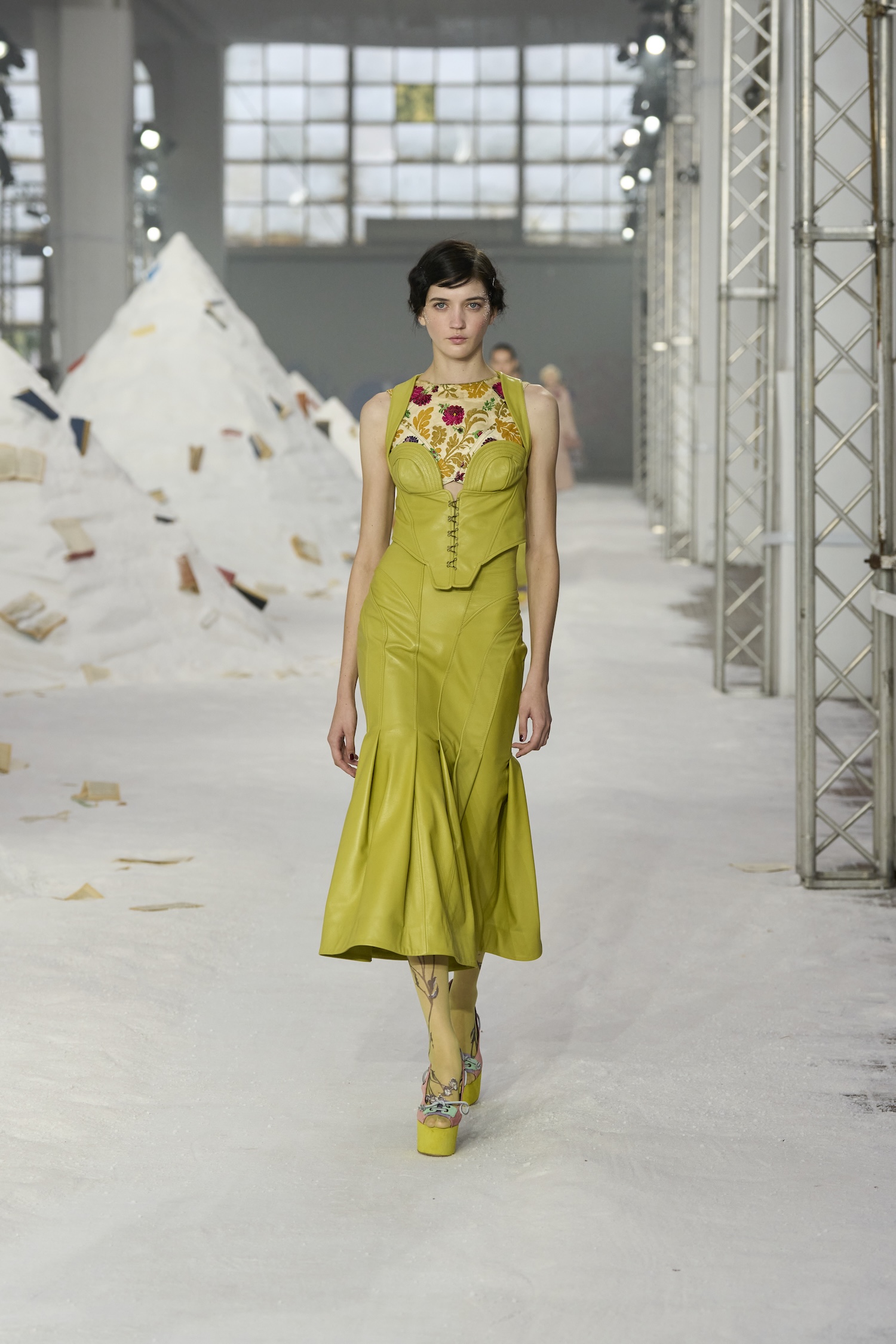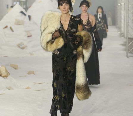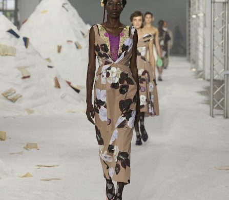 Silhouettes refused singularity. Sweeping gowns swirled with ruffles and draping worthy of Gloria Swanson; men’s robes evoked Hercule Poirot’s composed elegance. Tailored suits brushed against cocktail dresses, pyjama sets slipped into eveningwear. Knitwear mimicked embroidery, leather disrupted lace, and hand-embroidered pieces blurred like watercolours – just like the dozens of sketches pictured in the show notes. Men and women wore the same fabrics, reinterpreted in divergent ways and collapsing the rules of gendered dressing – which is at the heart of Marras’ vision.
