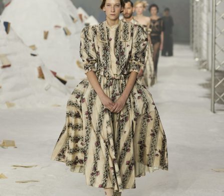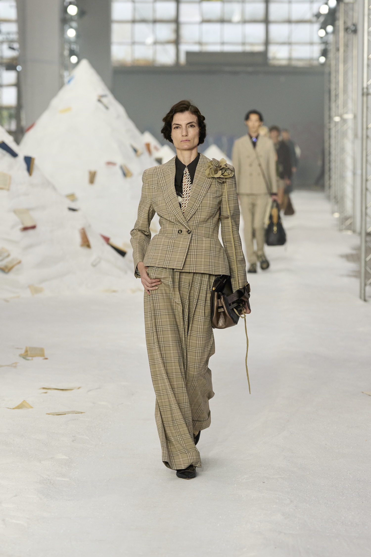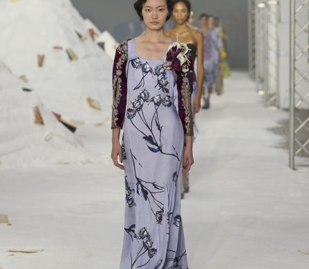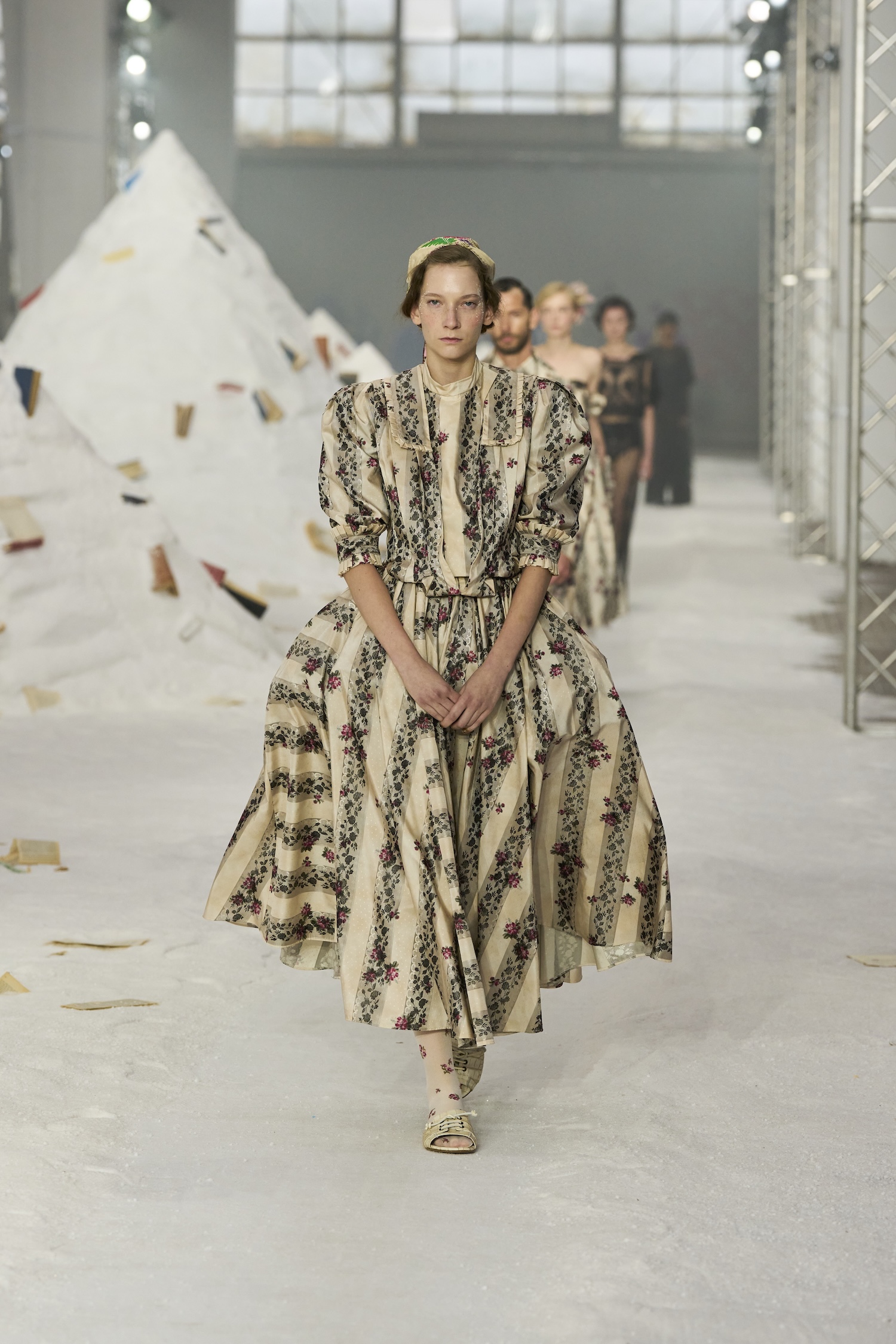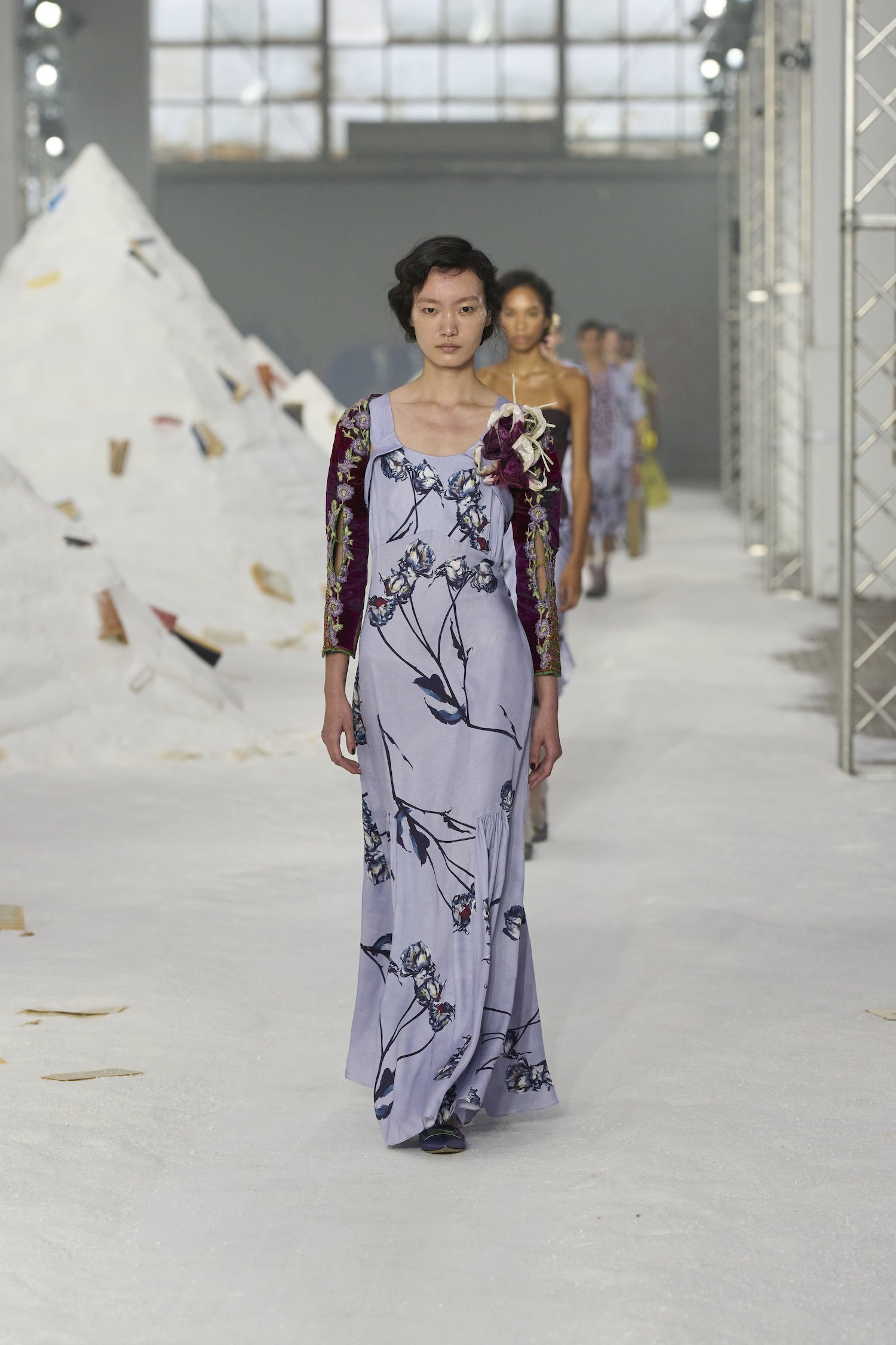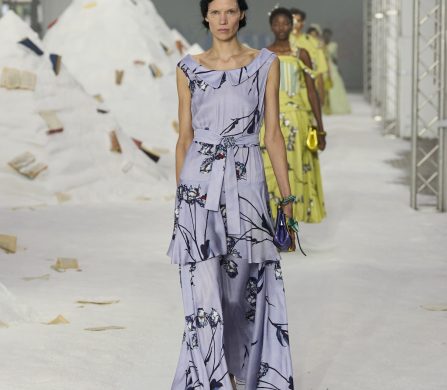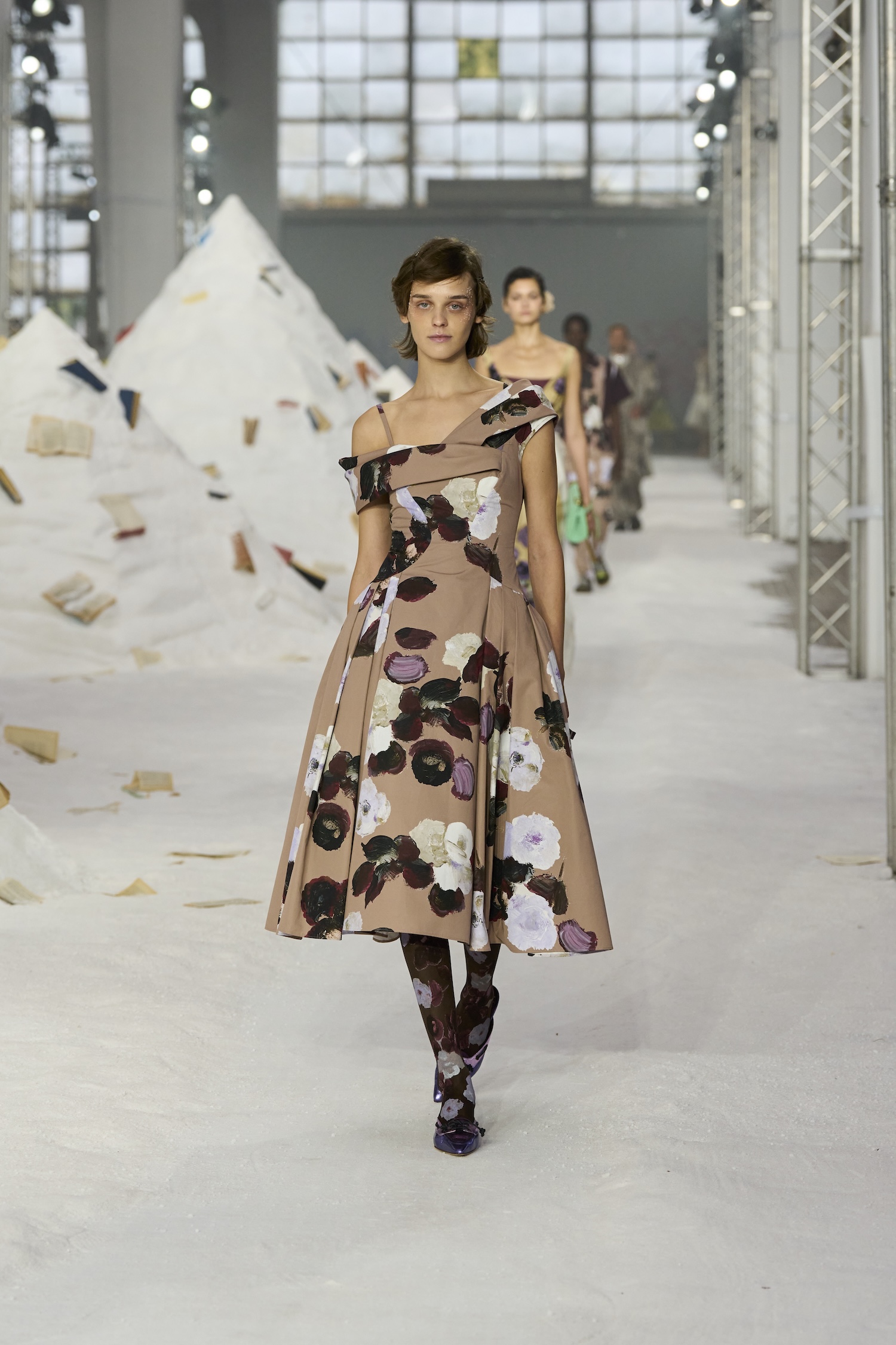 The clothes themselves told the story of arrivals and departures. Palettes drifted from whispering lilacs to cadmium shocks of pink, gold, violet, chocolate and plum, dusted with bronze, sand and copper, anchored by a faded black. Patterns married beautifully in contrasts: checks against stripes, jacquards beside damasks, polka dots colliding with pinstripes and chevrons. Flowers spilled everywhere – scattered, gathered, embroidered – sometimes like bouquets, sometimes like paint splashes.