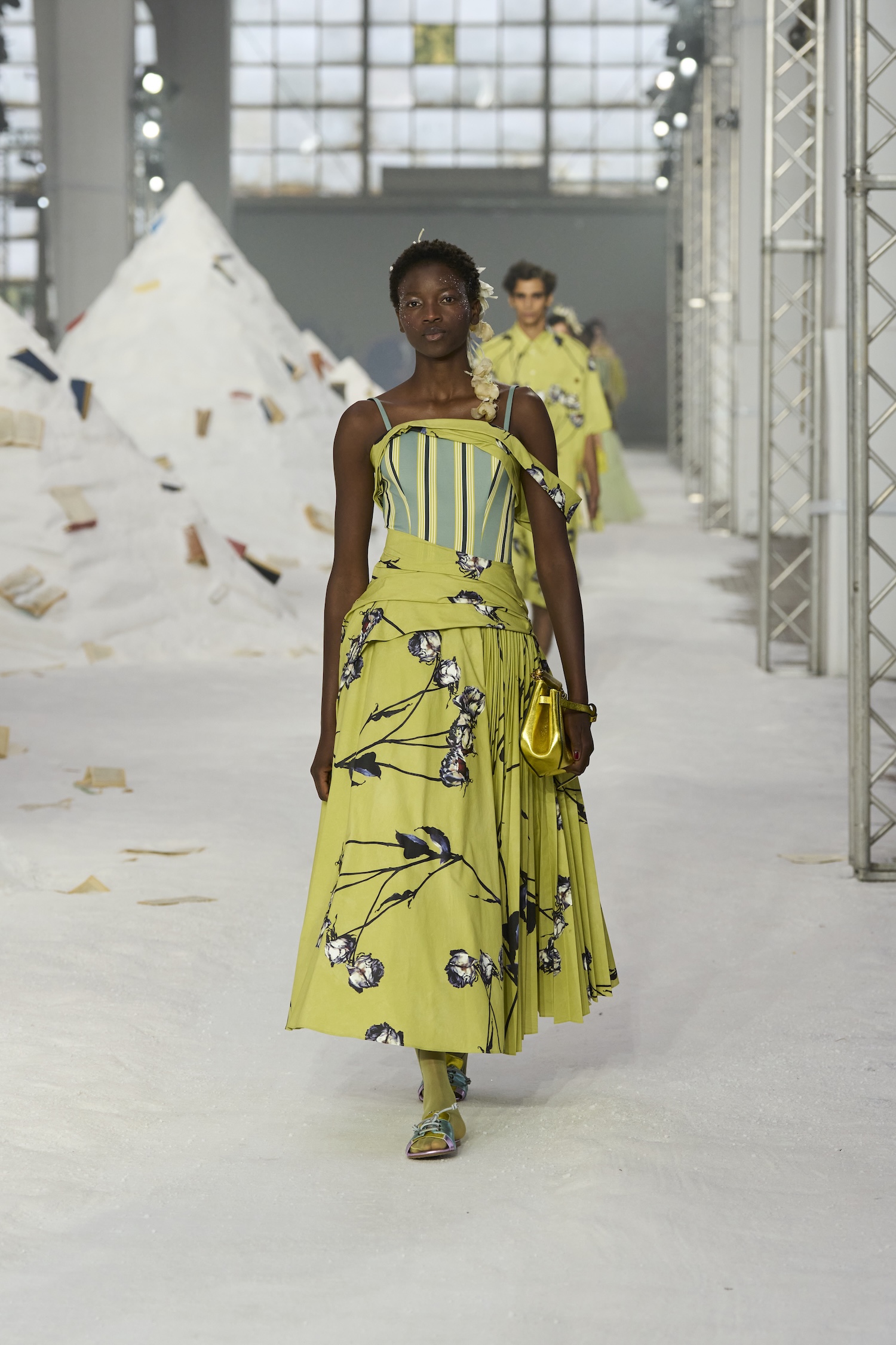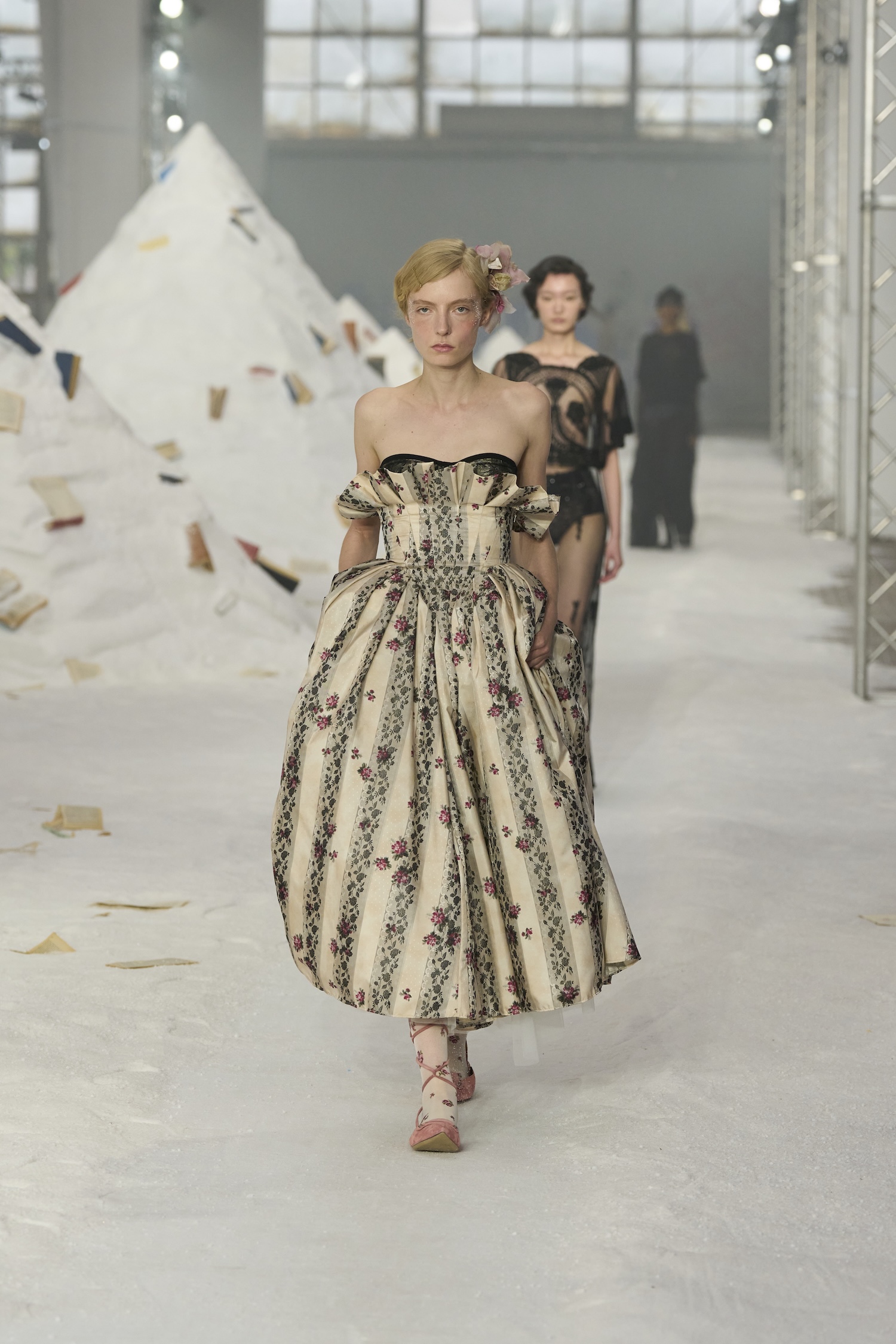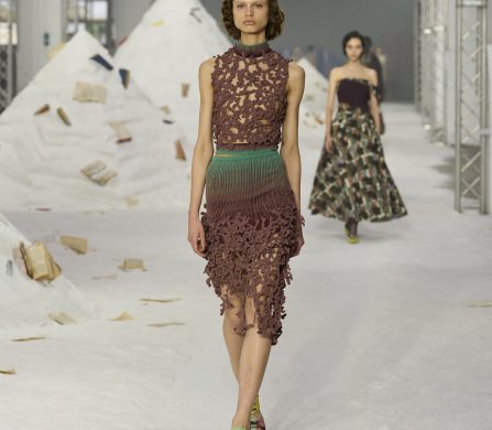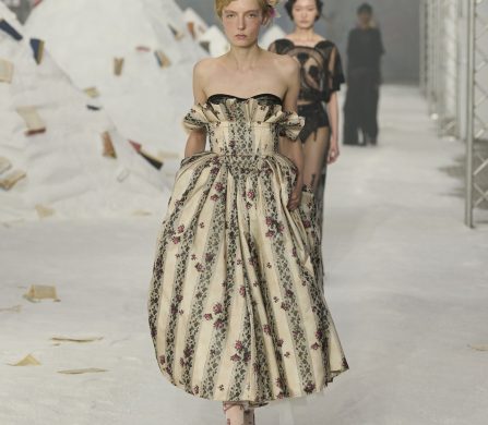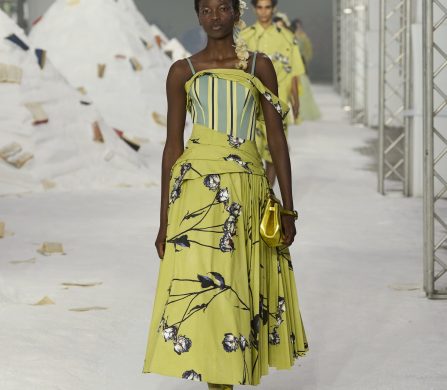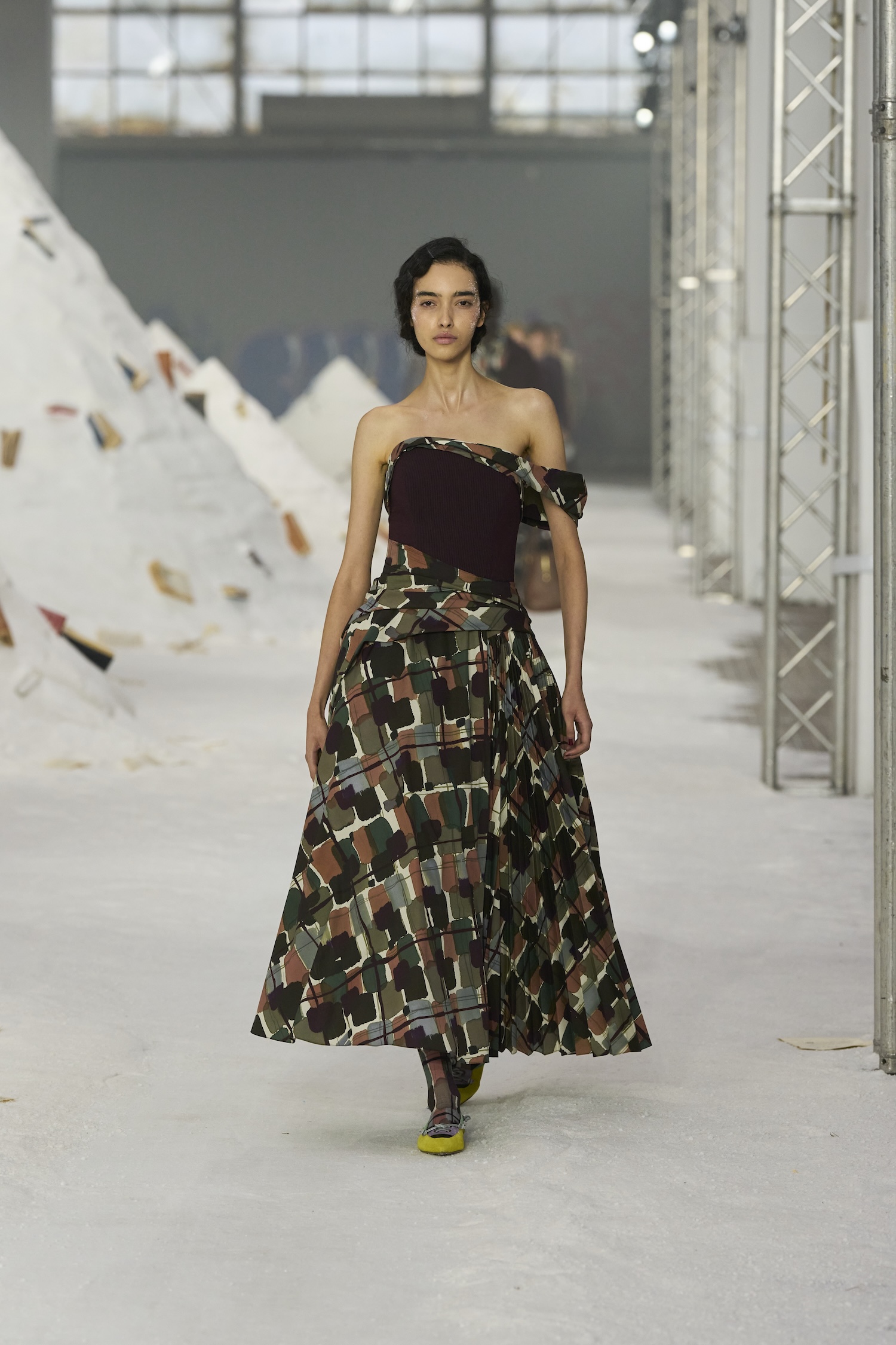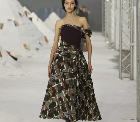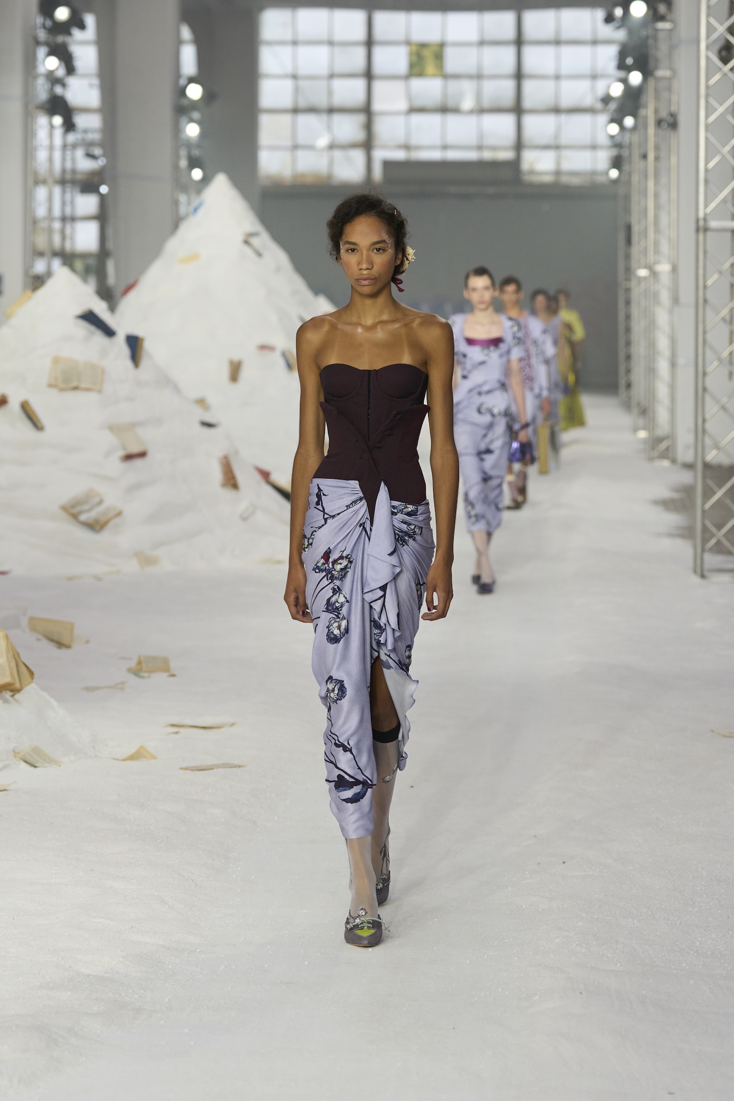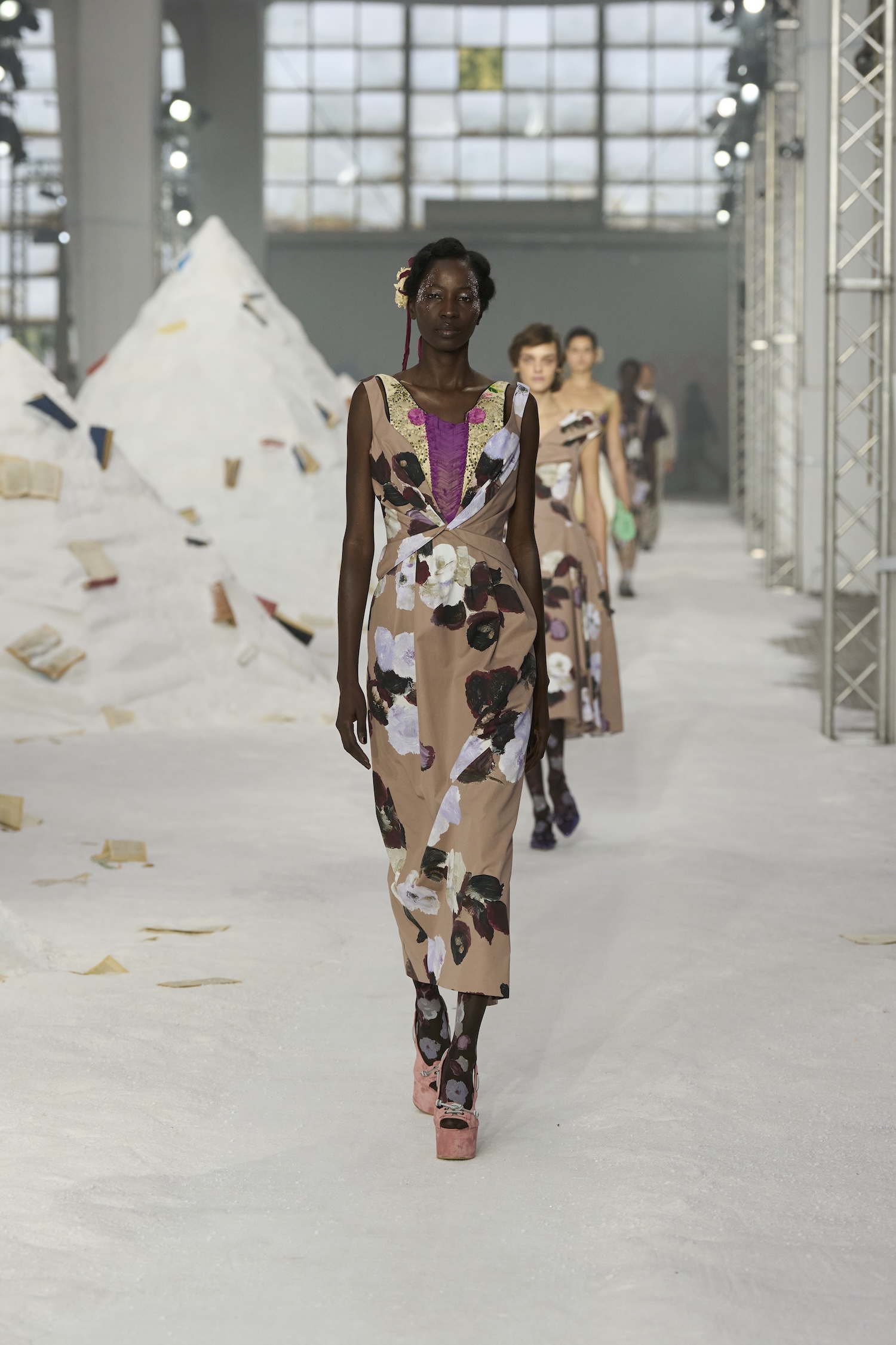 The clothes themselves told the story of arrivals and departures. Palettes drifted from whispering lilacs to cadmium shocks of pink, gold, violet, chocolate and plum, dusted with bronze, sand and copper, anchored by a faded black. Patterns married beautifully in contrasts: checks against stripes, jacquards beside damasks, polka dots colliding with pinstripes and chevrons. Flowers spilled everywhere – scattered, gathered, embroidered – sometimes like bouquets, sometimes like paint splashes.