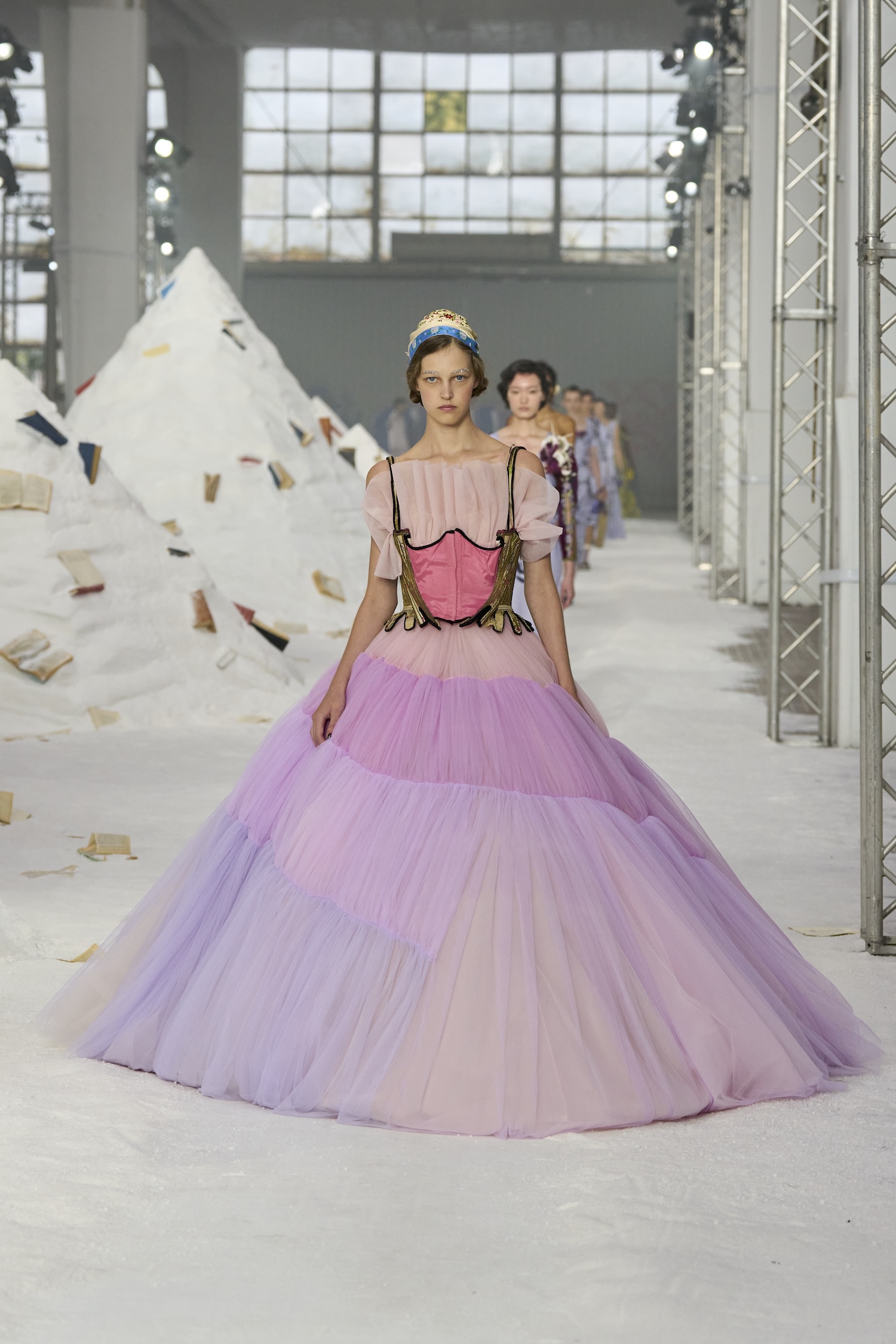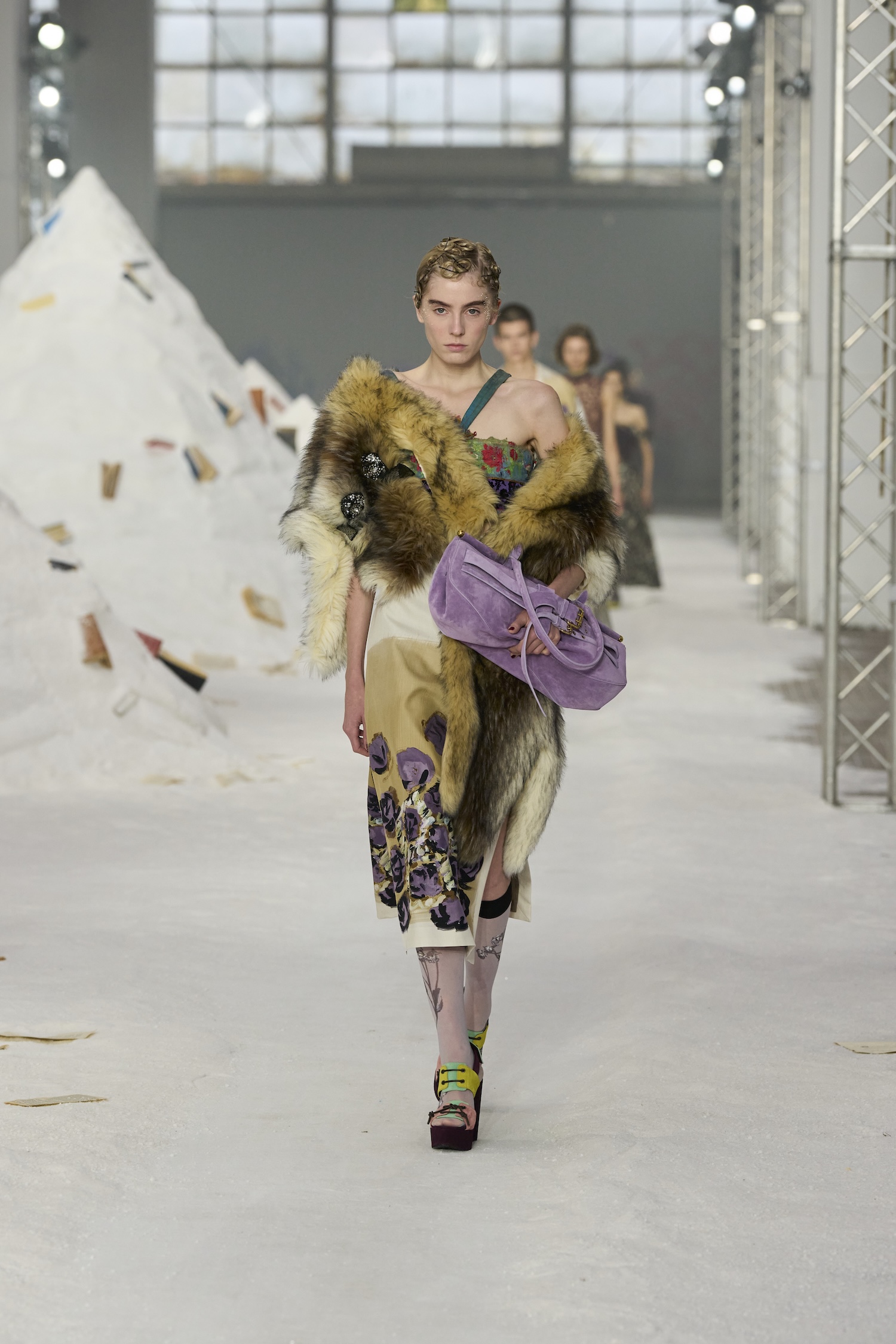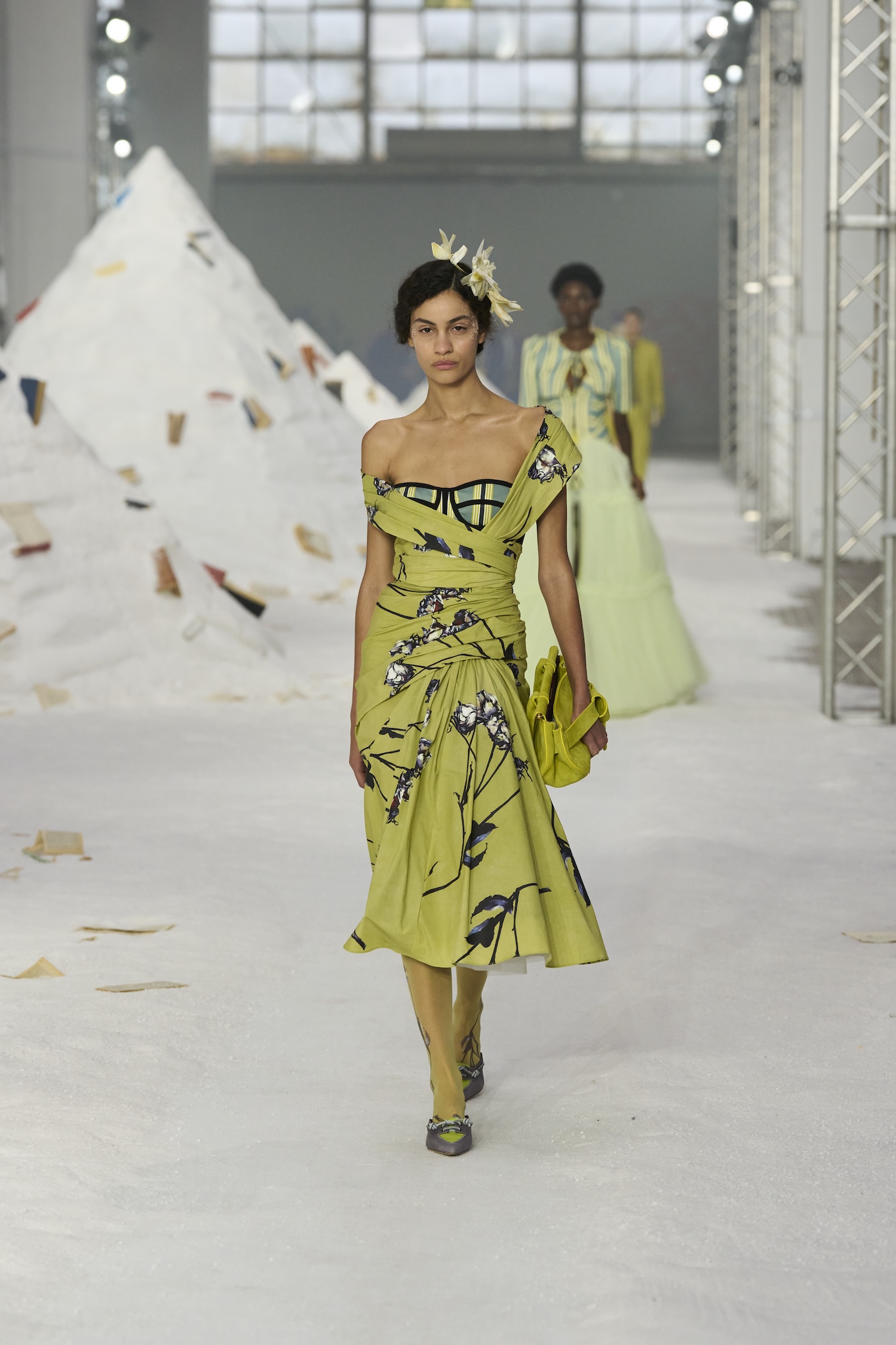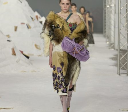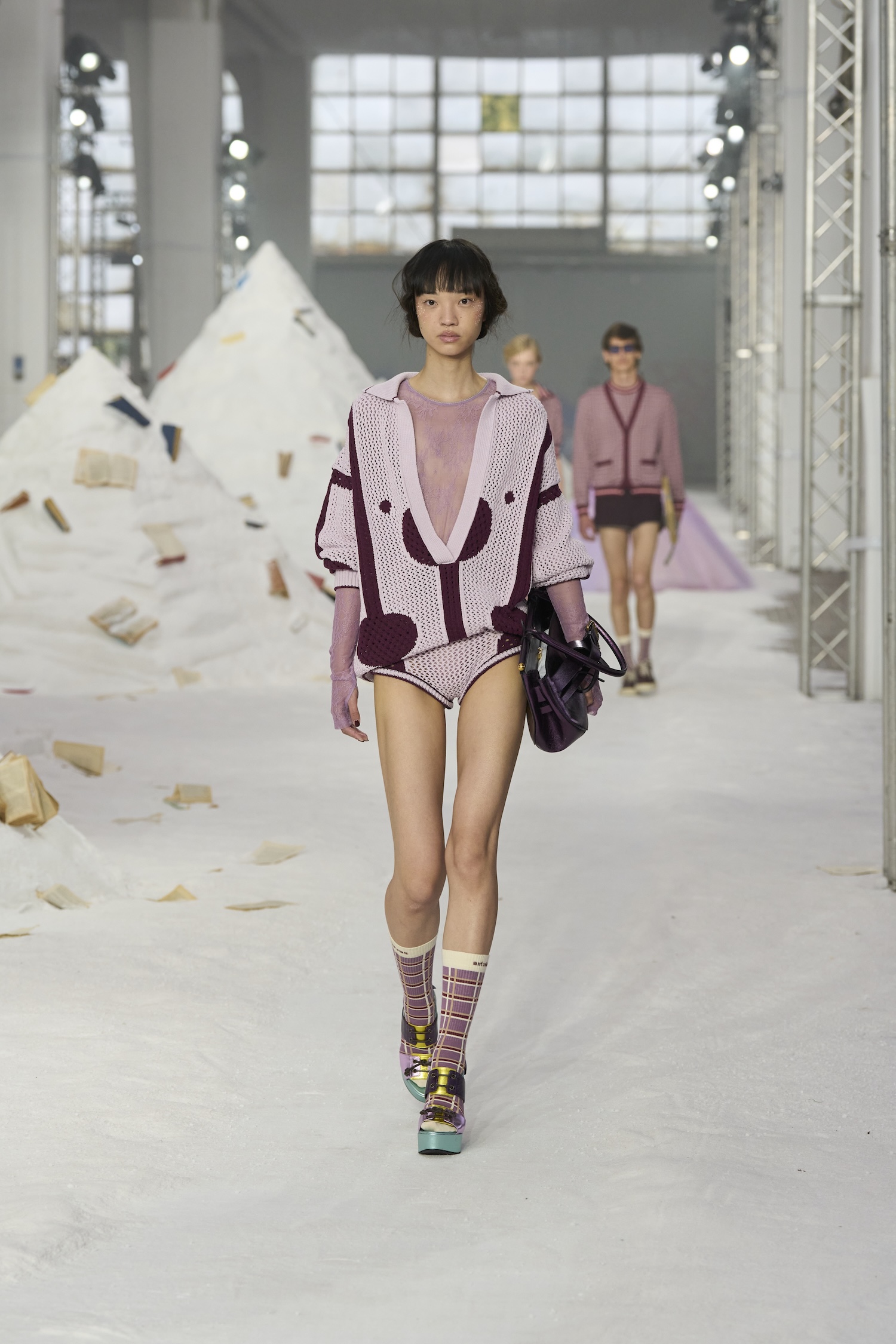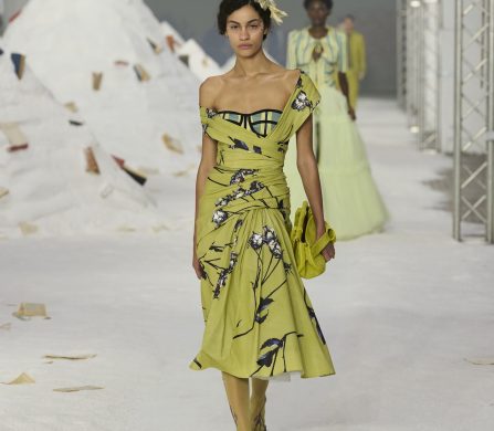 The clothes themselves told the story of arrivals and departures. Palettes drifted from whispering lilacs to cadmium shocks of pink, gold, violet, chocolate and plum, dusted with bronze, sand and copper, anchored by a faded black. Patterns married beautifully in contrasts: checks against stripes, jacquards beside damasks, polka dots colliding with pinstripes and chevrons. Flowers spilled everywhere – scattered, gathered, embroidered – sometimes like bouquets, sometimes like paint splashes.