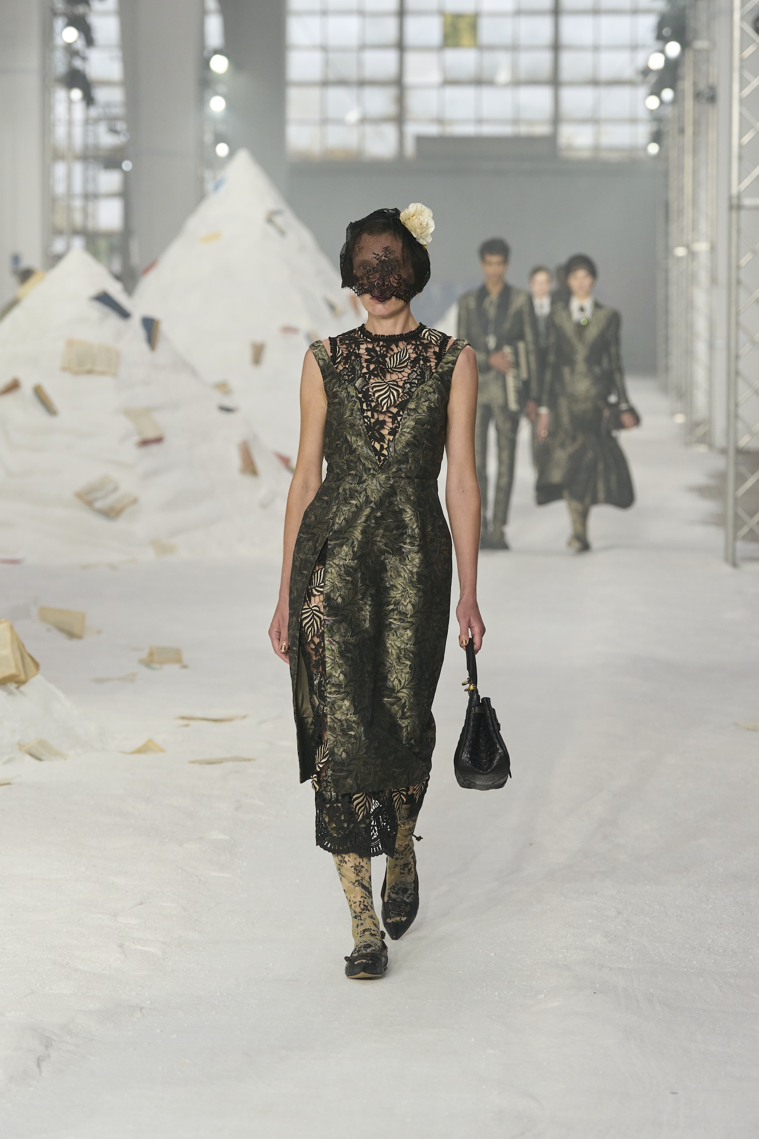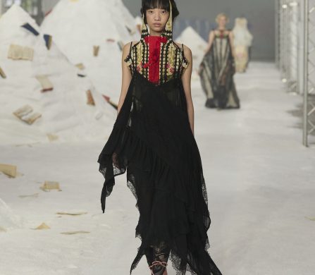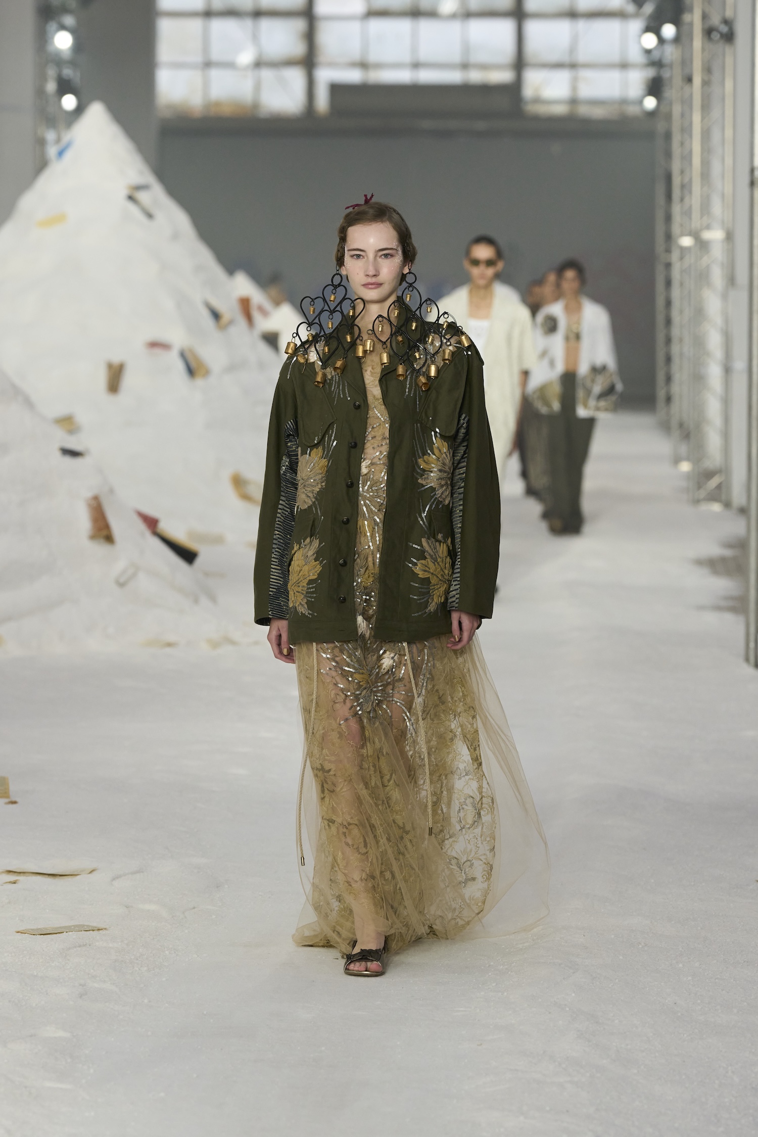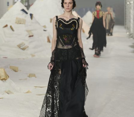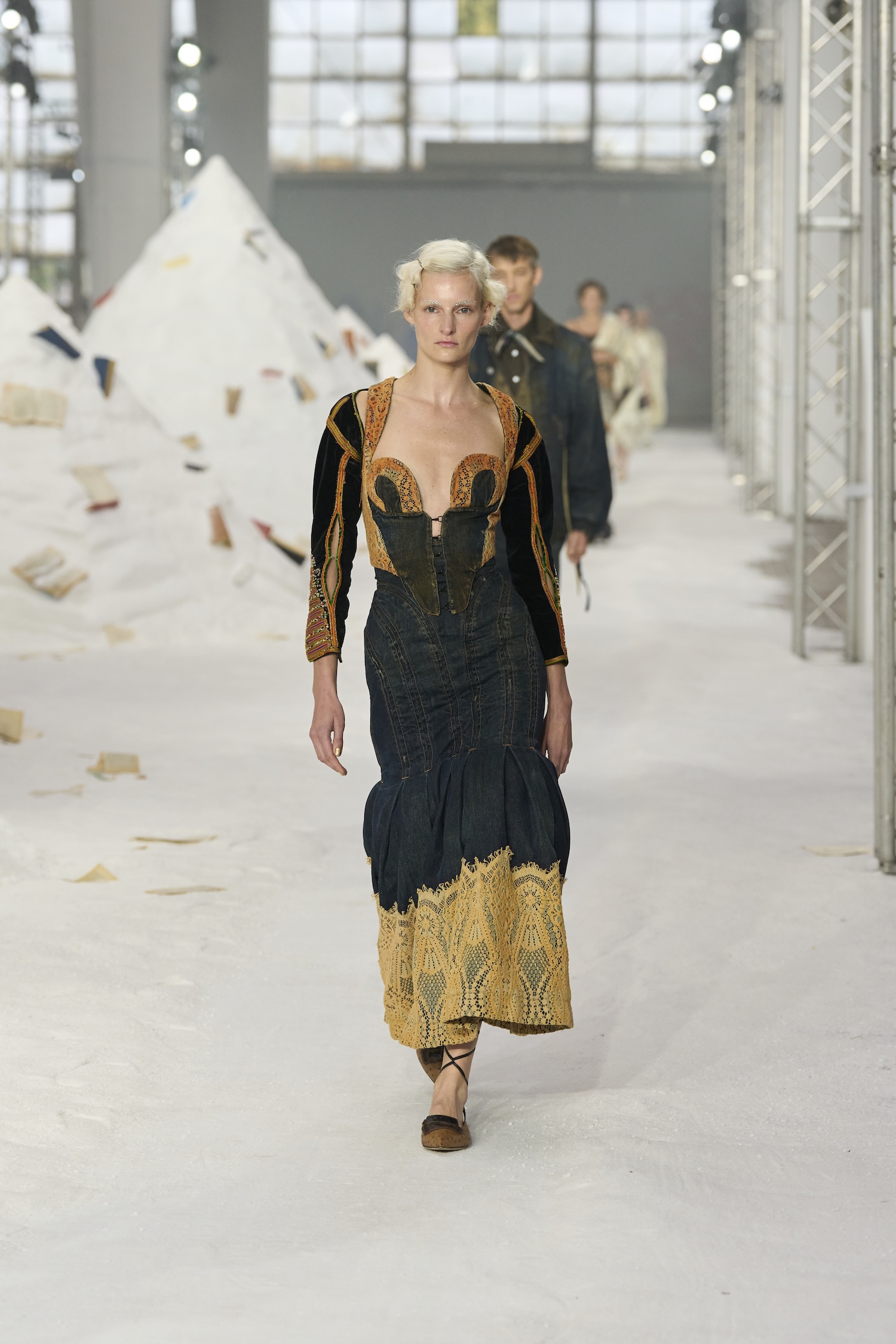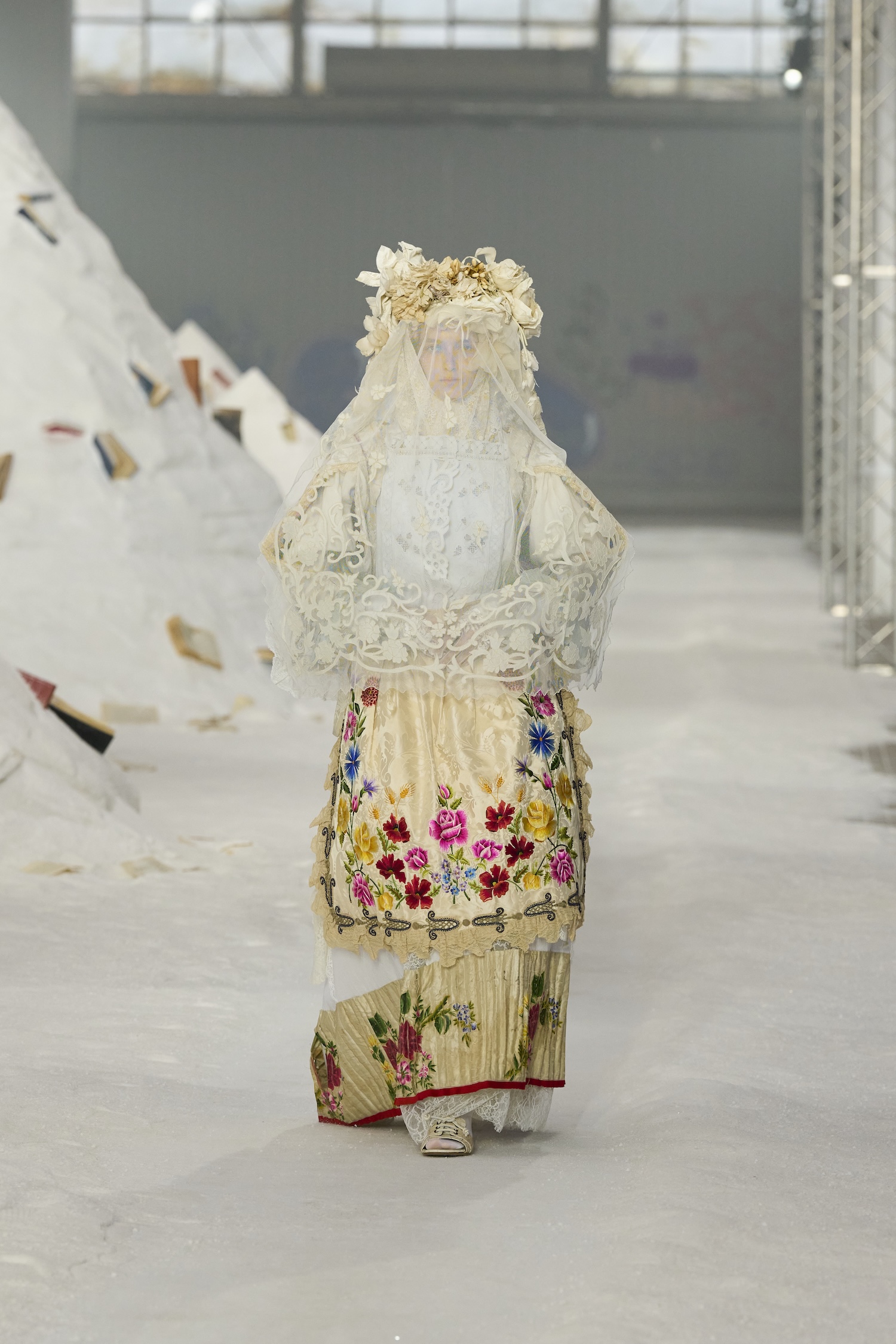 The runway unfolded like a theatrical pageant. Traditional Sardinian garments, such as busti (corsets), grembiuli (aprons), coroncine (little flower crowns), and cuffie (bonnets) embroidered in Sennori, Oliena, Nuoro, walked beside garments recalling Bloomsbury’s intellectual salons. The show played out as a métissage, a cultural cross-pollination where folk heritage, literature, cinema and modern tailoring collide. Marras insists these pieces were “too beautiful to be altered,” and instead presented them as fragments of a living archive, stitched directly into the present.