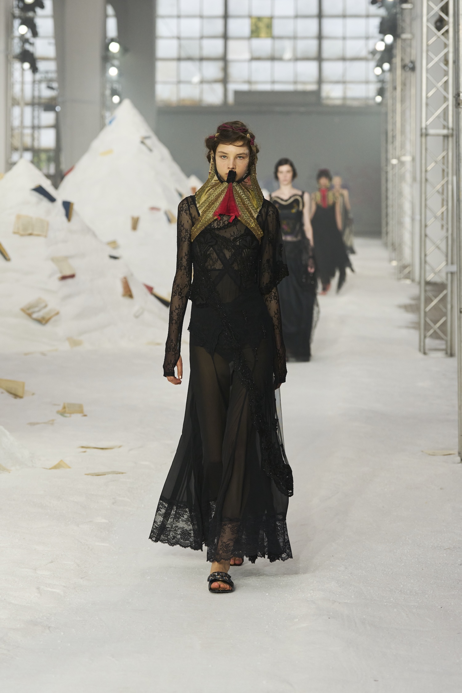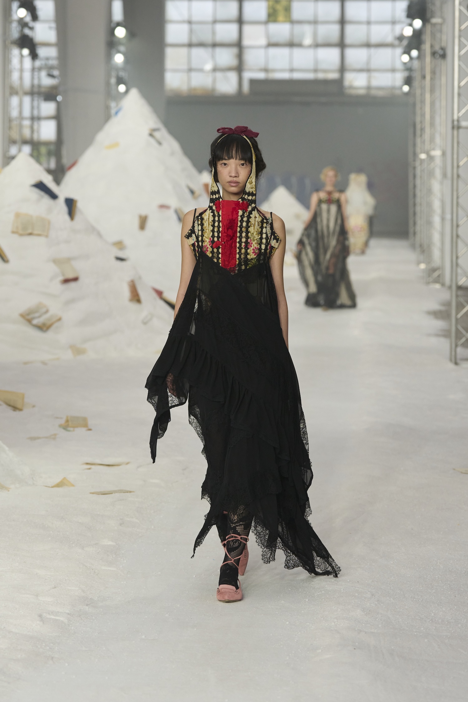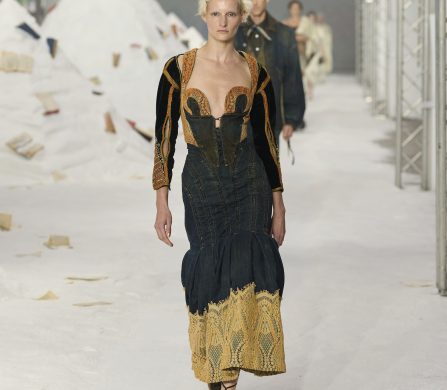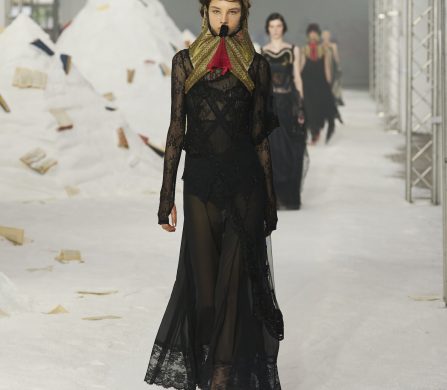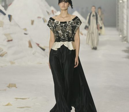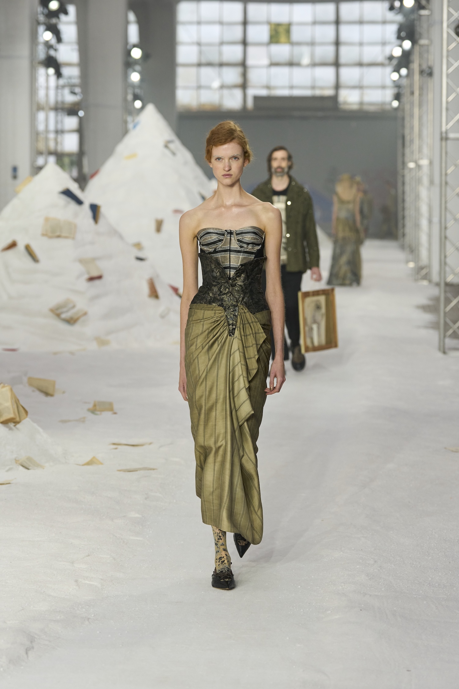 The runway unfolded like a theatrical pageant. Traditional Sardinian garments, such as busti (corsets), grembiuli (aprons), coroncine (little flower crowns), and cuffie (bonnets) embroidered in Sennori, Oliena, Nuoro, walked beside garments recalling Bloomsbury’s intellectual salons. The show played out as a métissage, a cultural cross-pollination where folk heritage, literature, cinema and modern tailoring collide. Marras insists these pieces were “too beautiful to be altered,” and instead presented them as fragments of a living archive, stitched directly into the present.