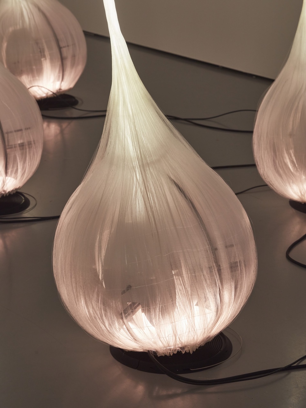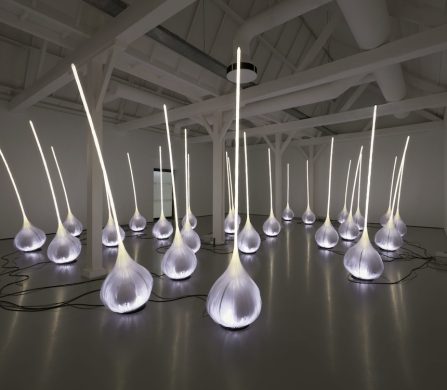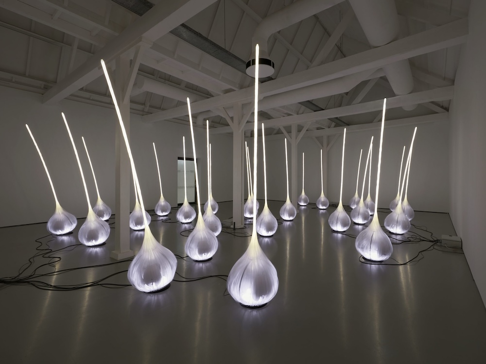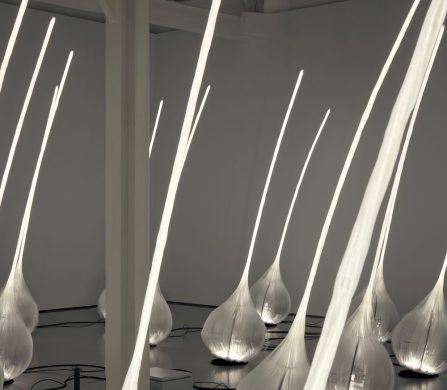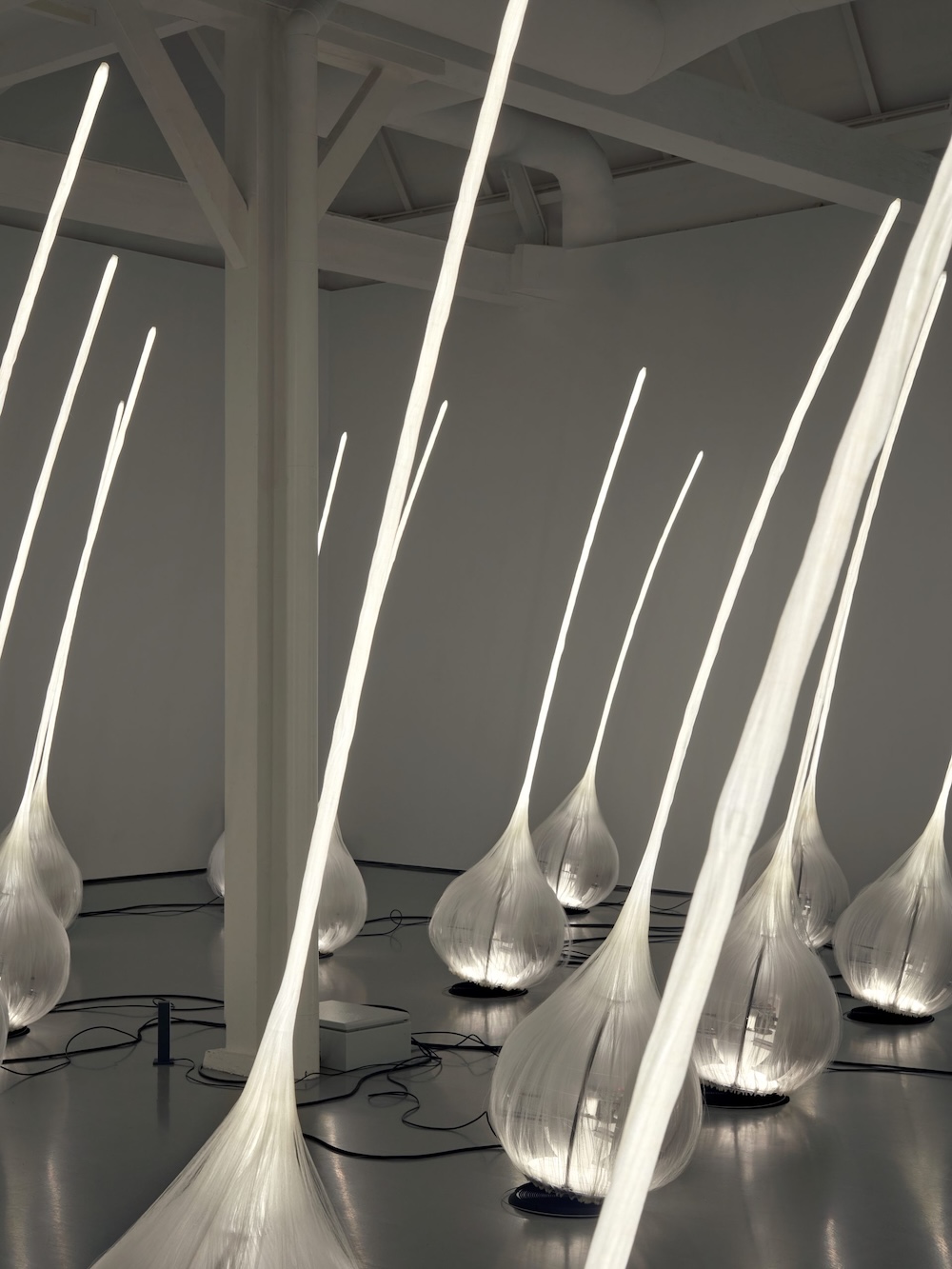 Titled Drift Us, the work is anything but passive. Twenty-two illuminated stalks respond in real time to visitors walking through the space — bending, glowing, and shifting in synchrony. It’s movement choreographed not by dancers, but by data. The effect is subtle and immersive: think grass swayed by wind, reinterpreted through robotics.