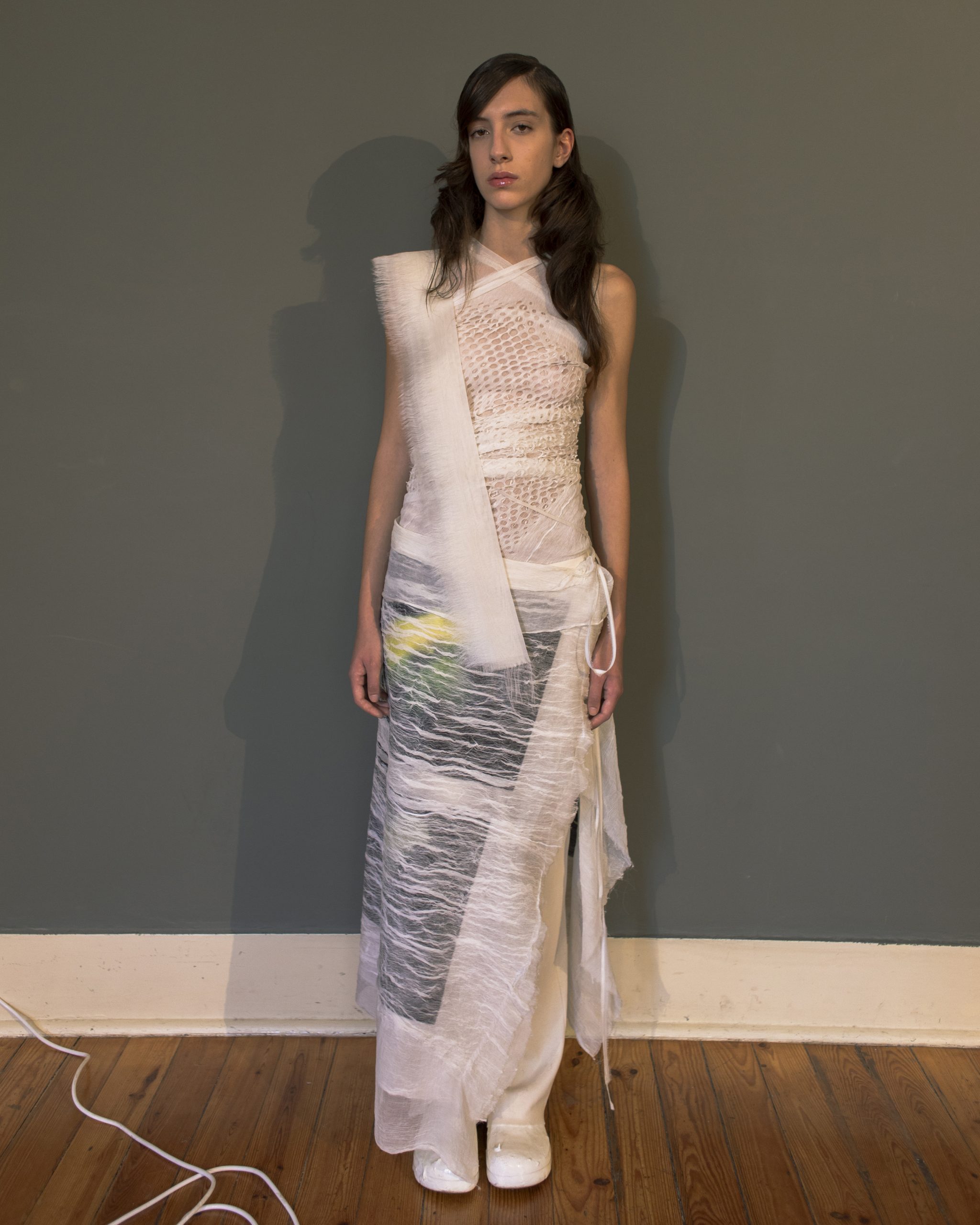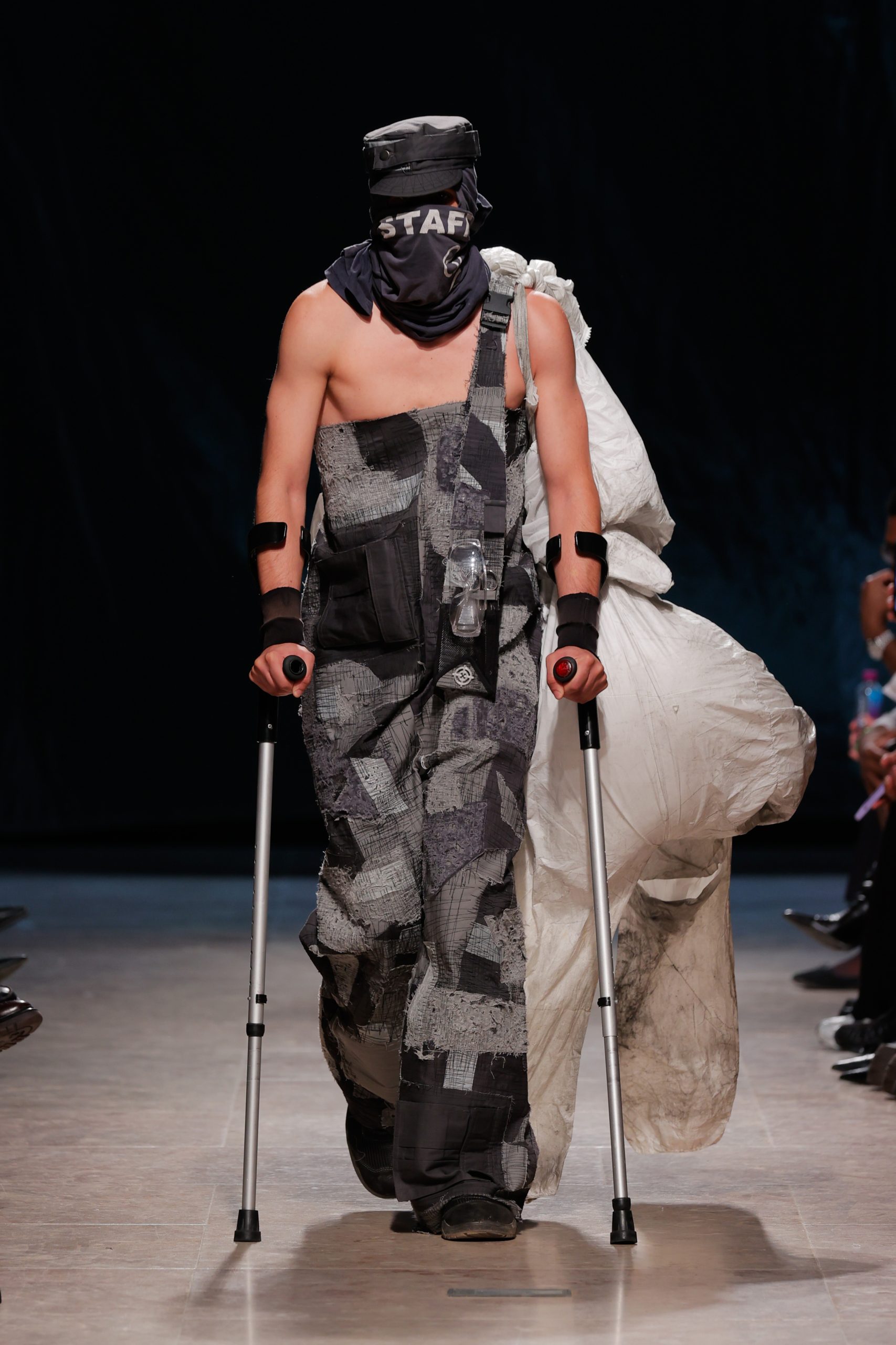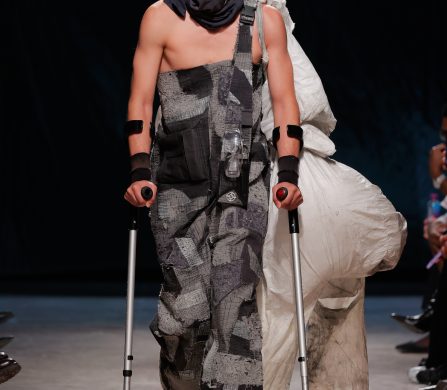 Five finalists were chosen on the night, including Adja Baio, who kickstarted the show with her ‘Pano de Pinti ‘collection of voluminous silhouettes, offset by the interesting use of what looked like braided kanekalon hair, allowing for texture and fluid movement. Mafalda Simões shared a pastel-coloured ‘Daydream’ collection inspired by Justine Kurland’s photographic series ‘Girl Pictures’ and entirely crafted through knitting and crochet. Ariana Orrico’s ‘75’ collection of leather offcuts and cotton fabrics sourced from textile waste was aimed at reframing the way we look at the male body. And finally, Marianna Garcia wowed with ‘Cota 0’, a sculpted collection of deconstructed suiting and precise cuts. Last but not least, Usual Suspect (Xavier Silva) made a statement with his collection ‘Último Empregado’ (The Last Worker), delivering a raw showing dedicated to the years of hard work by Silva’s family. The collection repurposed old uniforms worn by himself and relatives, and the result was an earnest reimagining of workwear, with a streetwear undercurrent.
