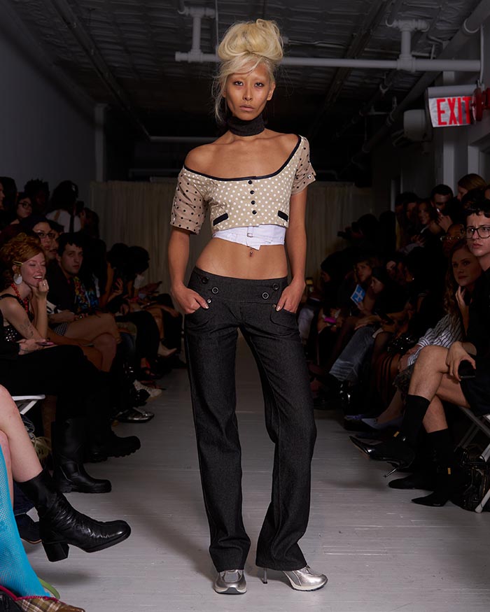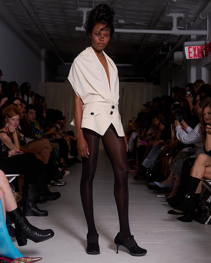 Ben Doctor’s NYFW SS26 presentation merged the metropolitan spirit of the 1950s and 60s with today’s “bus in the sky” lifestyle. Set against the narrow streets of Chinatown, silhouettes inspired by vintage flight attendants’ A-line uniforms met the raw textures of modern city living. One of the opening looks featured a cropped jacket styled with a low-rise denim skirt — the structured, masculine edge of the top merging seamlessly with the nostalgic ease of a golden-era “skybus” traveller.