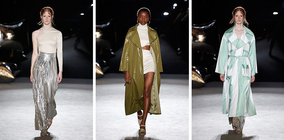 The judges were also impressed by Xevi Fernández, whose fascination with fashion began with a childhood spent observing the clients in his family’s haberdashery business. He has already swept up the Young Talent Prize at Bread & Butter Berlin and Best Men’s Collection at Creamoda in Bilbao. The inspiration for his Fifteen Minutes Fame collection came from Andy Warhol’s Factory and the counterculture of the 1960s. Warhol covered the walls of his studio in silver paint, tin foil and broken mirrors and this is reflected in finely pleated silver jackets, jumpsuits and wide-legged trousers – shots of metallic in a sophisticated colour palette of mint, caramel, olive and navy.