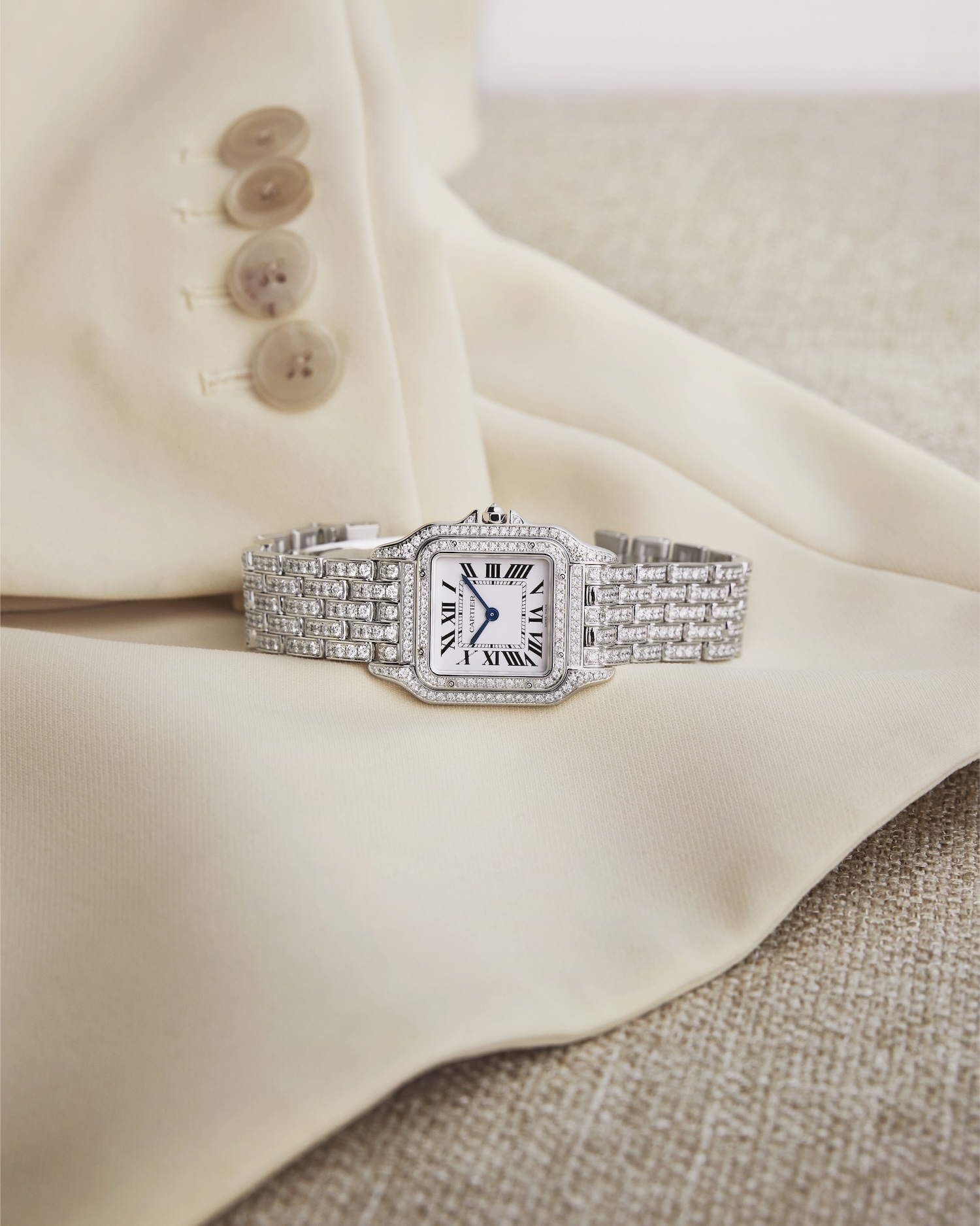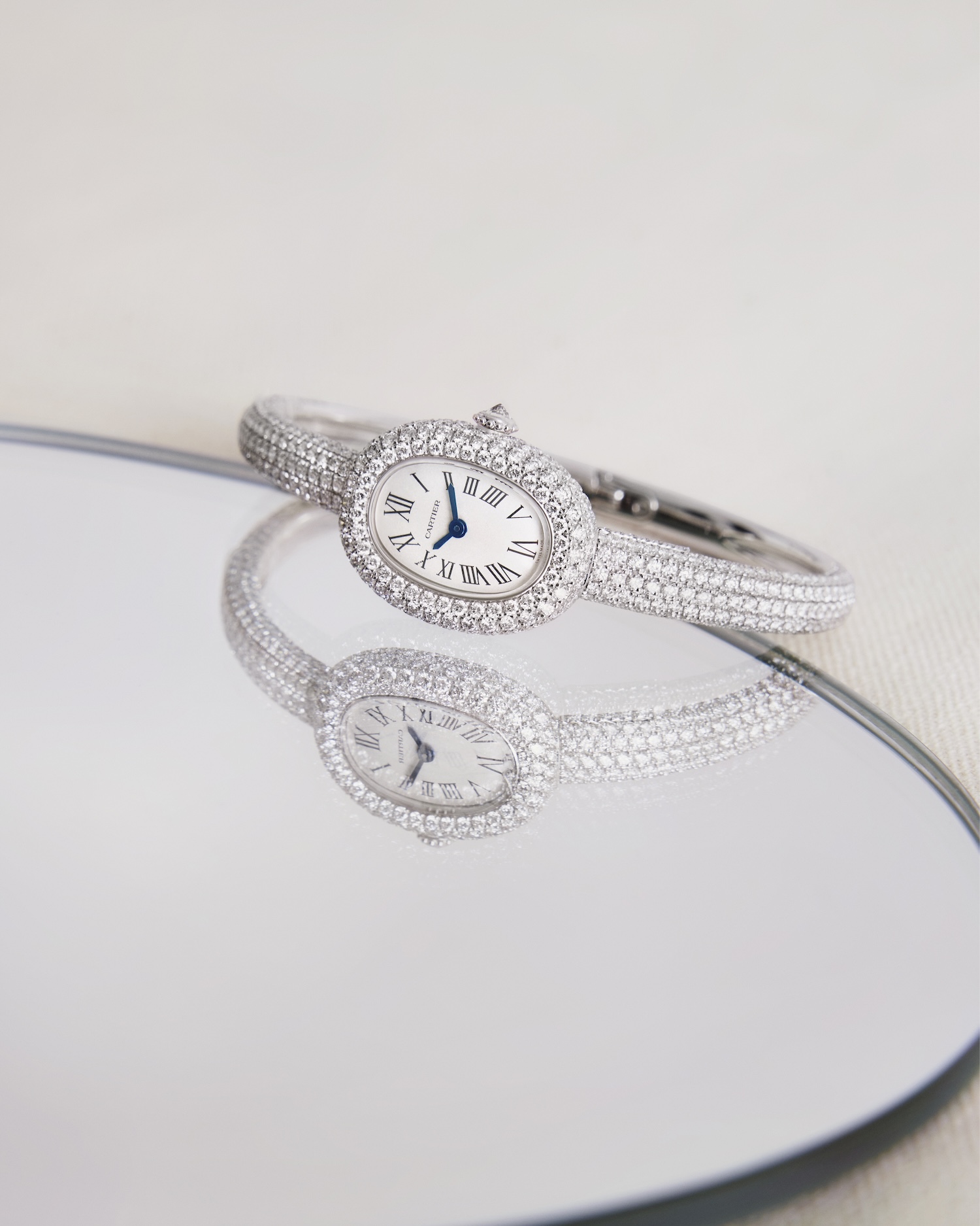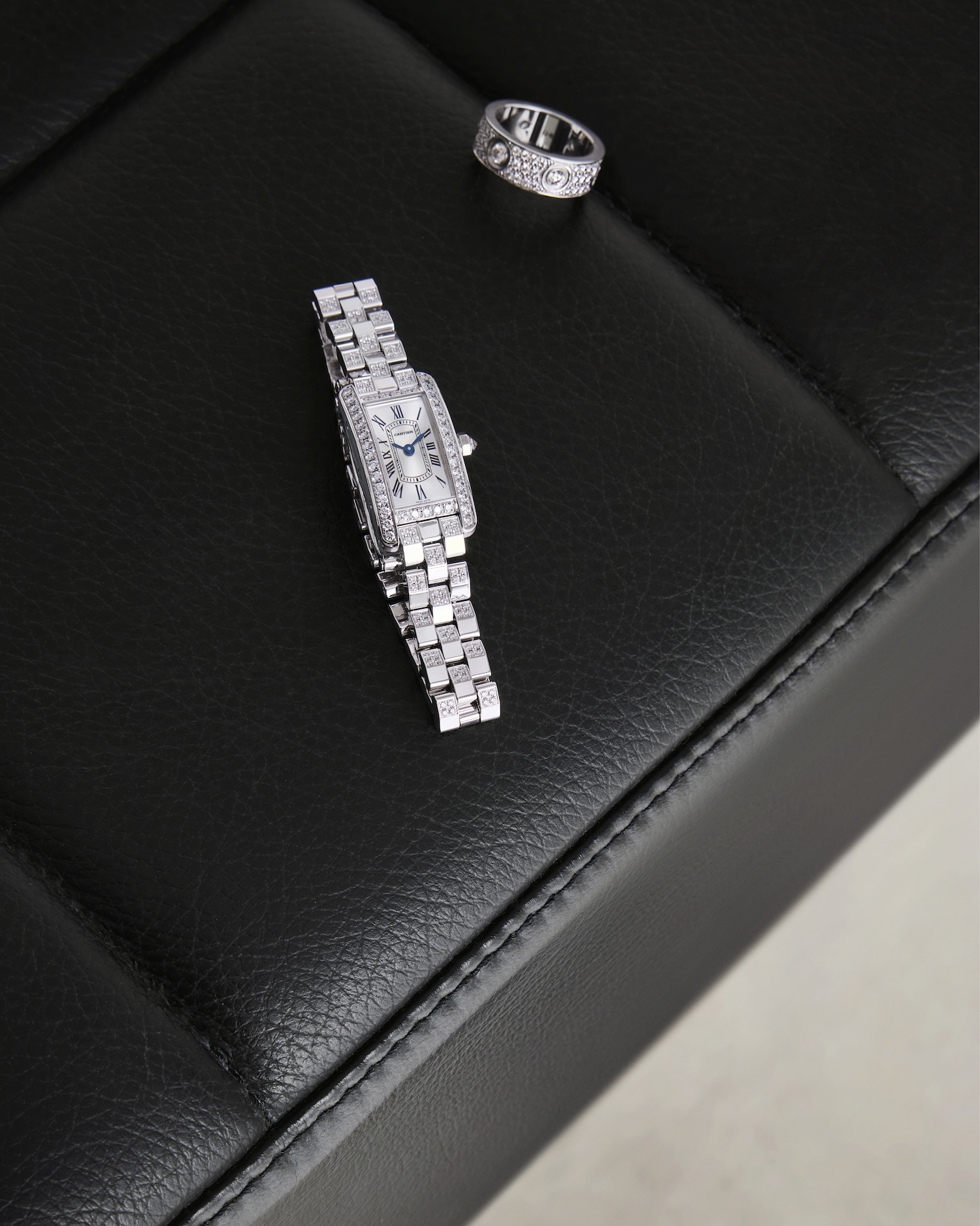 Even the Maison’s most iconic timepieces are transfigured by the magic of the diamond. The Tank Américaine mini, set with 569 diamonds, dresses a classic watch in evening jewellery. The bracelet links flow like liquid light, the dial keeps the clean codes of the original and the overall effect is one of understated opulence.