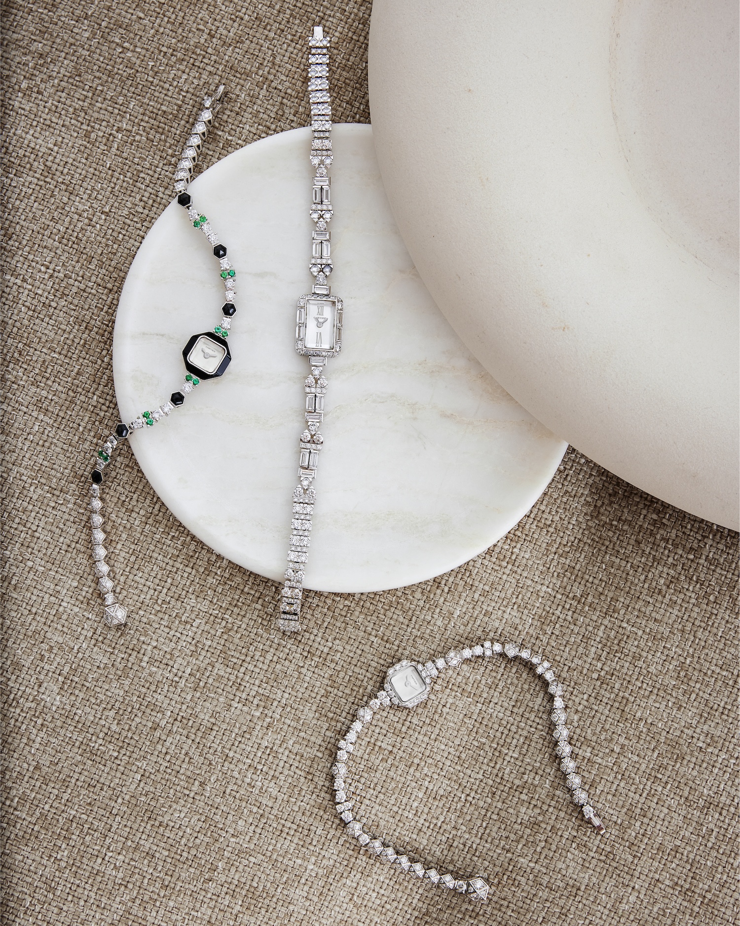 One exquisite rectangular piece features a bracelet that daringly combines baguette-cut and brilliant-cut diamonds in an unprecedented composition. Another is a geometric masterpiece boasting an octagonal case that frames a square, sun ray-effect dial with distinct Art Deco flourishes. In a true feat of virtuosity, the gem-setting utilises the demanding triangular grain and cut-down settings, multiplying the light across the varied link shapes.