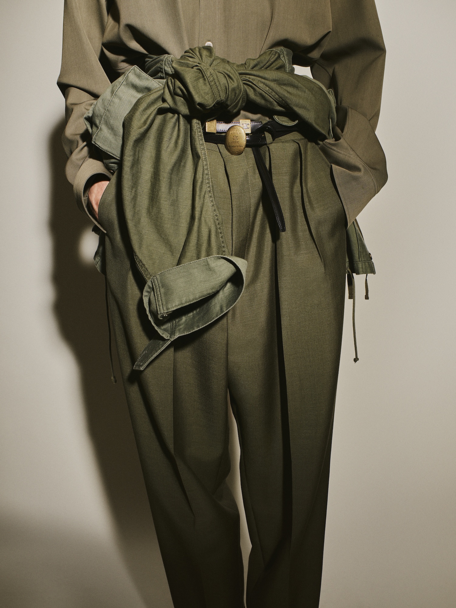 The opening tailoring screamed of Rider’s decade-long tenure during the Philo years: suits appeared in warm, earthy tones (like sand, camel, and stone) cut with slightly raised waists and paired with belted coats. Floor-length trenches in putty were worn open and flowing, transforming utilitarian heritage into something cinematic. Beneath them, cropped denim jackets with raw collars created little shocks of textural contrast that kept the whole collection from ever feeling too buttoned-down.