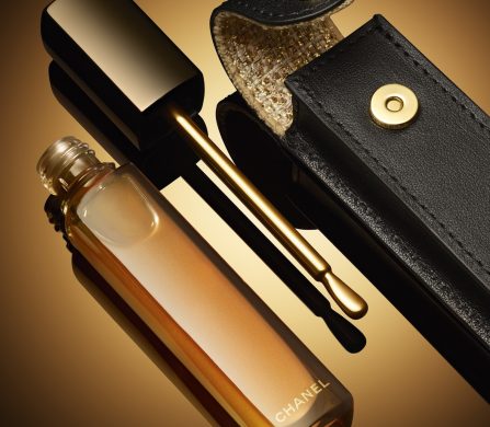 Every detail is couture. The flacon rests in a black leather sheath lined with gold-lamé tweed, woven exclusively by Maison Lesage, echoing the dual-tone elegance of a Chanel icon bag and making it a skincare jewel that is both portable and tactile.