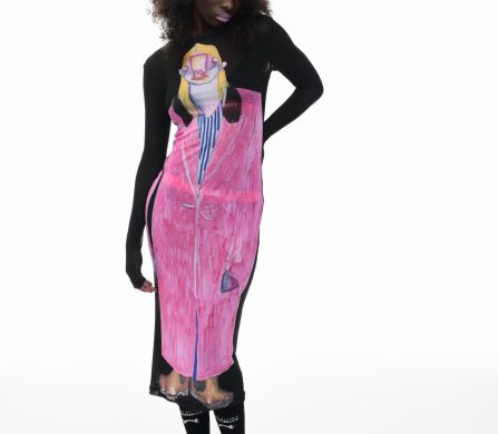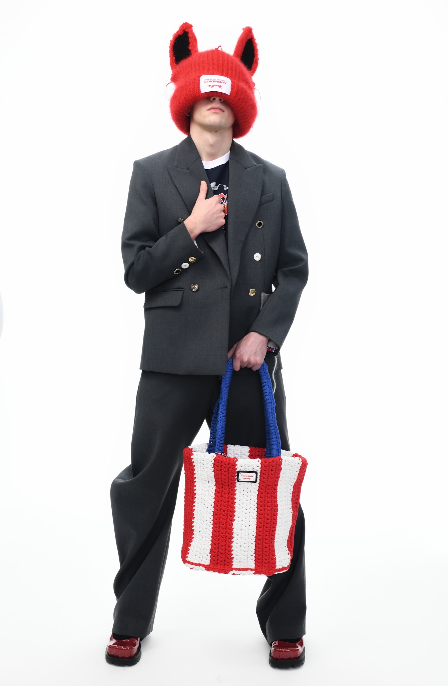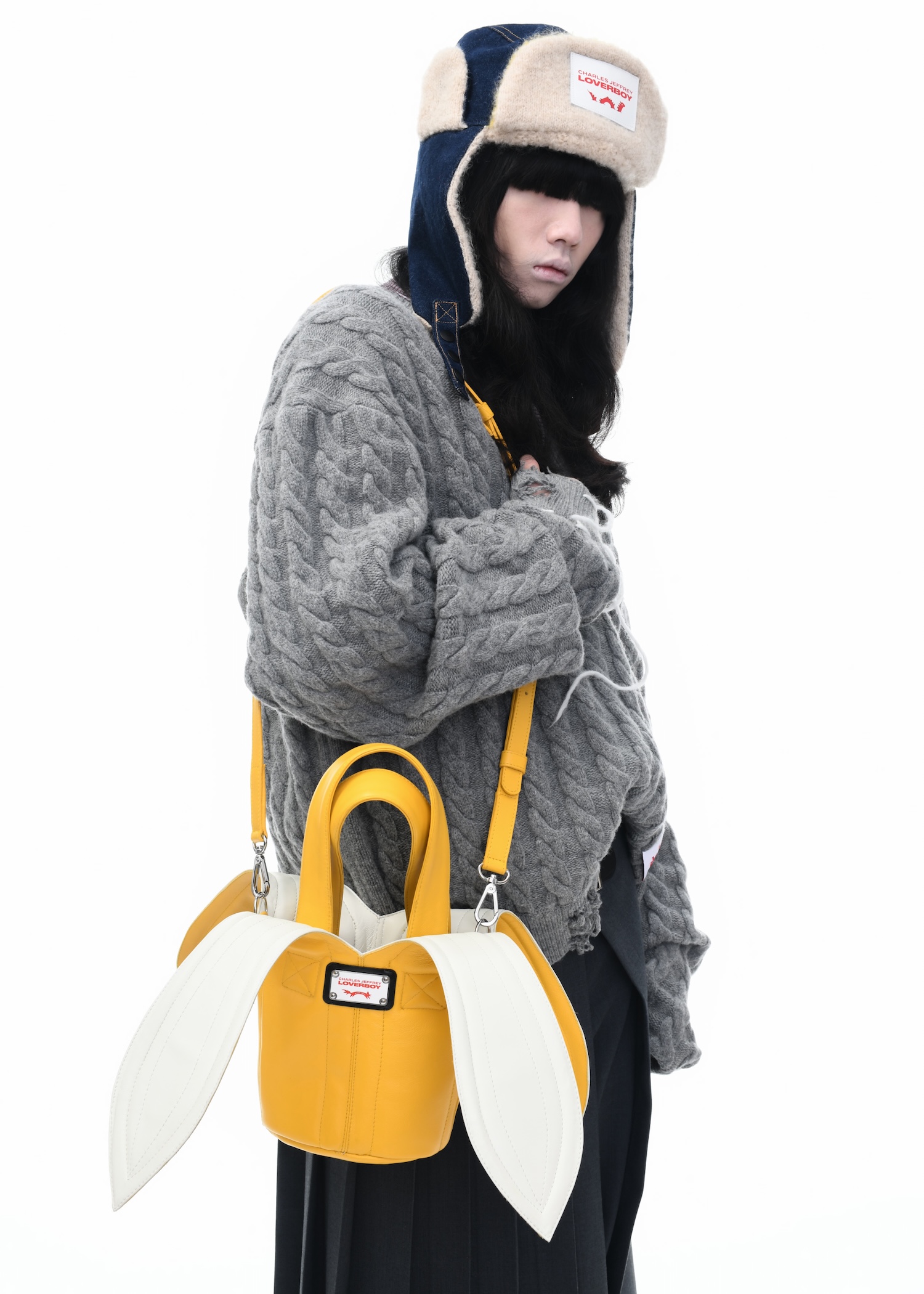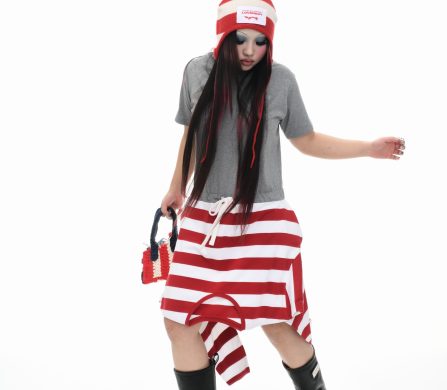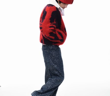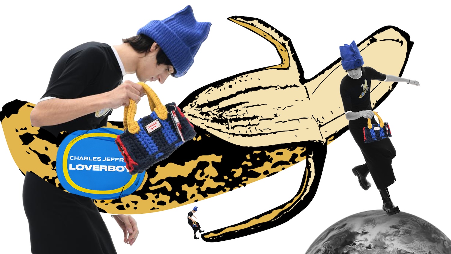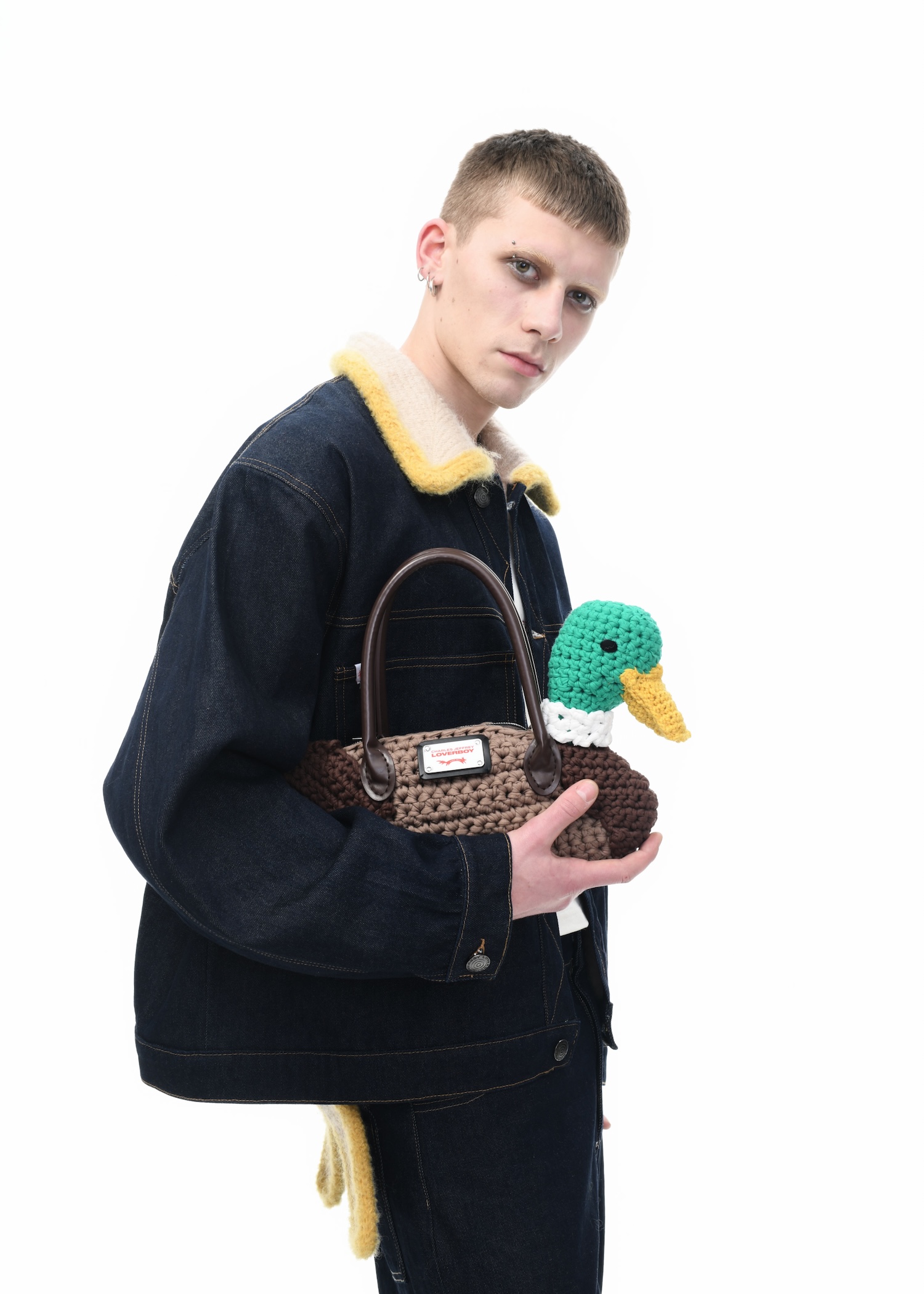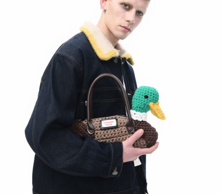 It’s an explosive collage of exaggerated tailoring, frayed crochet, Mallard-shaped handbags and sculptural ear beanies. If the collection channels a debauched aristocrat on a Victorian comedown, the visuals only push further. Non-binary models stare down the lens in distressed jersey and banana-peel silhouettes, the slogan ‘I Am a Product’ stamped across the chaos.