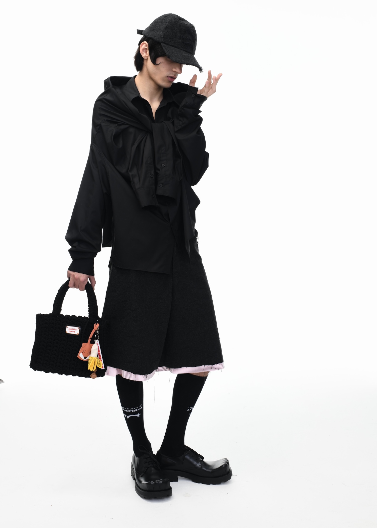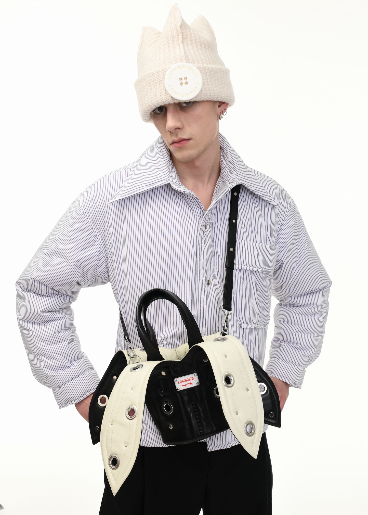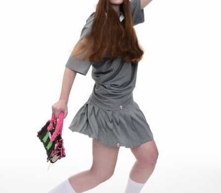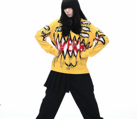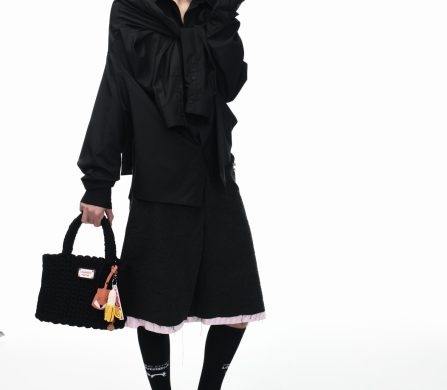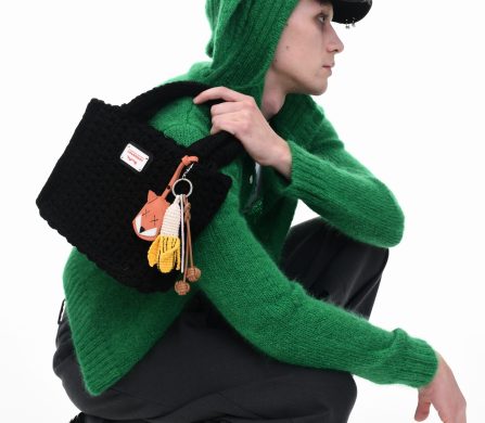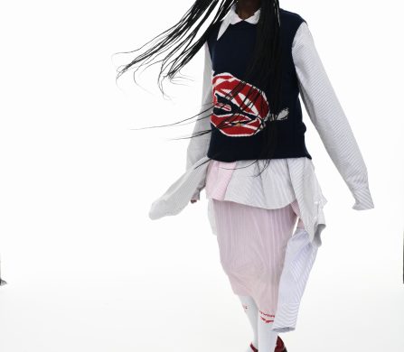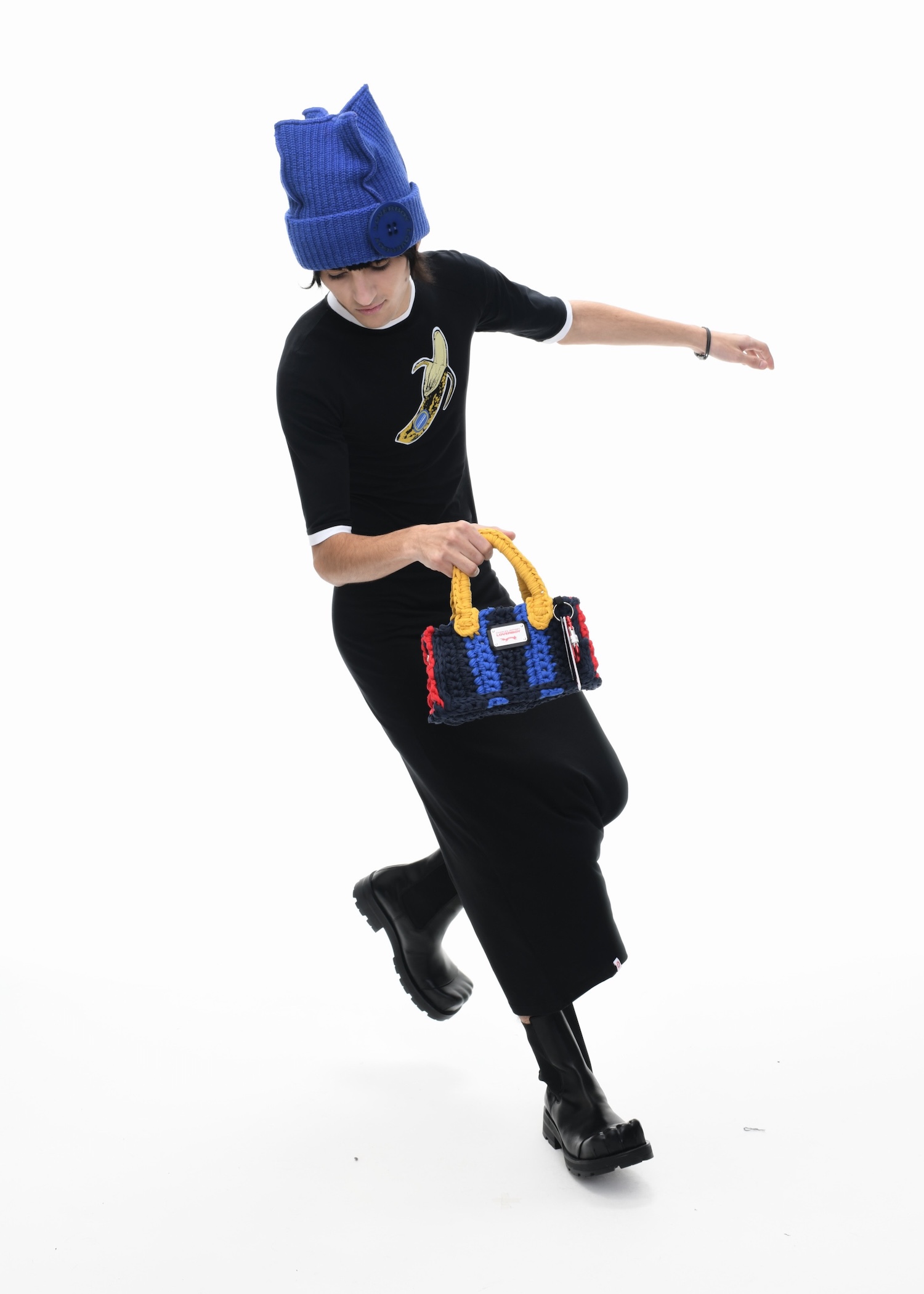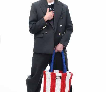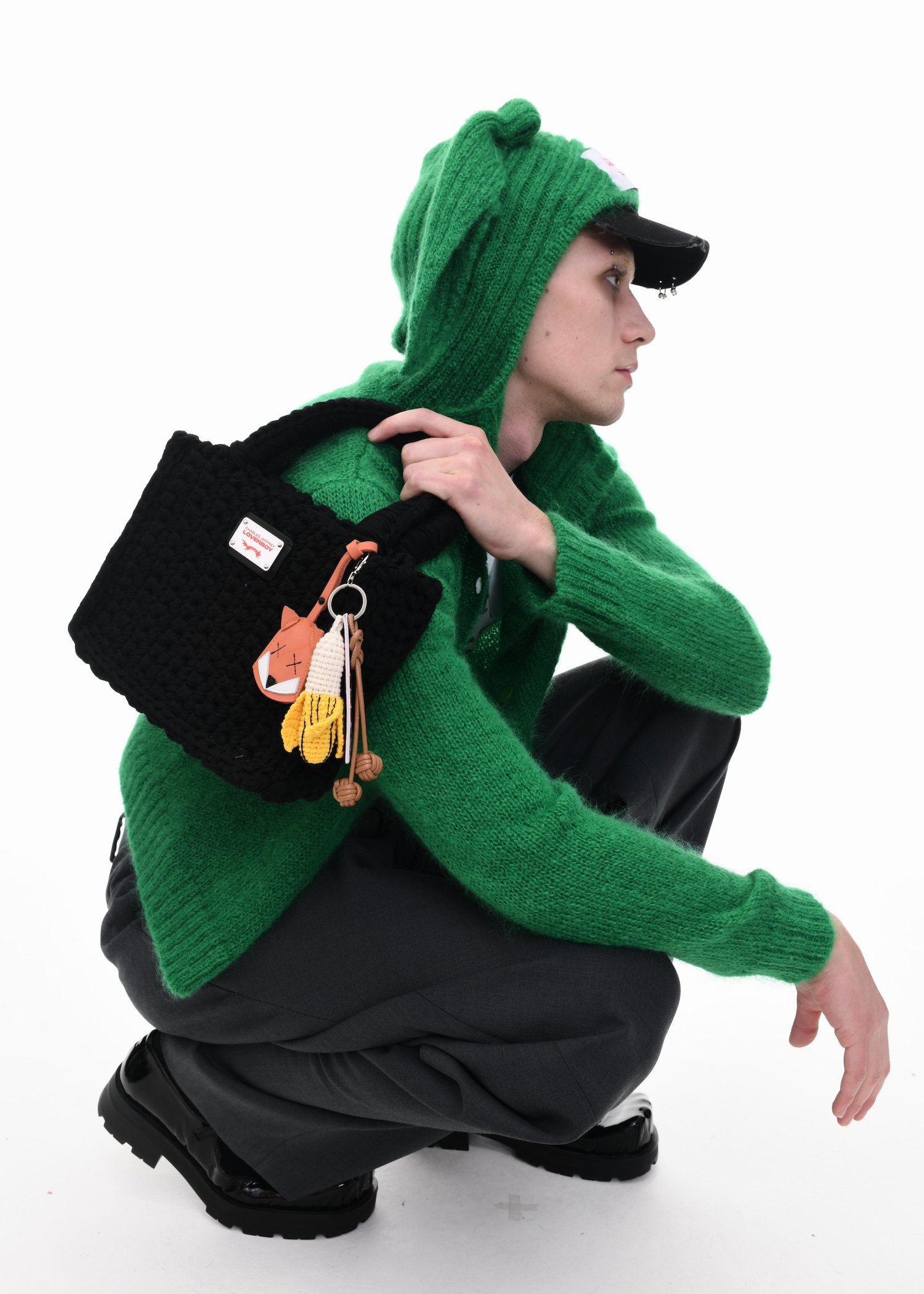 It’s an explosive collage of exaggerated tailoring, frayed crochet, Mallard-shaped handbags and sculptural ear beanies. If the collection channels a debauched aristocrat on a Victorian comedown, the visuals only push further. Non-binary models stare down the lens in distressed jersey and banana-peel silhouettes, the slogan ‘I Am a Product’ stamped across the chaos.