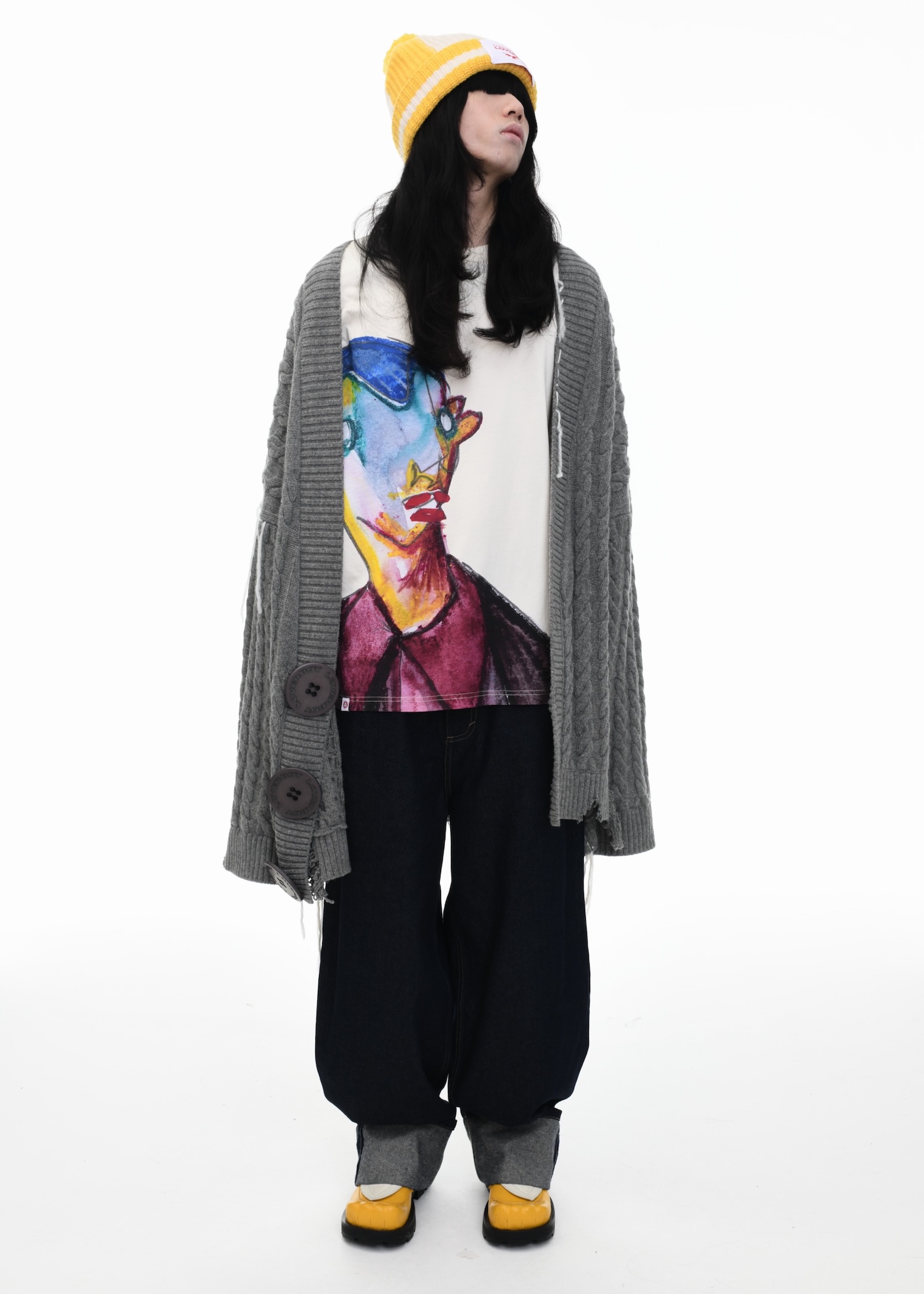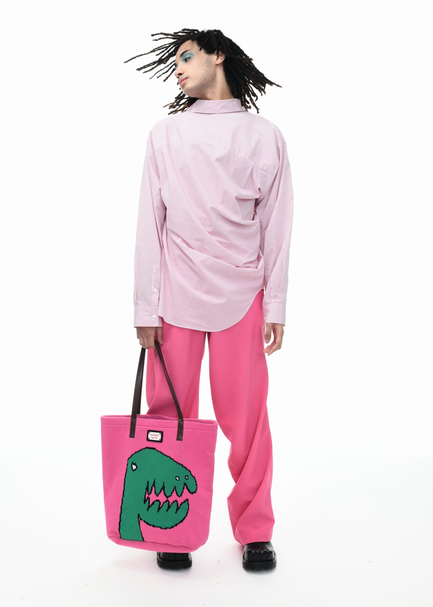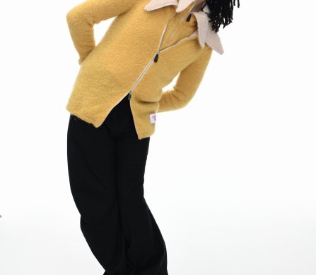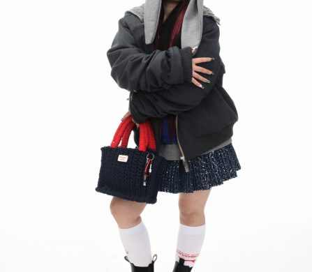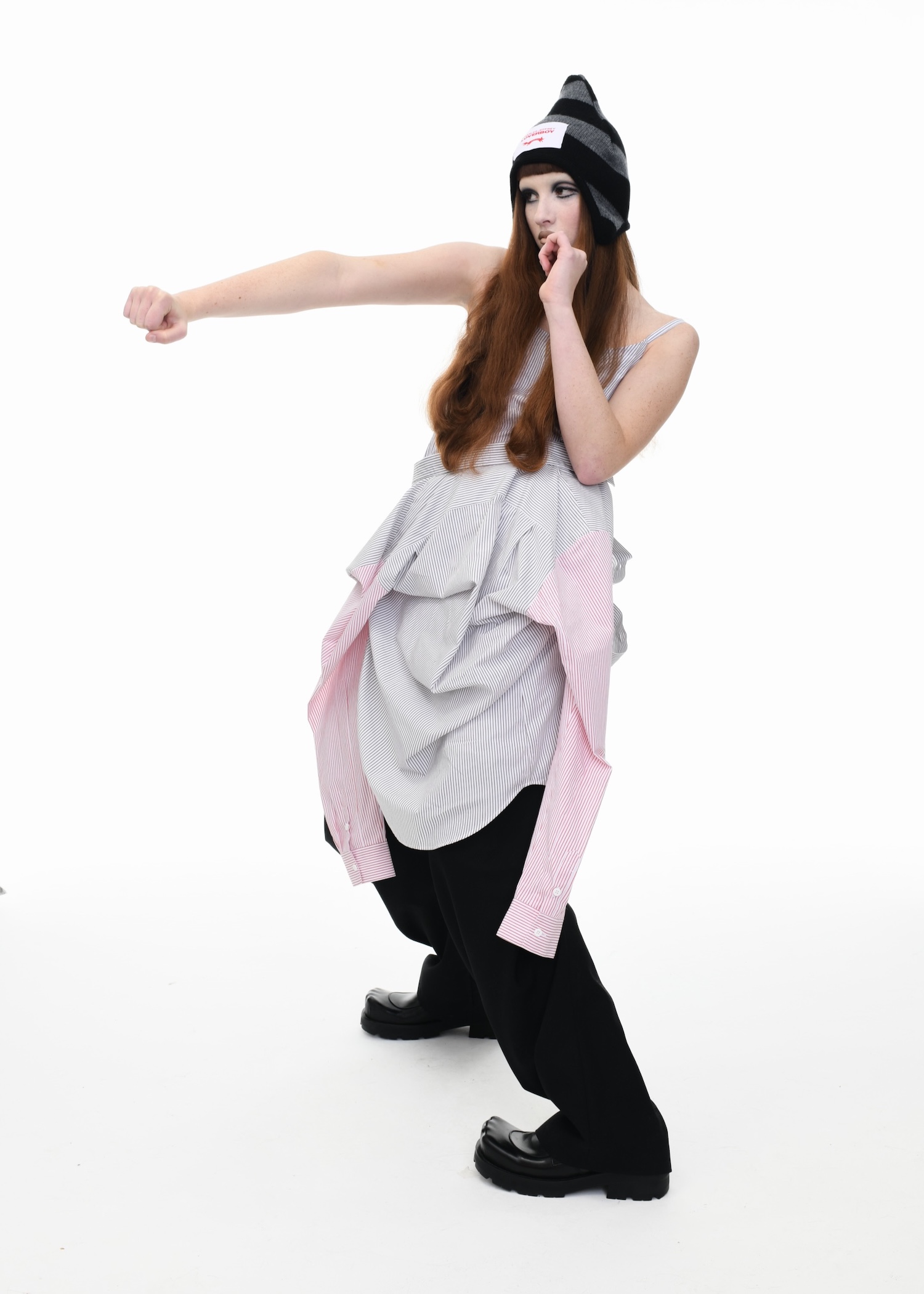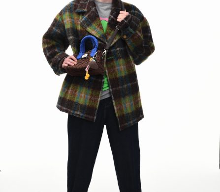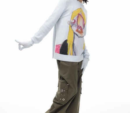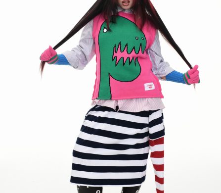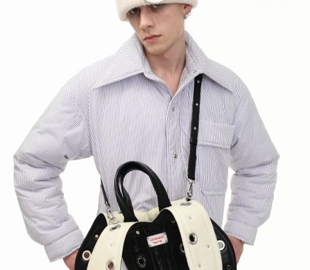 It’s an explosive collage of exaggerated tailoring, frayed crochet, Mallard-shaped handbags and sculptural ear beanies. If the collection channels a debauched aristocrat on a Victorian comedown, the visuals only push further. Non-binary models stare down the lens in distressed jersey and banana-peel silhouettes, the slogan ‘I Am a Product’ stamped across the chaos.