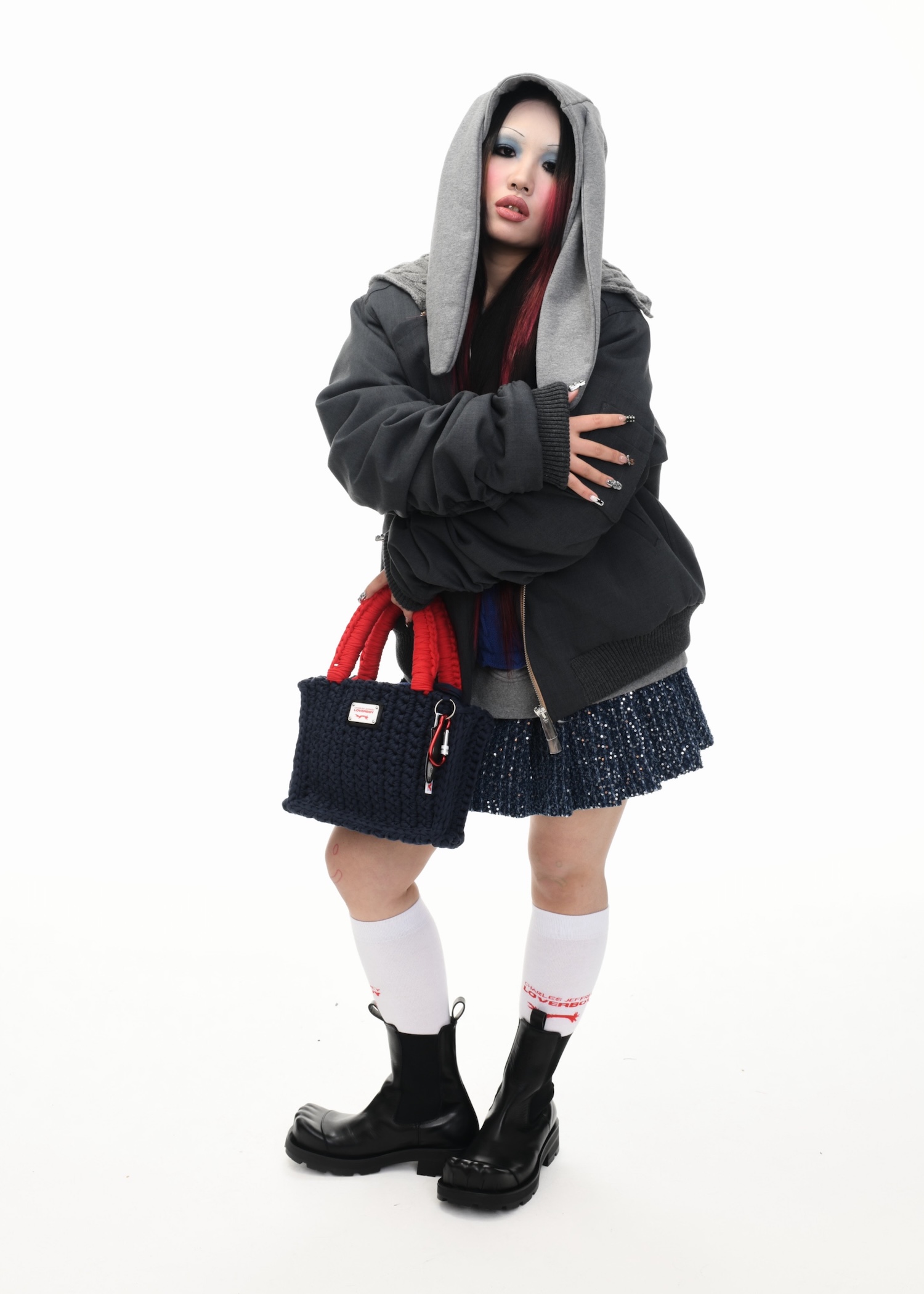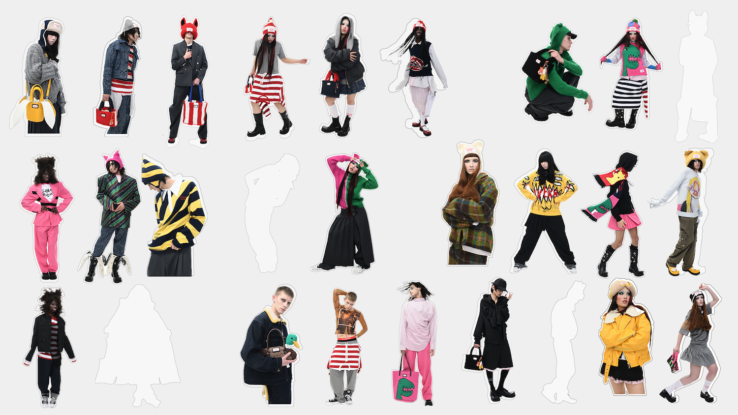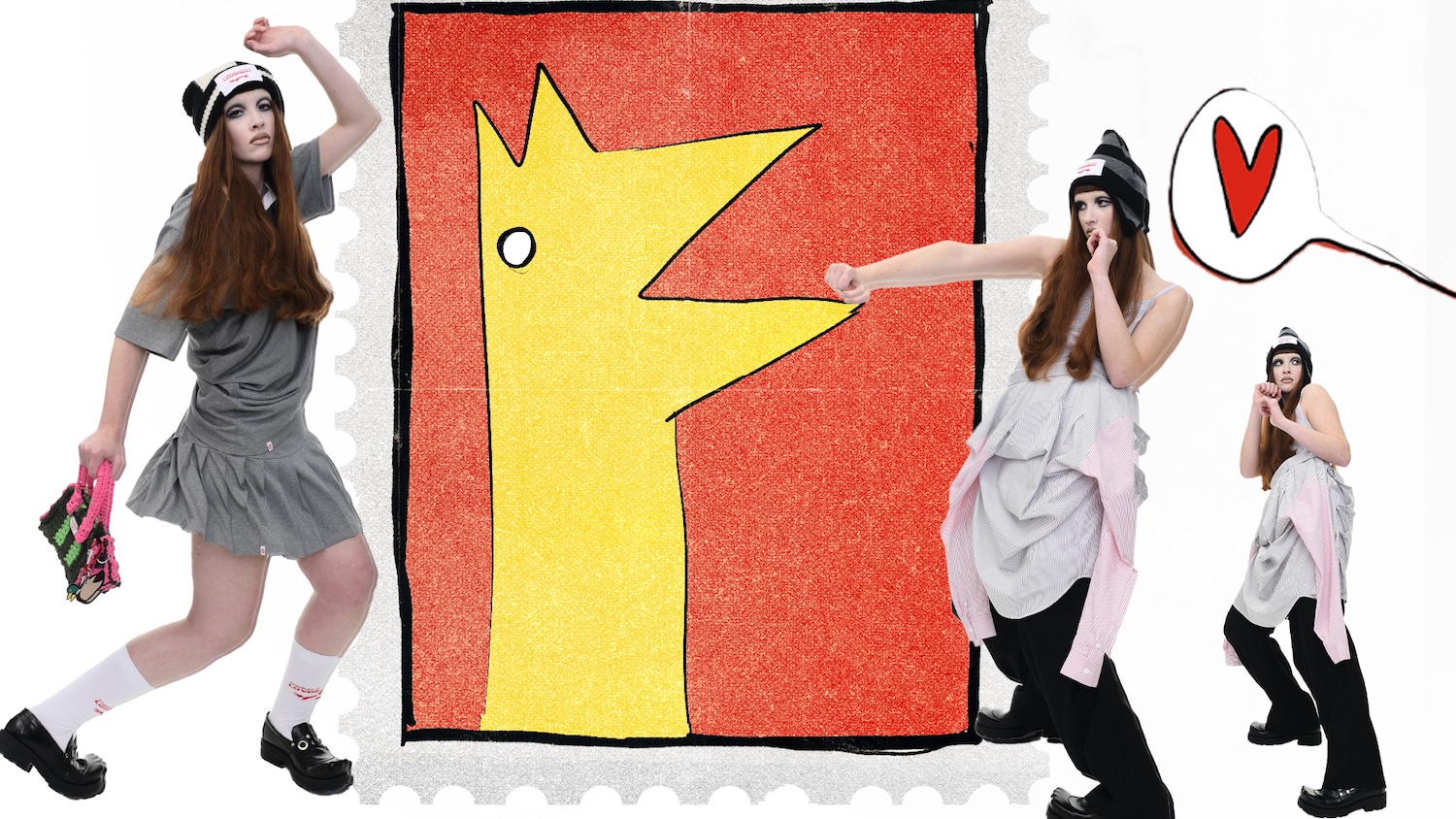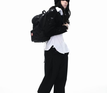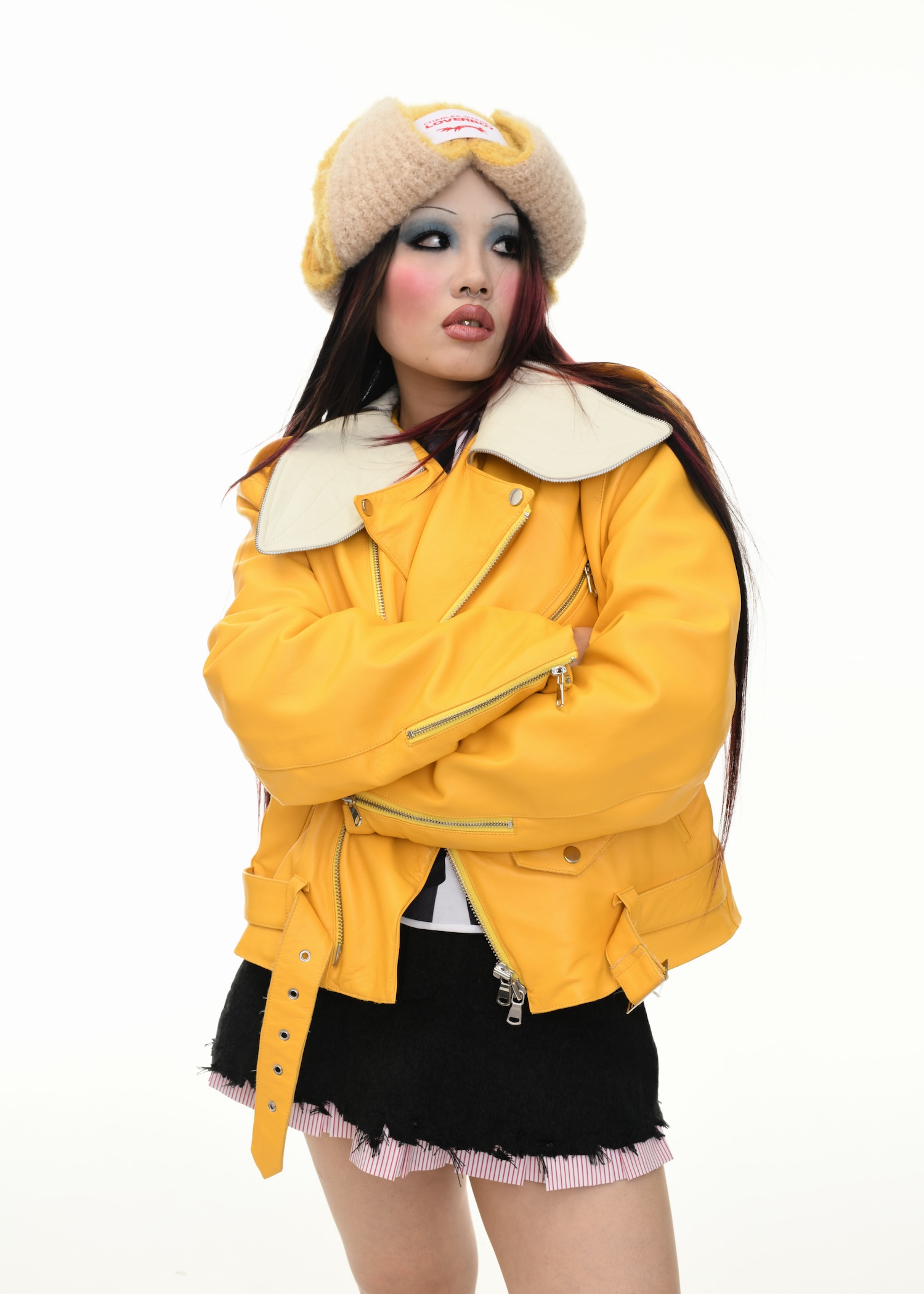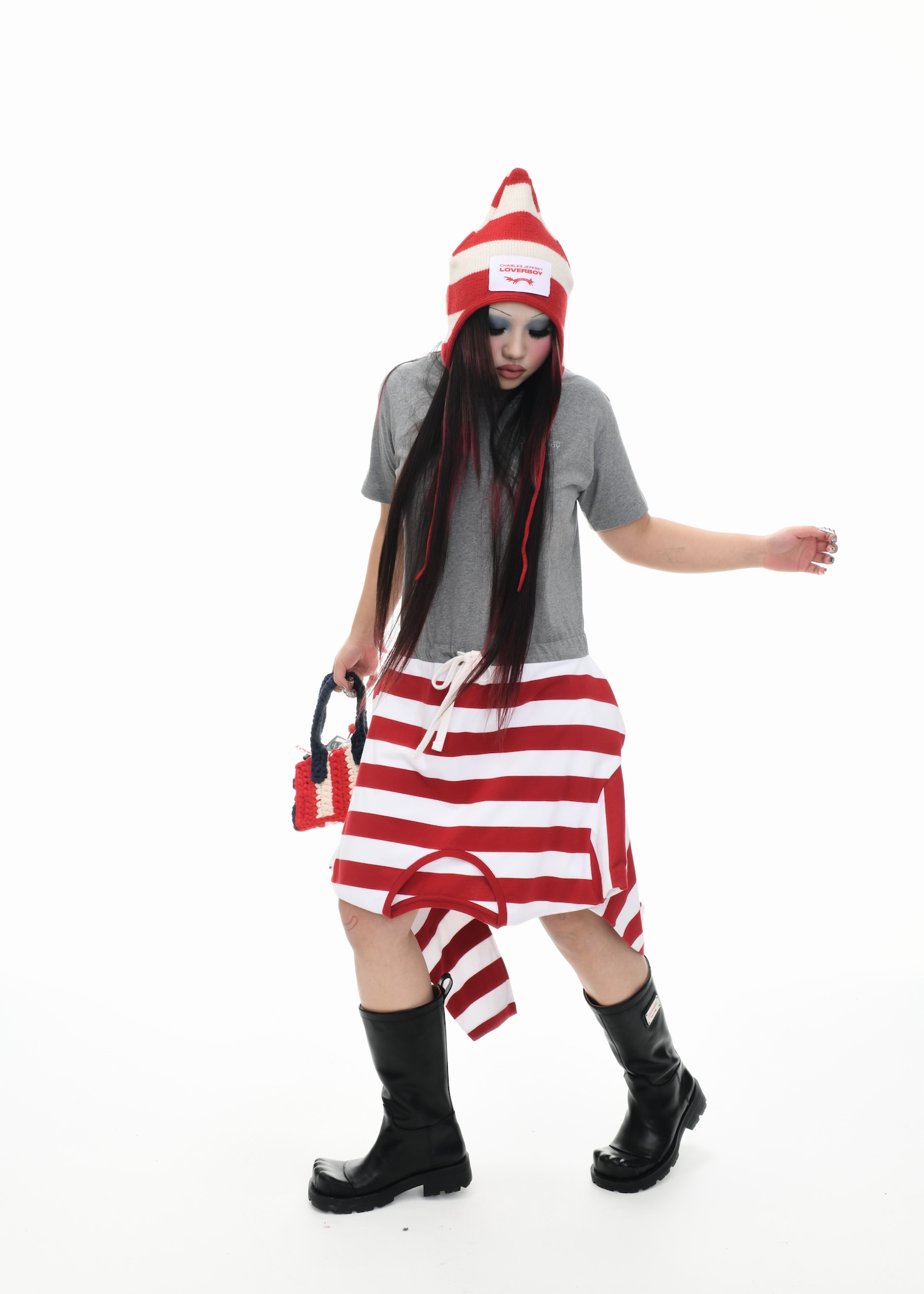 It’s an explosive collage of exaggerated tailoring, frayed crochet, Mallard-shaped handbags and sculptural ear beanies. If the collection channels a debauched aristocrat on a Victorian comedown, the visuals only push further. Non-binary models stare down the lens in distressed jersey and banana-peel silhouettes, the slogan ‘I Am a Product’ stamped across the chaos.