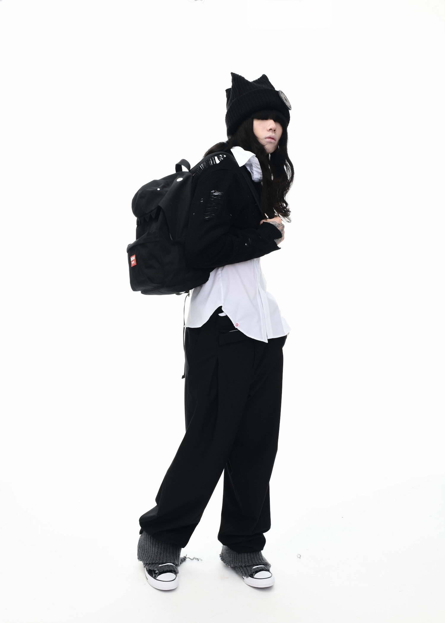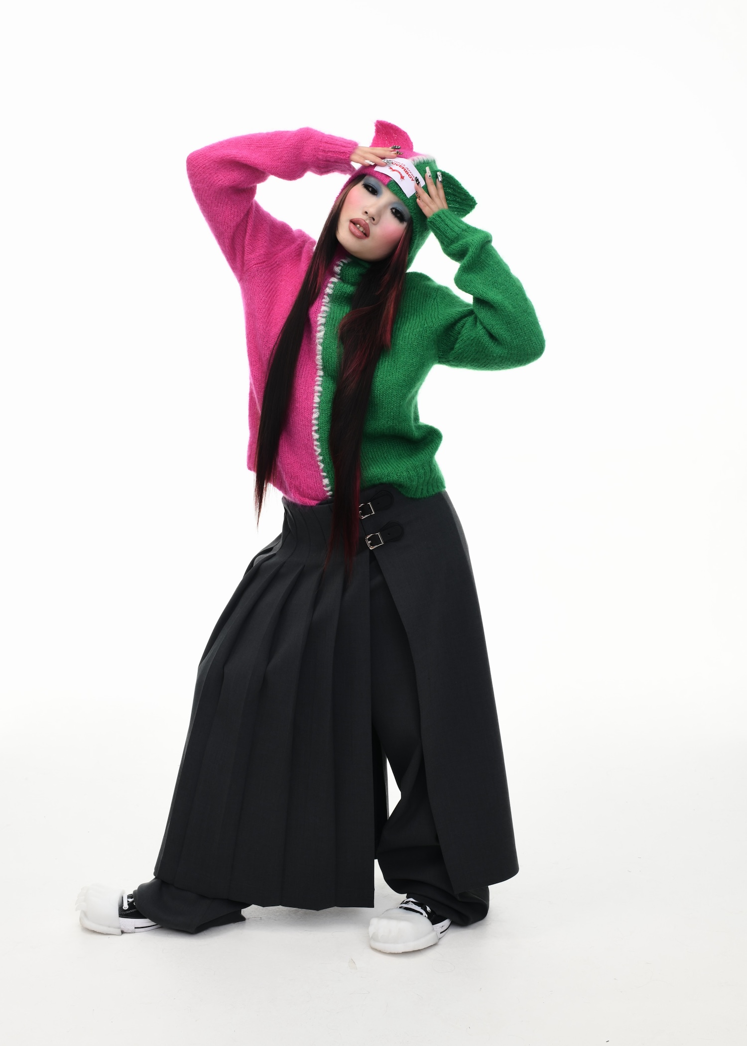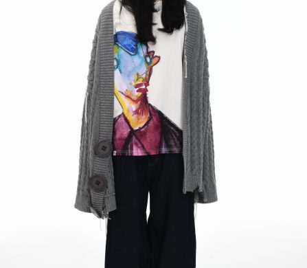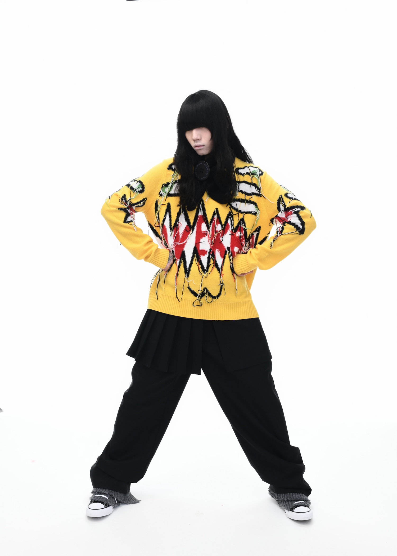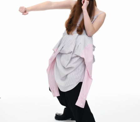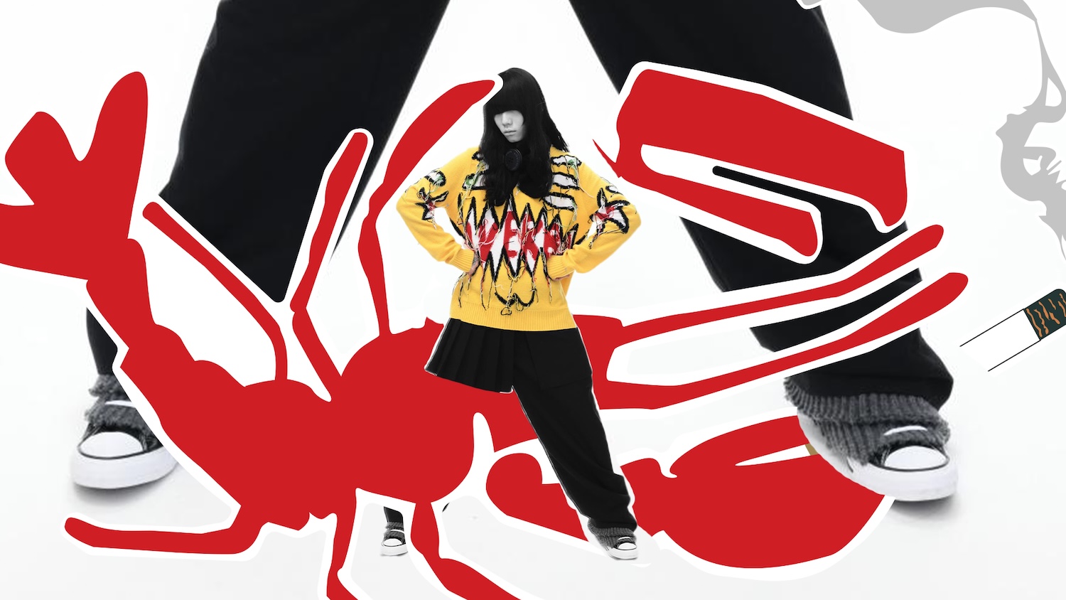 It’s an explosive collage of exaggerated tailoring, frayed crochet, Mallard-shaped handbags and sculptural ear beanies. If the collection channels a debauched aristocrat on a Victorian comedown, the visuals only push further. Non-binary models stare down the lens in distressed jersey and banana-peel silhouettes, the slogan ‘I Am a Product’ stamped across the chaos.