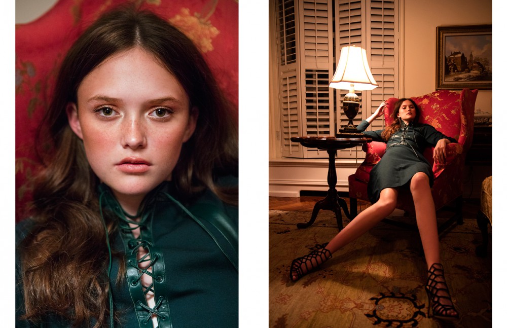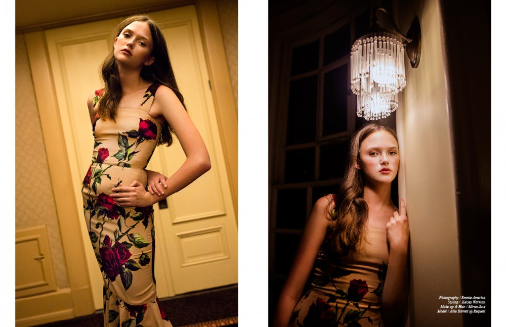 We make our way through dimly lit corridors and hotel rooms to find model Allie Barrett photographed by Emmie America and styled by Kelsey Warman using Yoji Yamamoto, Dior and Dolce & Gabbana.