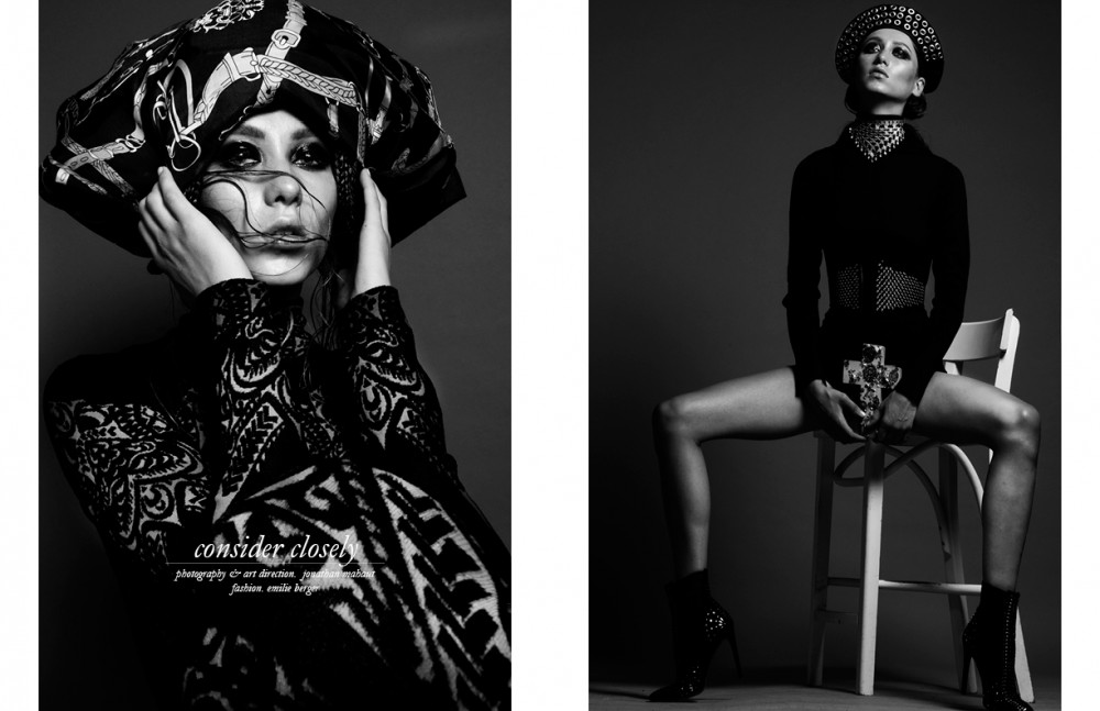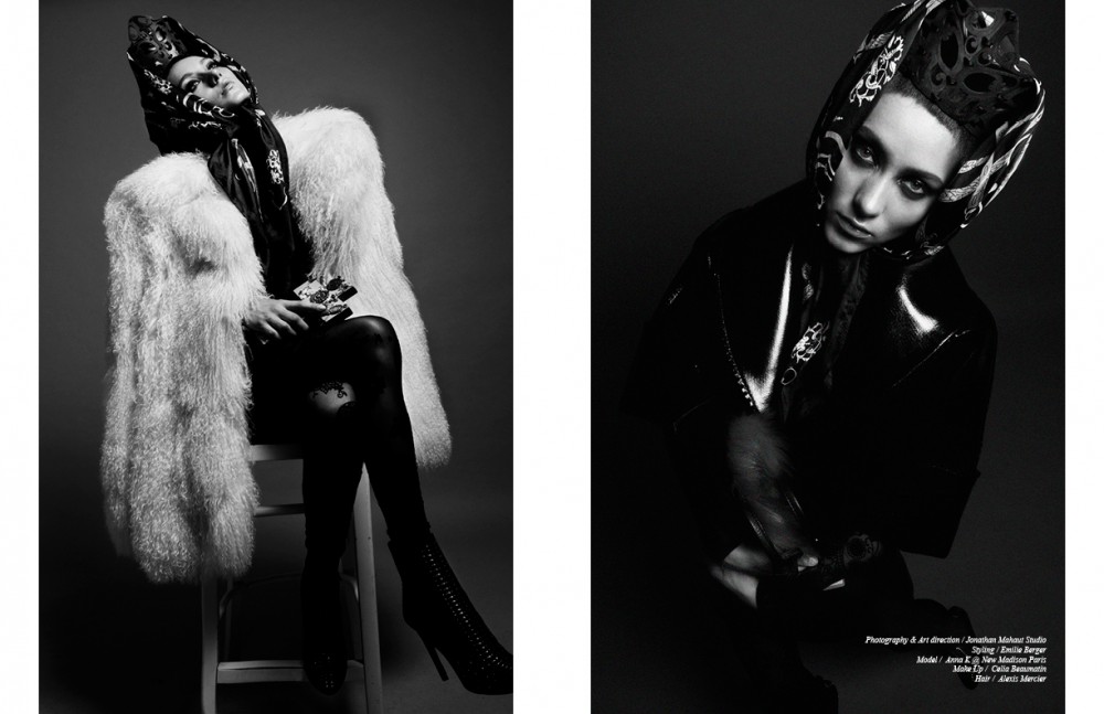 Photographer Jonathan Mahaut captures stark contrasts on camera in this Schön! online editorial. Stylist Emilie Berger fashions timeless silhouettes with statement pieces by Azzedine Alaïa, Versace and Diesel Black Gold.
