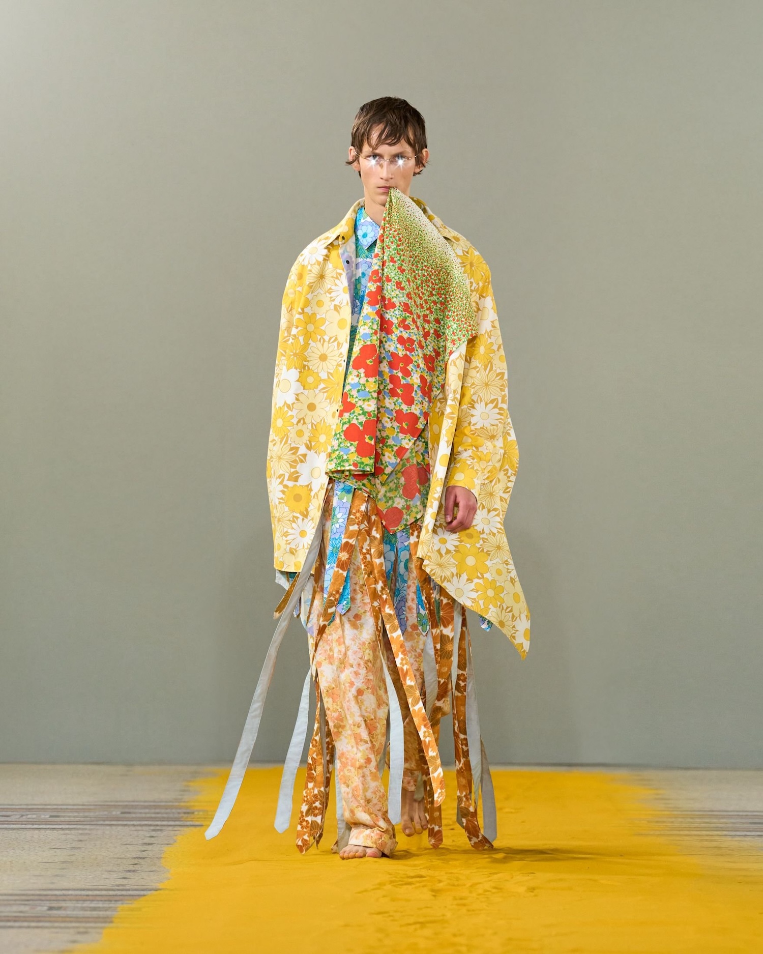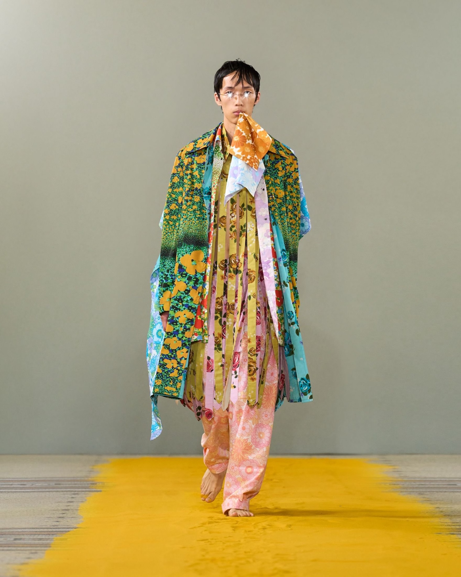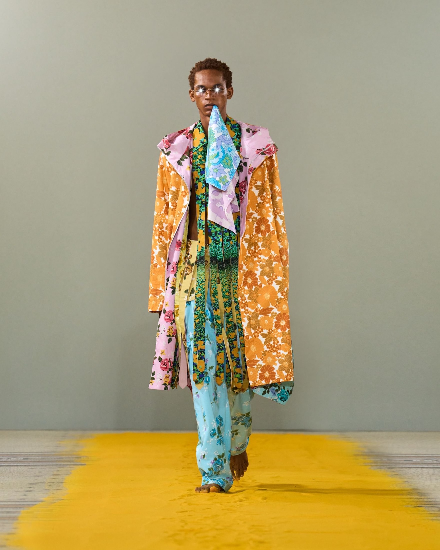 A highlight was a sandblasted parka inspired by fishermen’s attire, softened by weathered textures and accented with Alpine floral belts. Later, coat-length dreamcoats burst forth in vivid neon florals reminiscent of dyed bedsheets, showcasing Green’s delight in pushing creative boundaries.