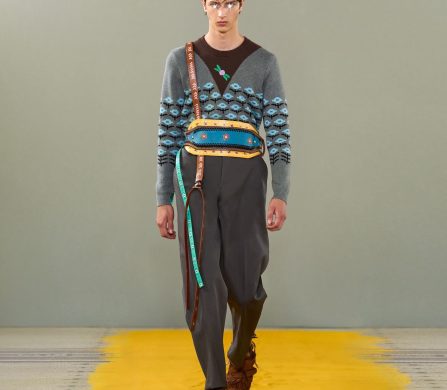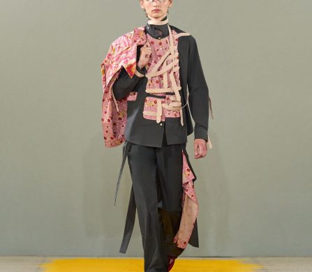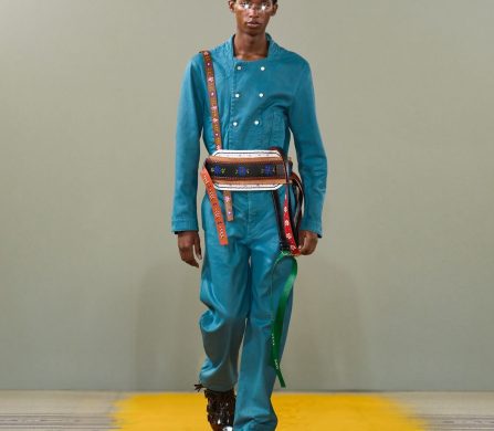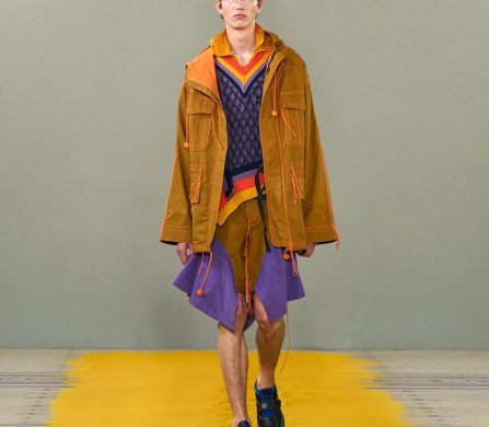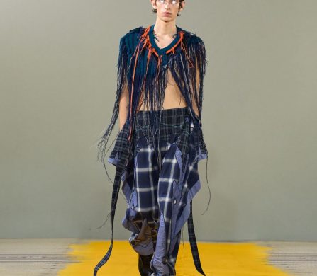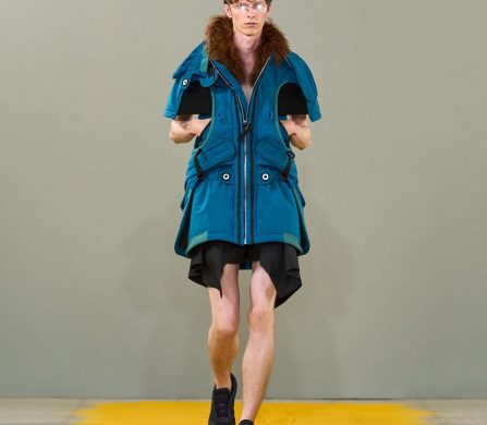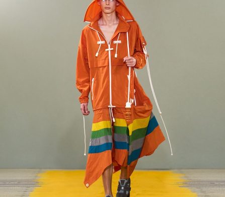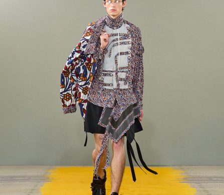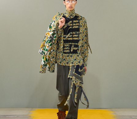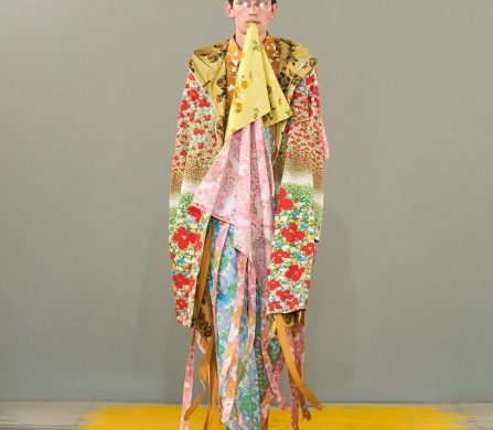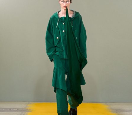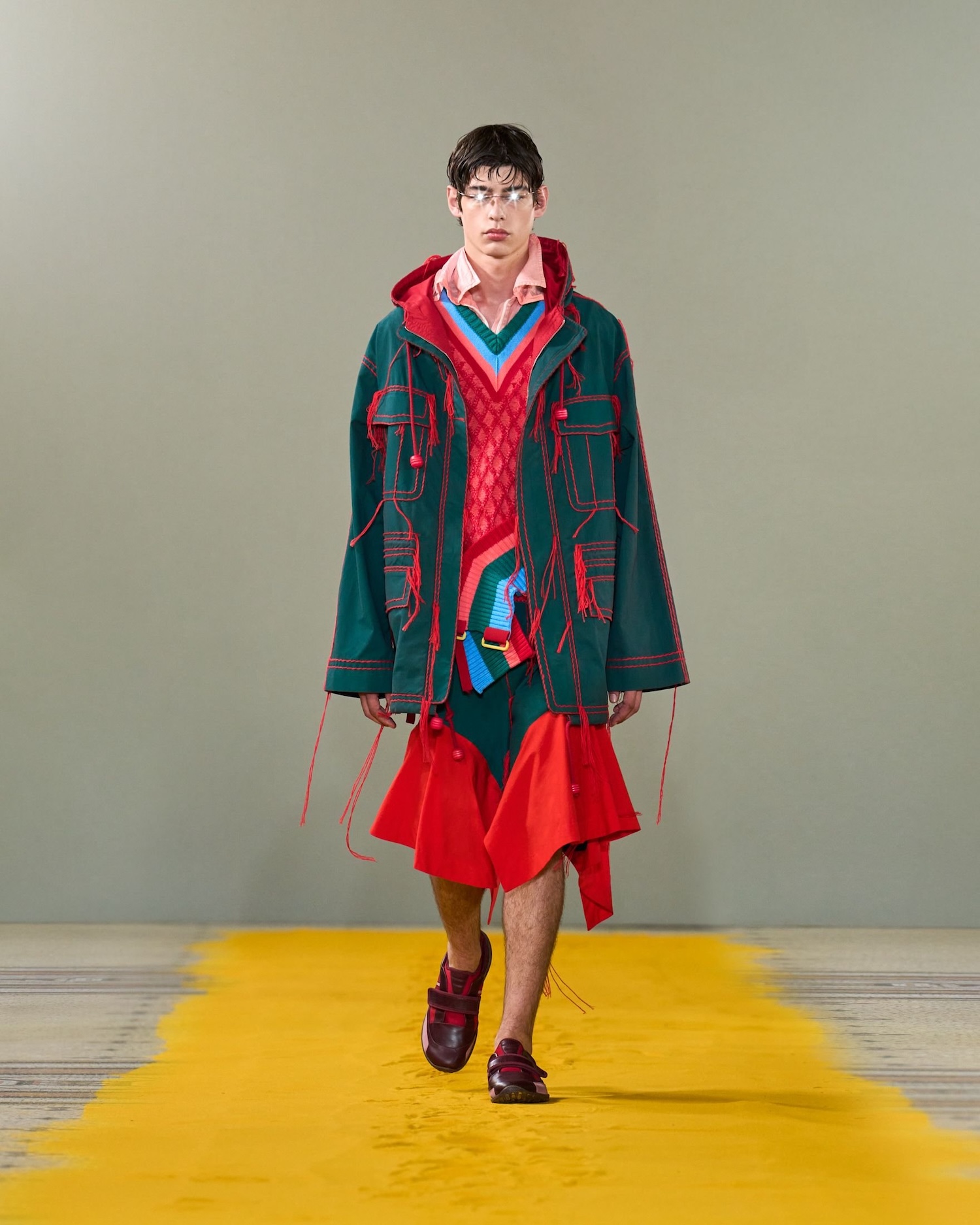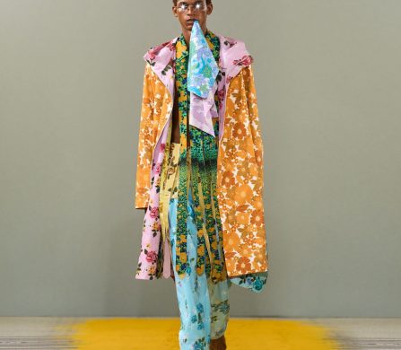 A highlight was a sandblasted parka inspired by fishermen’s attire, softened by weathered textures and accented with Alpine floral belts. Later, coat-length dreamcoats burst forth in vivid neon florals reminiscent of dyed bedsheets, showcasing Green’s delight in pushing creative boundaries.
