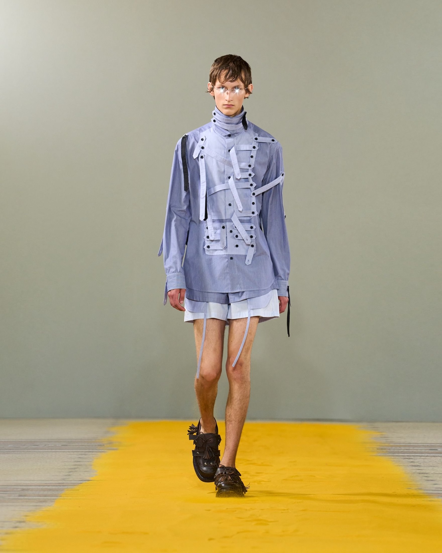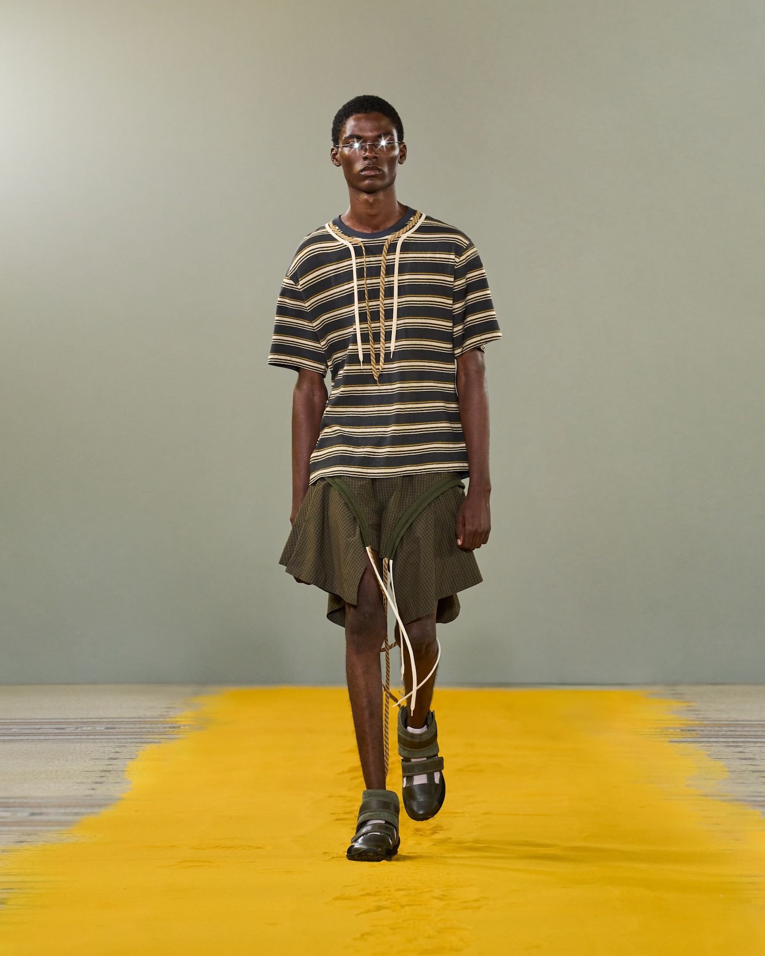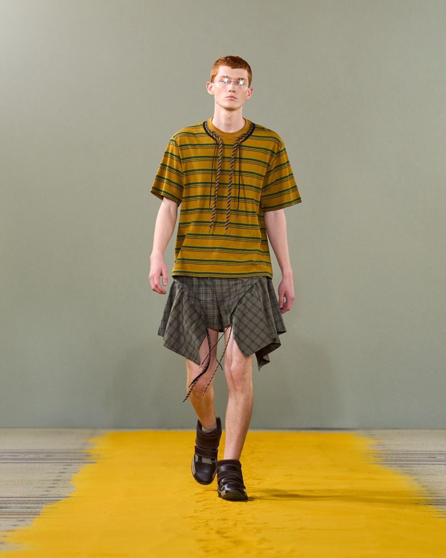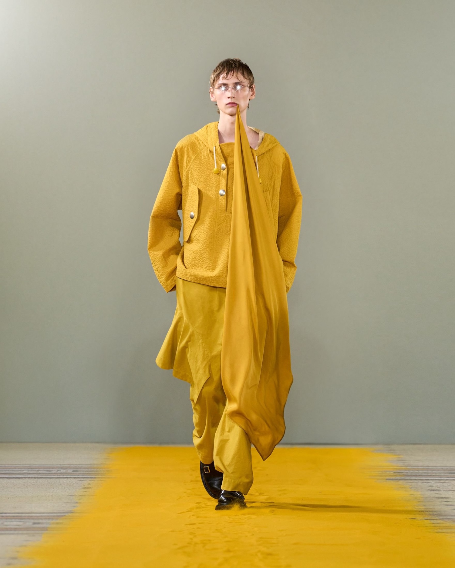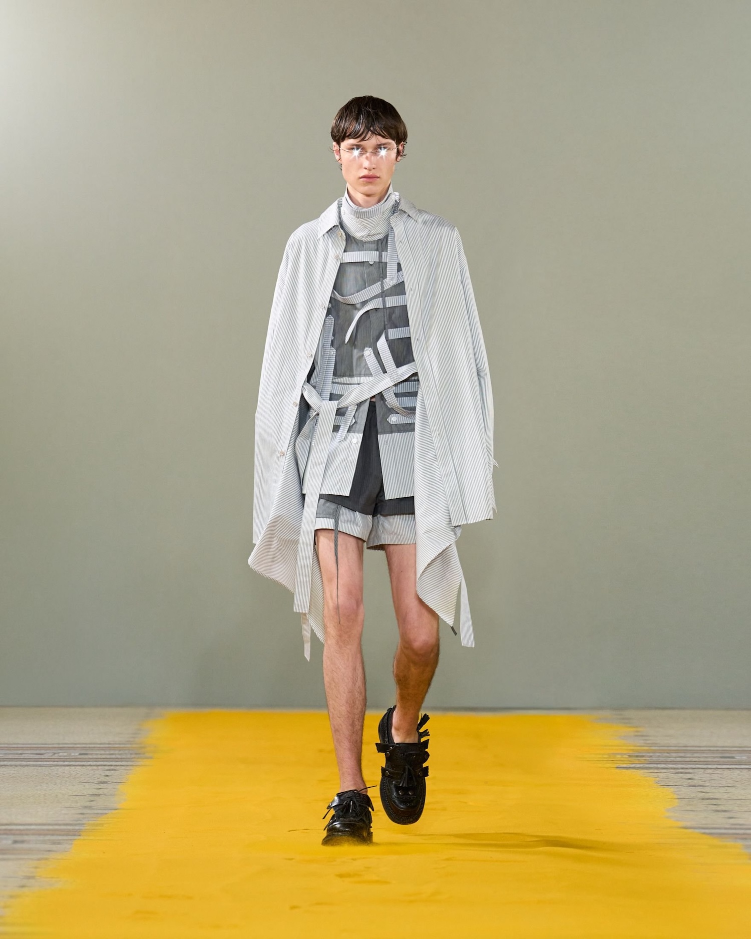Craig Green’s return to Paris for SS26 felt like flipping a cherished vinyl record to the B-side again and again: familiar melodies reshaped into something intriguingly new. “Like sand gathered in pockets and hems, outfits remember things,” wrote Green in the show notes, and that was visibly evident from the start. The runway was dusted with fine, raw yellow sand (the type you see in an hourglass), evoking a sense of memory and atmosphere. After all, reflection and transformation were the mood board for the collection.