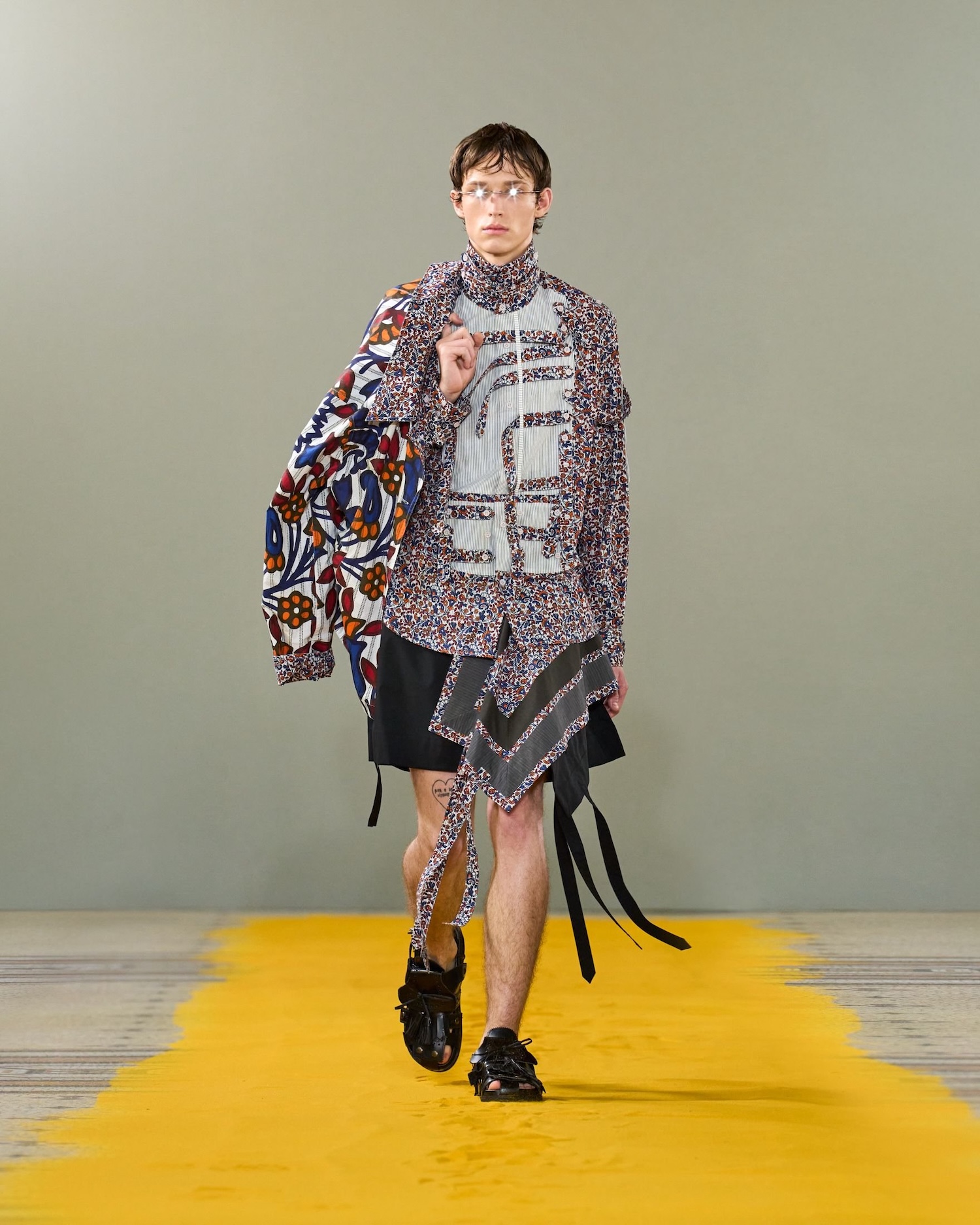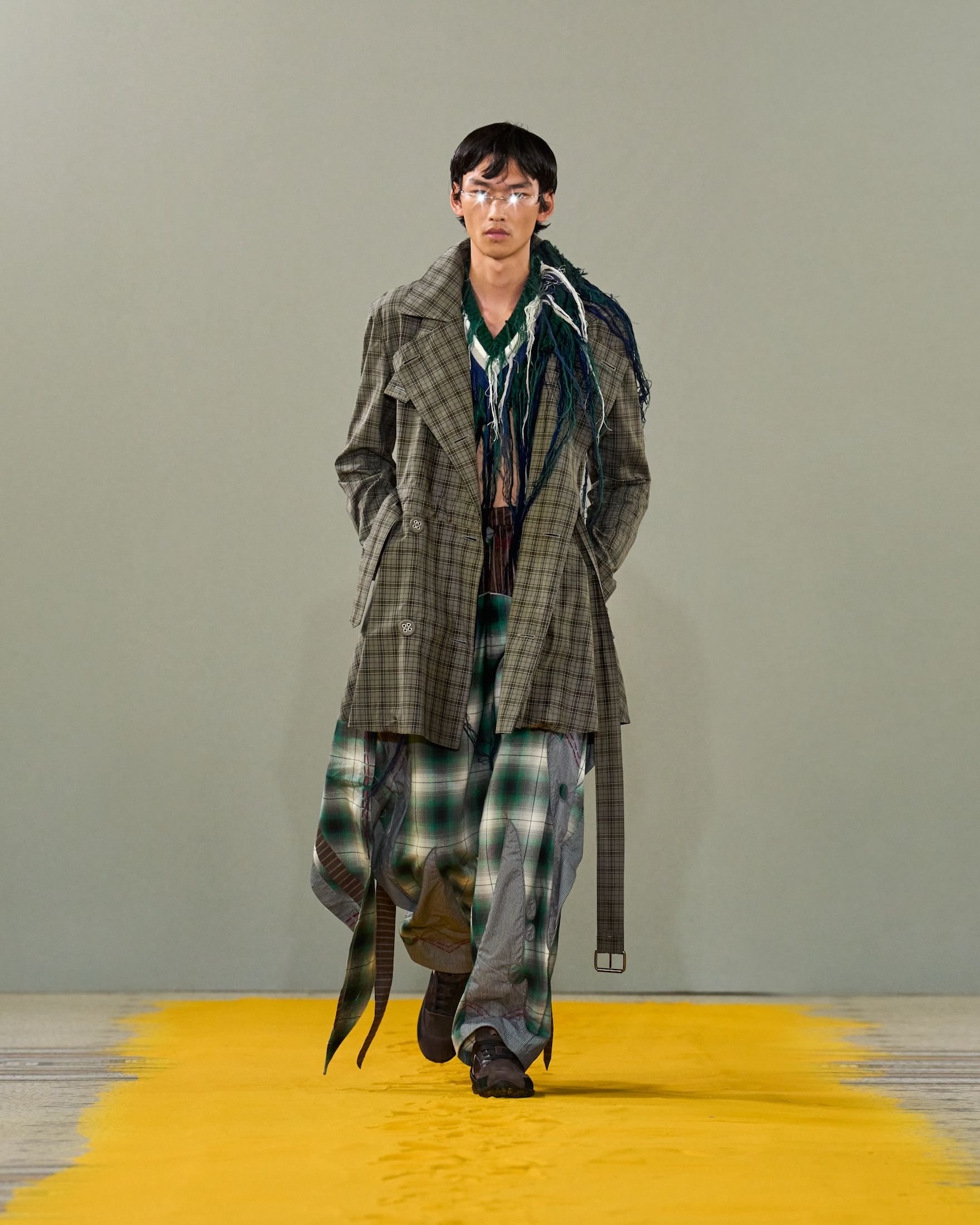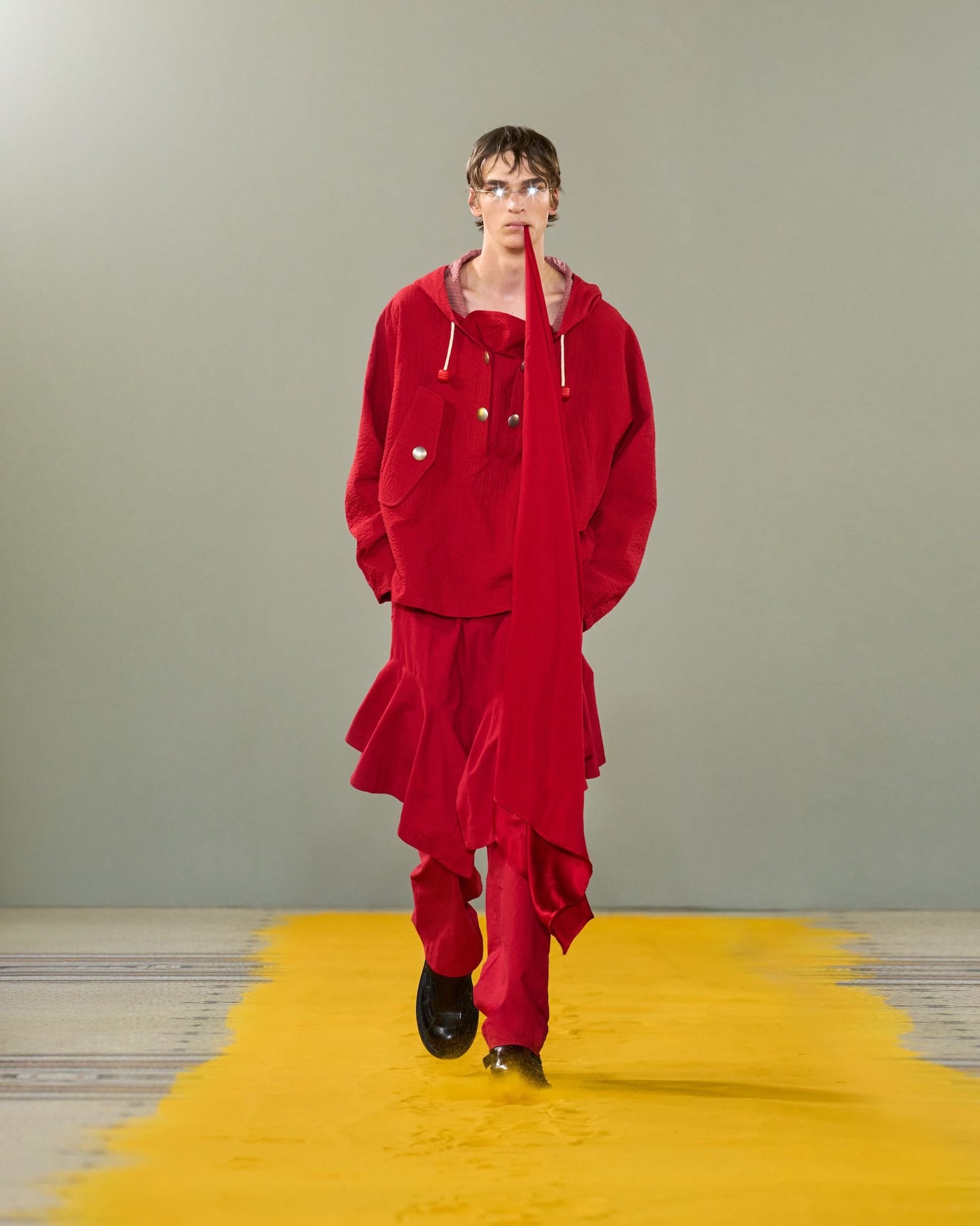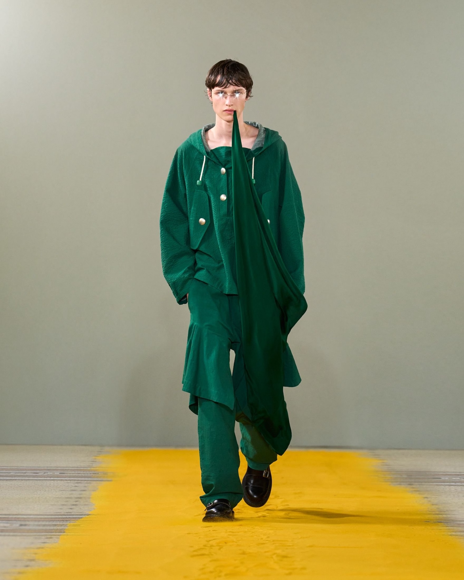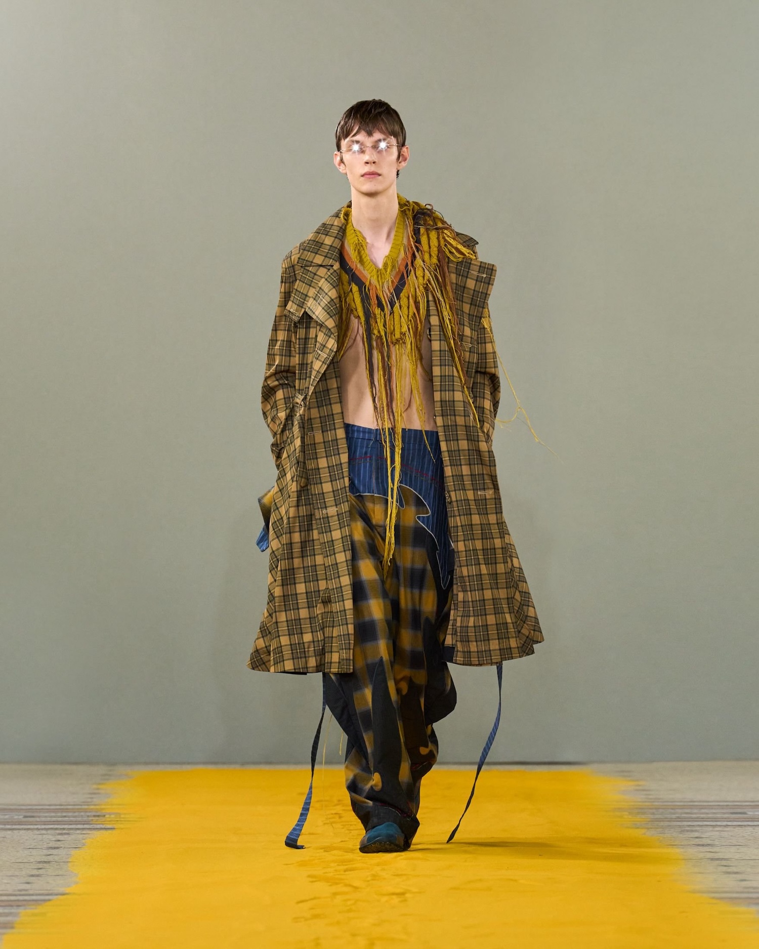 Craig Green’s return to Paris for SS26 felt like flipping a cherished vinyl record to the B-side again and again: familiar melodies reshaped into something intriguingly new. “Like sand gathered in pockets and hems, outfits remember things,” wrote Green in the show notes, and that was visibly evident from the start. The runway was dusted with fine, raw yellow sand (the type you see in an hourglass), evoking a sense of memory and atmosphere. After all, reflection and transformation were the mood board for the collection.