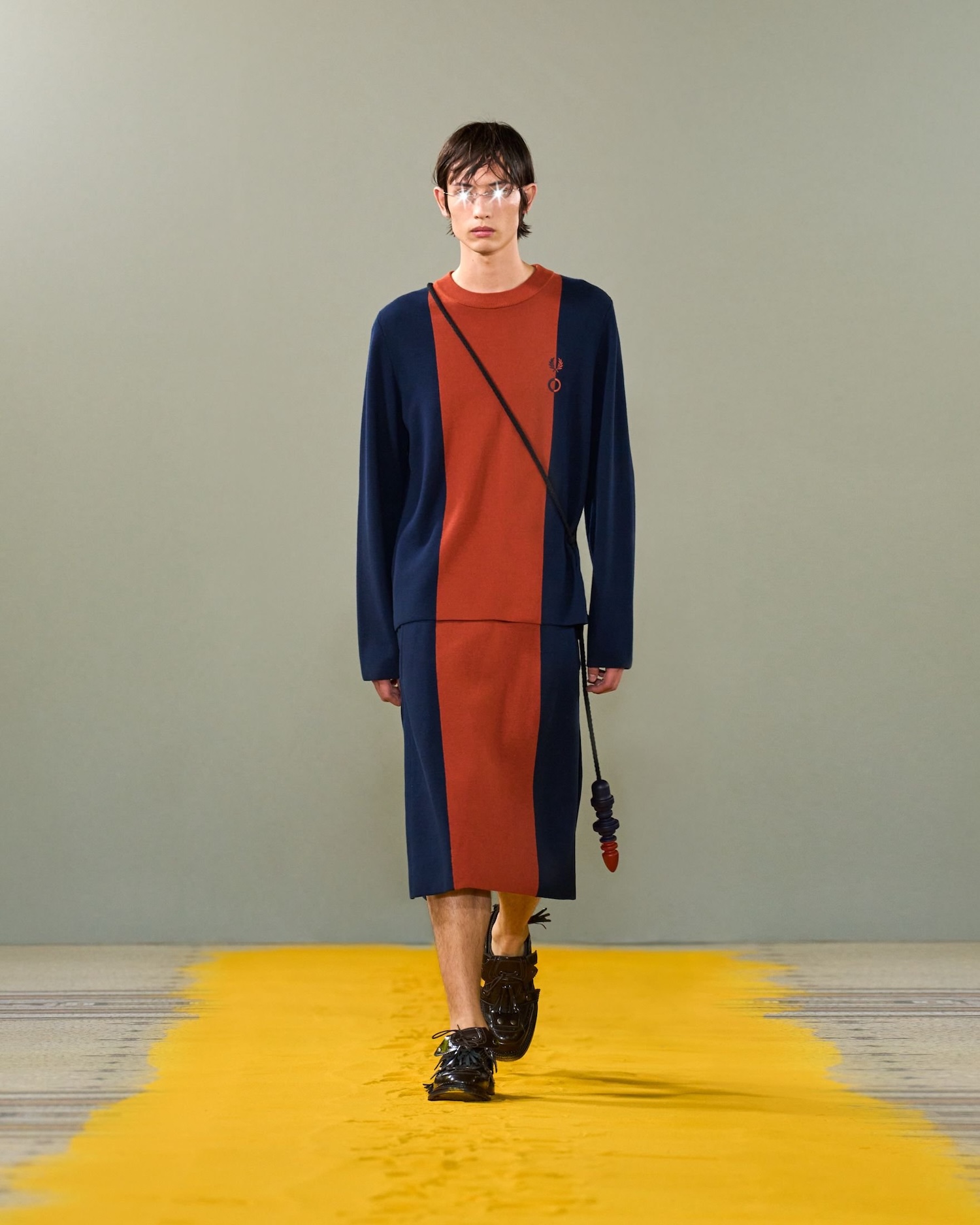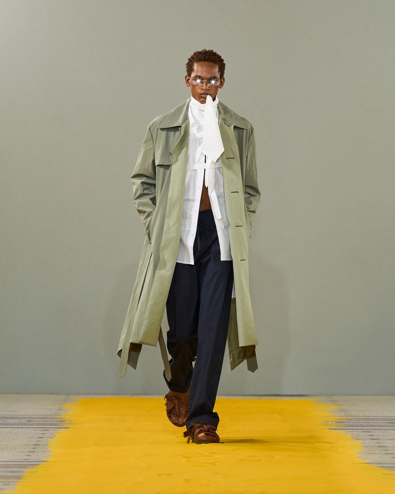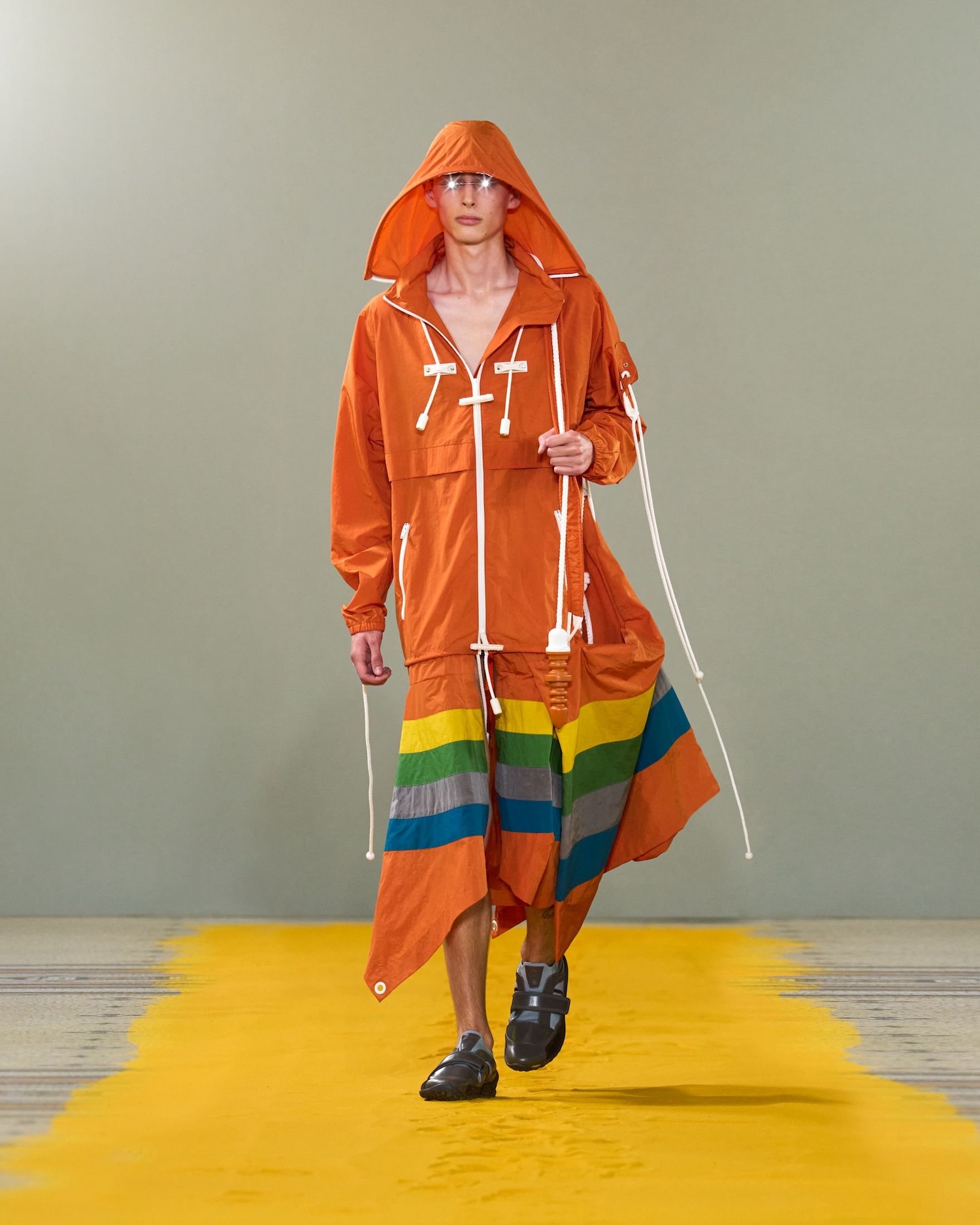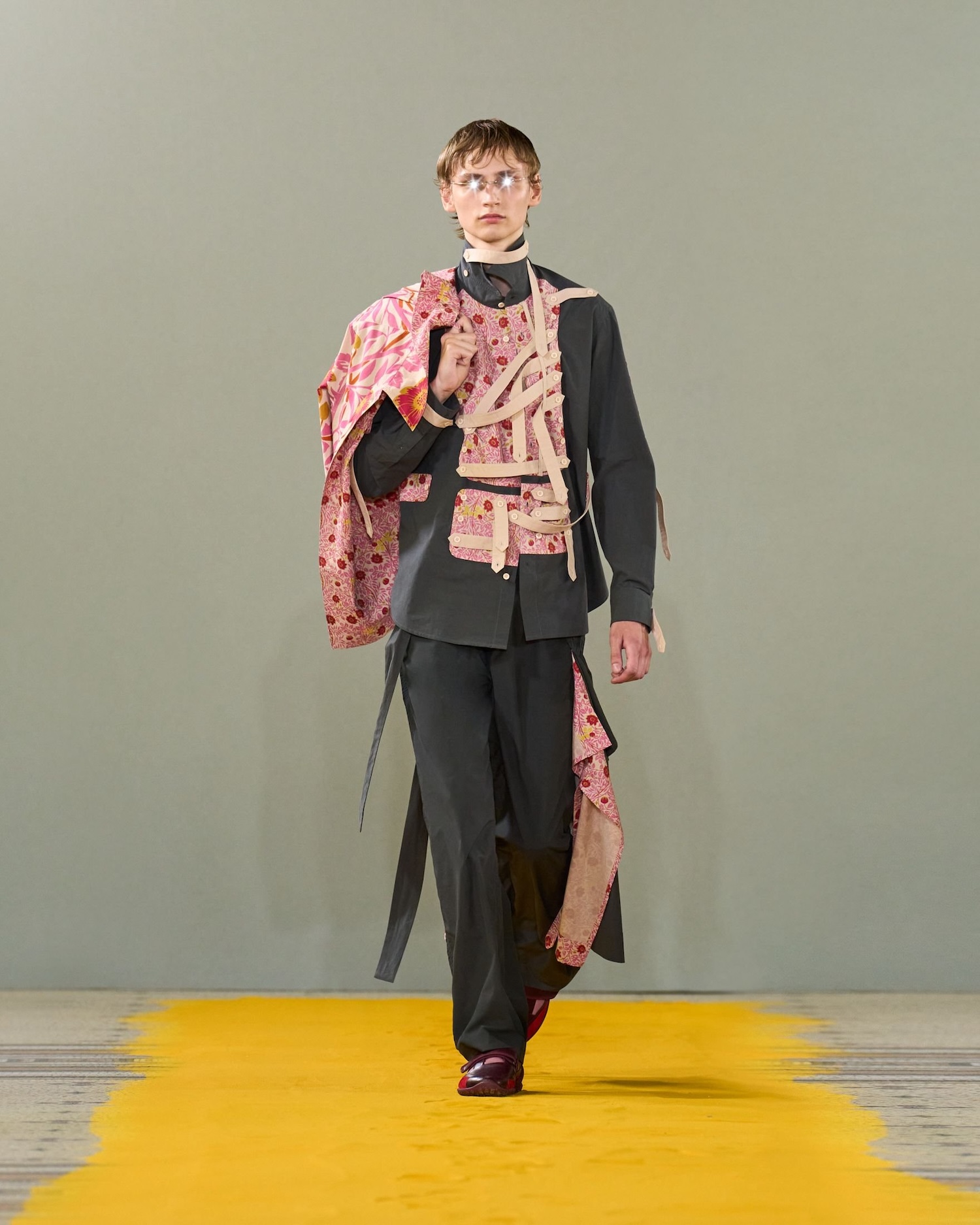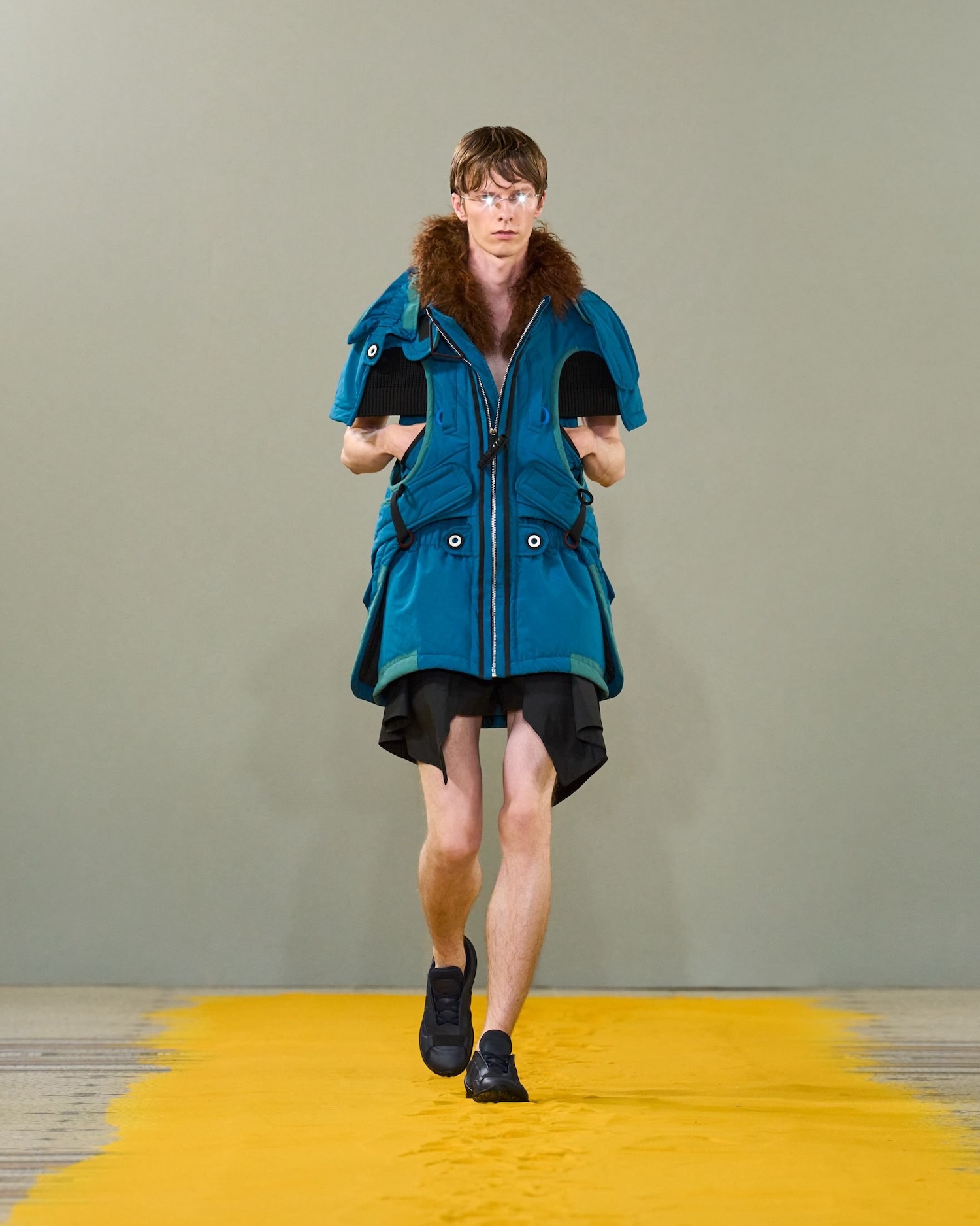 Craig Green’s return to Paris for SS26 felt like flipping a cherished vinyl record to the B-side again and again: familiar melodies reshaped into something intriguingly new. “Like sand gathered in pockets and hems, outfits remember things,” wrote Green in the show notes, and that was visibly evident from the start. The runway was dusted with fine, raw yellow sand (the type you see in an hourglass), evoking a sense of memory and atmosphere. After all, reflection and transformation were the mood board for the collection.