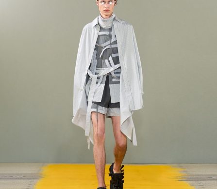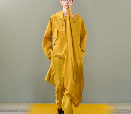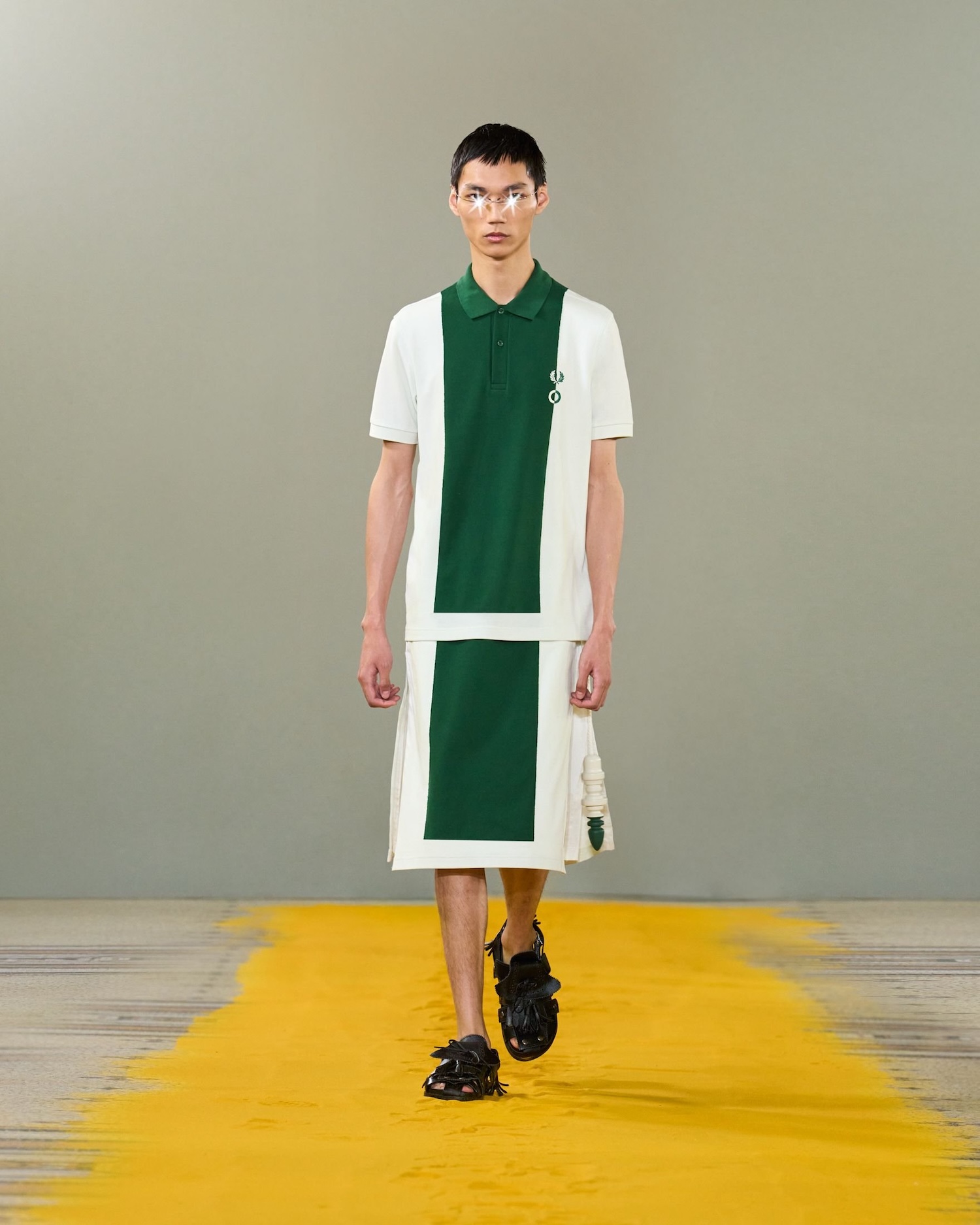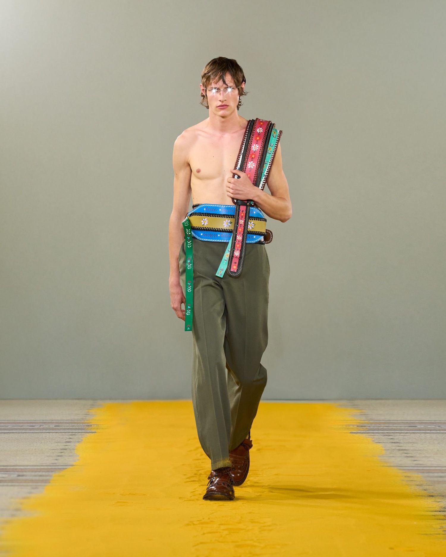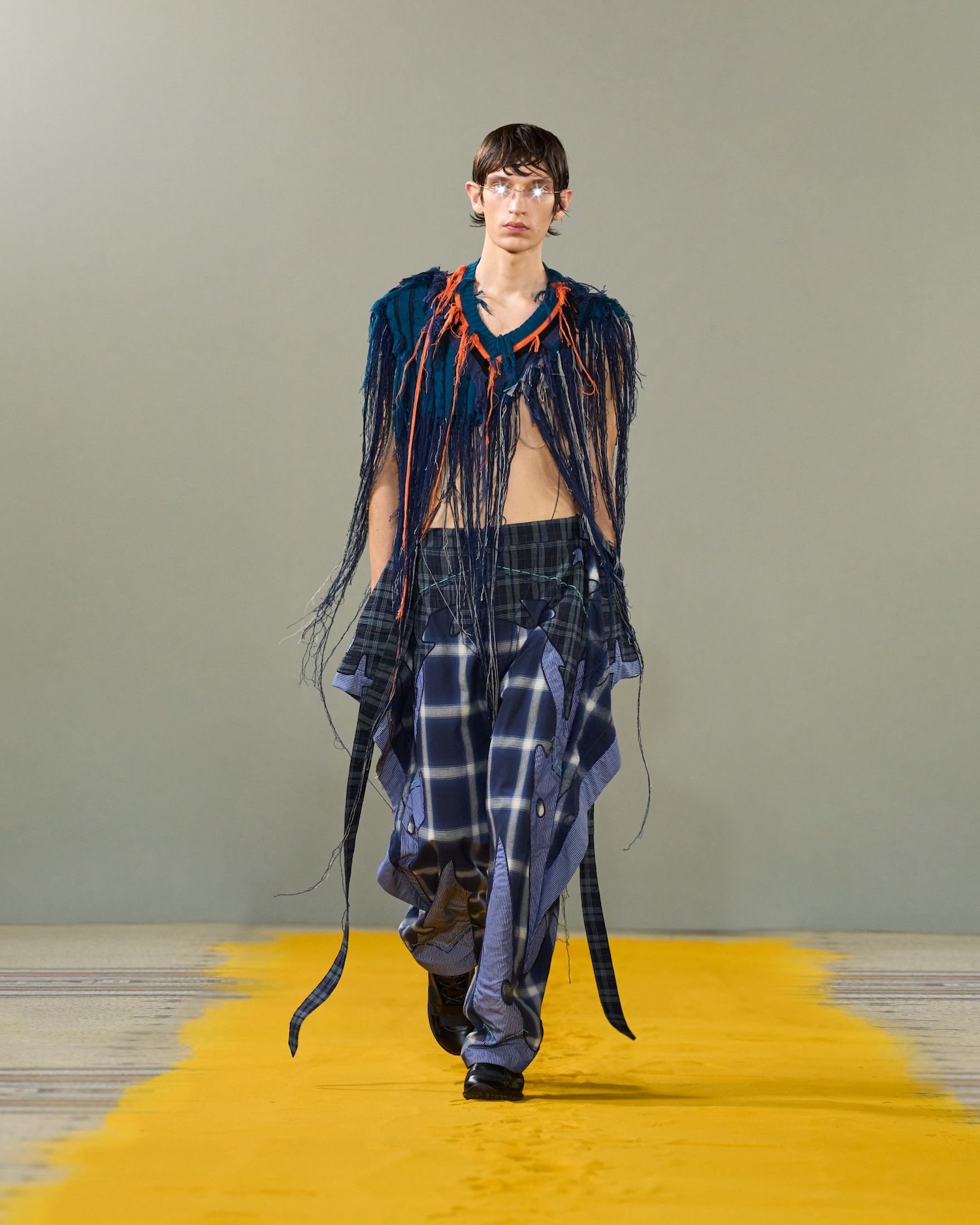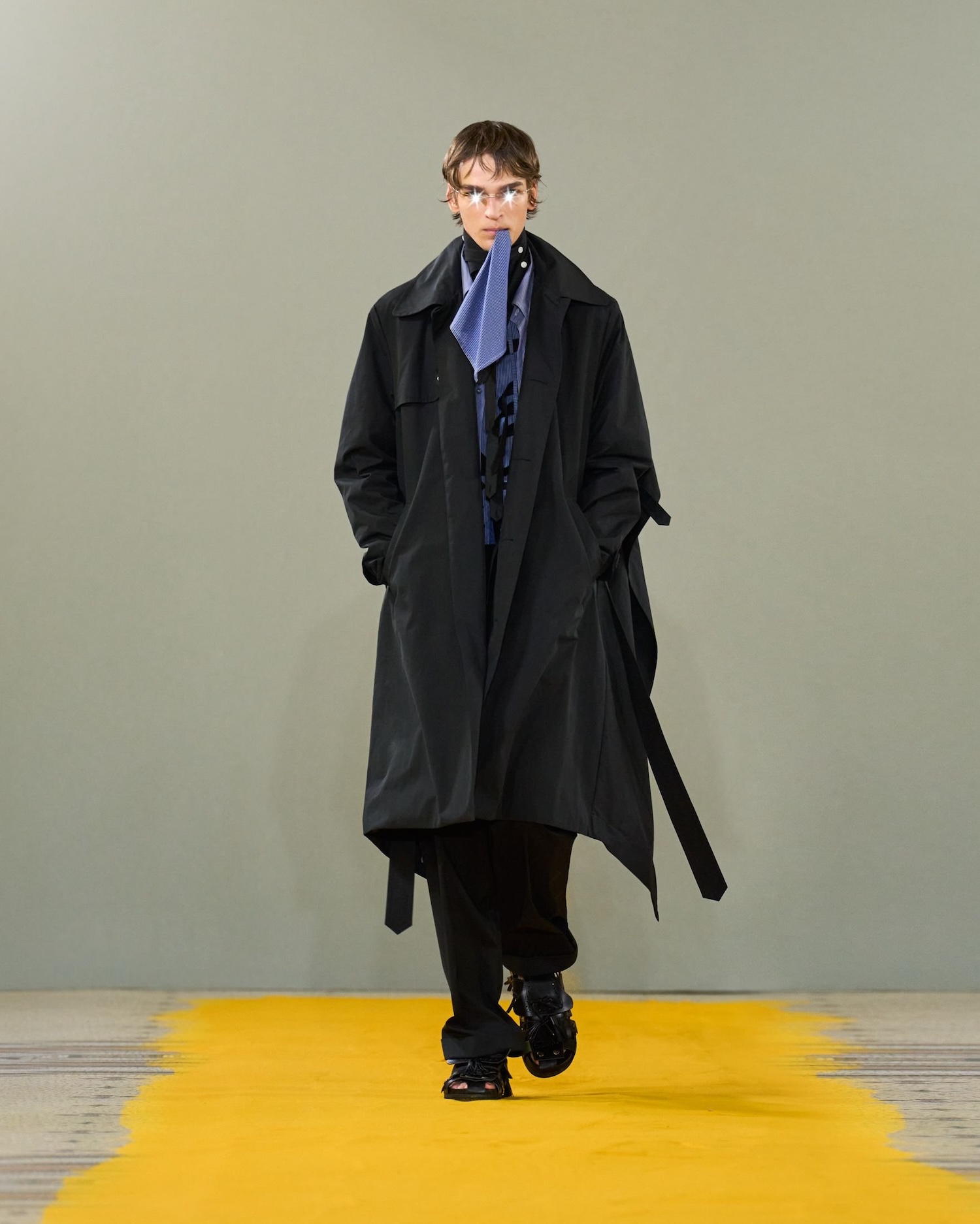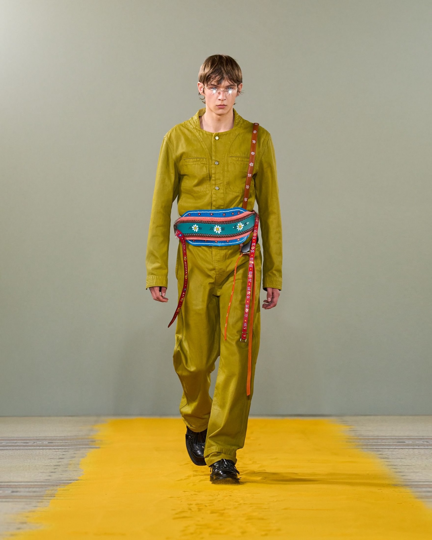 Craig Green’s return to Paris for SS26 felt like flipping a cherished vinyl record to the B-side again and again: familiar melodies reshaped into something intriguingly new. “Like sand gathered in pockets and hems, outfits remember things,” wrote Green in the show notes, and that was visibly evident from the start. The runway was dusted with fine, raw yellow sand (the type you see in an hourglass), evoking a sense of memory and atmosphere. After all, reflection and transformation were the mood board for the collection.