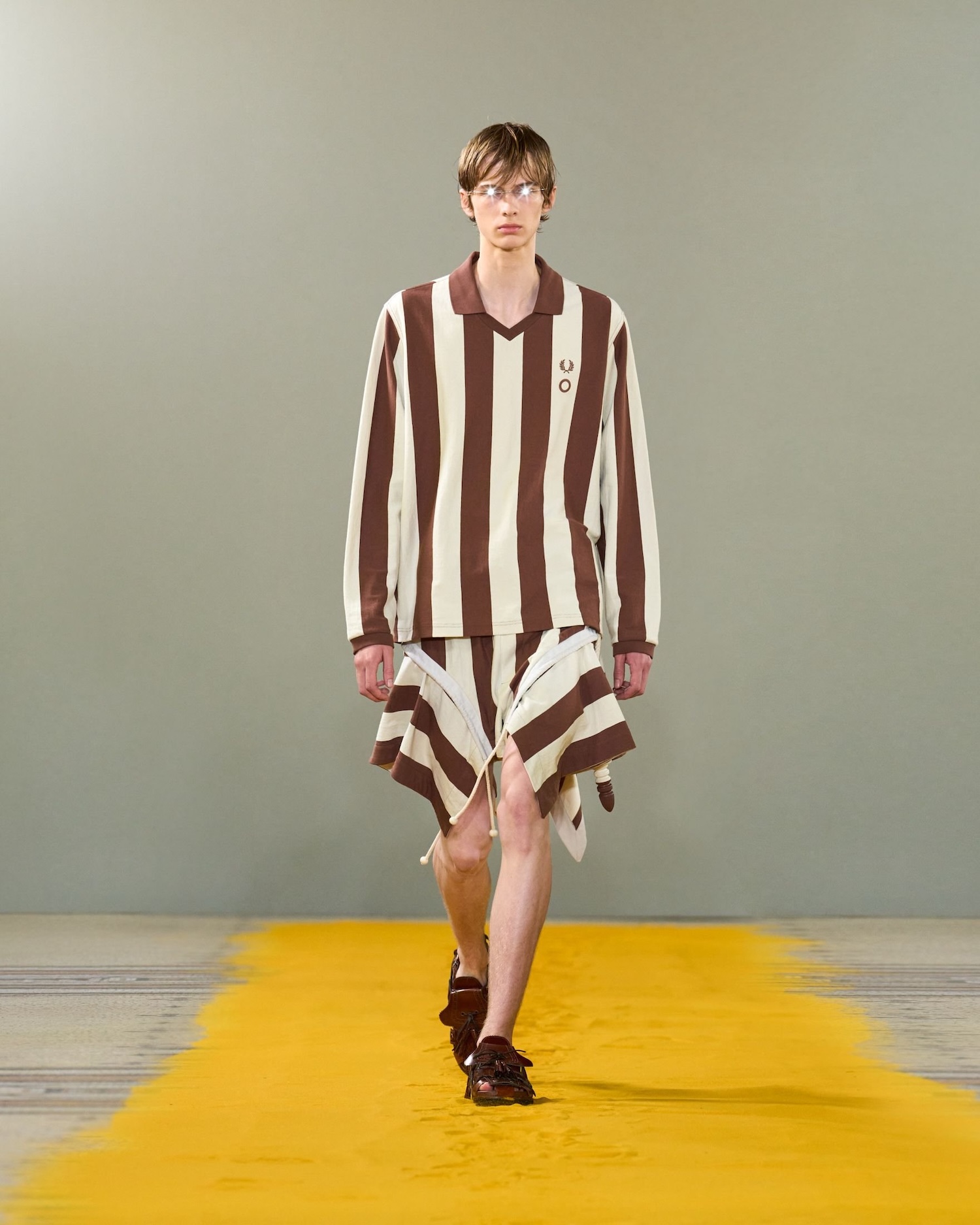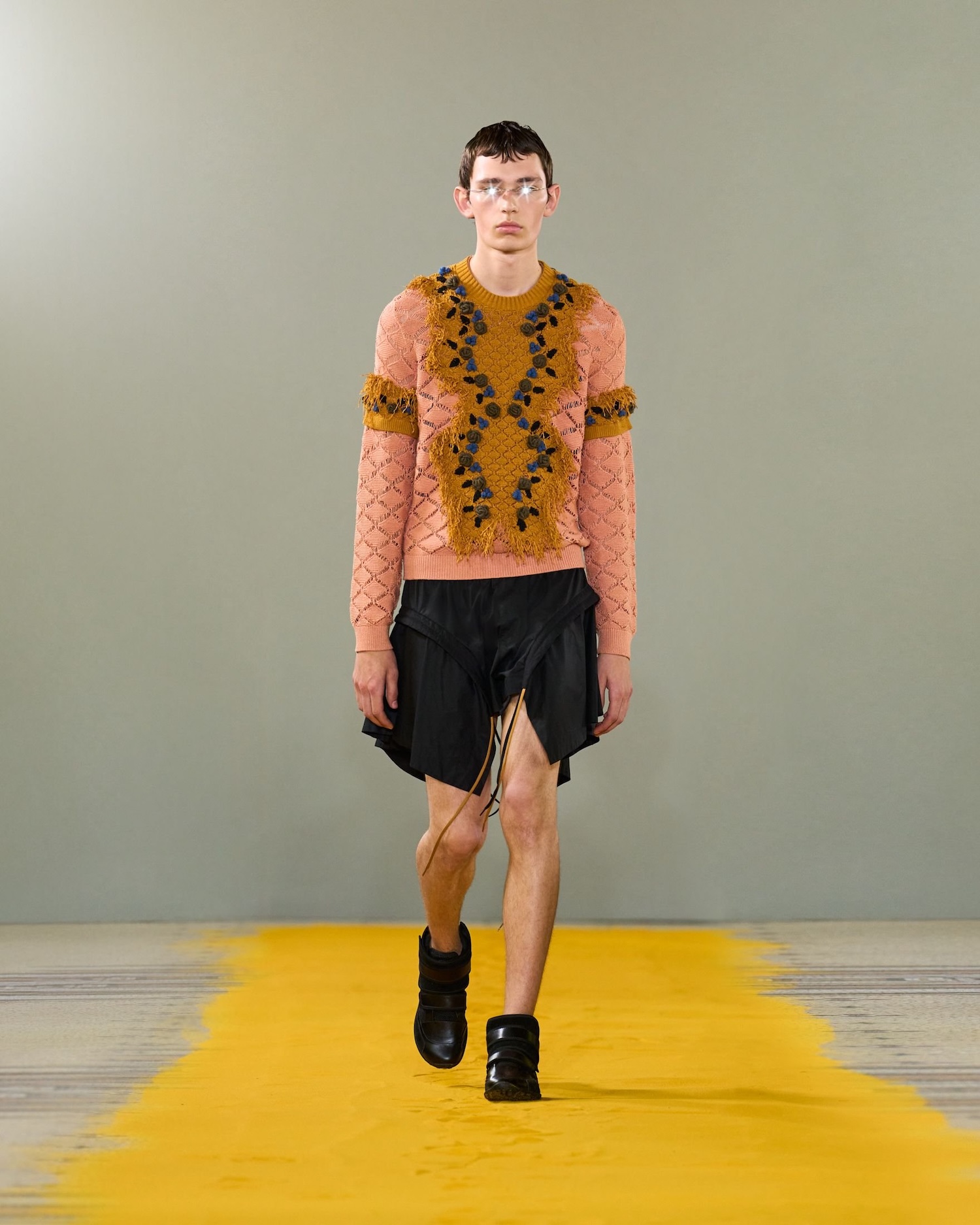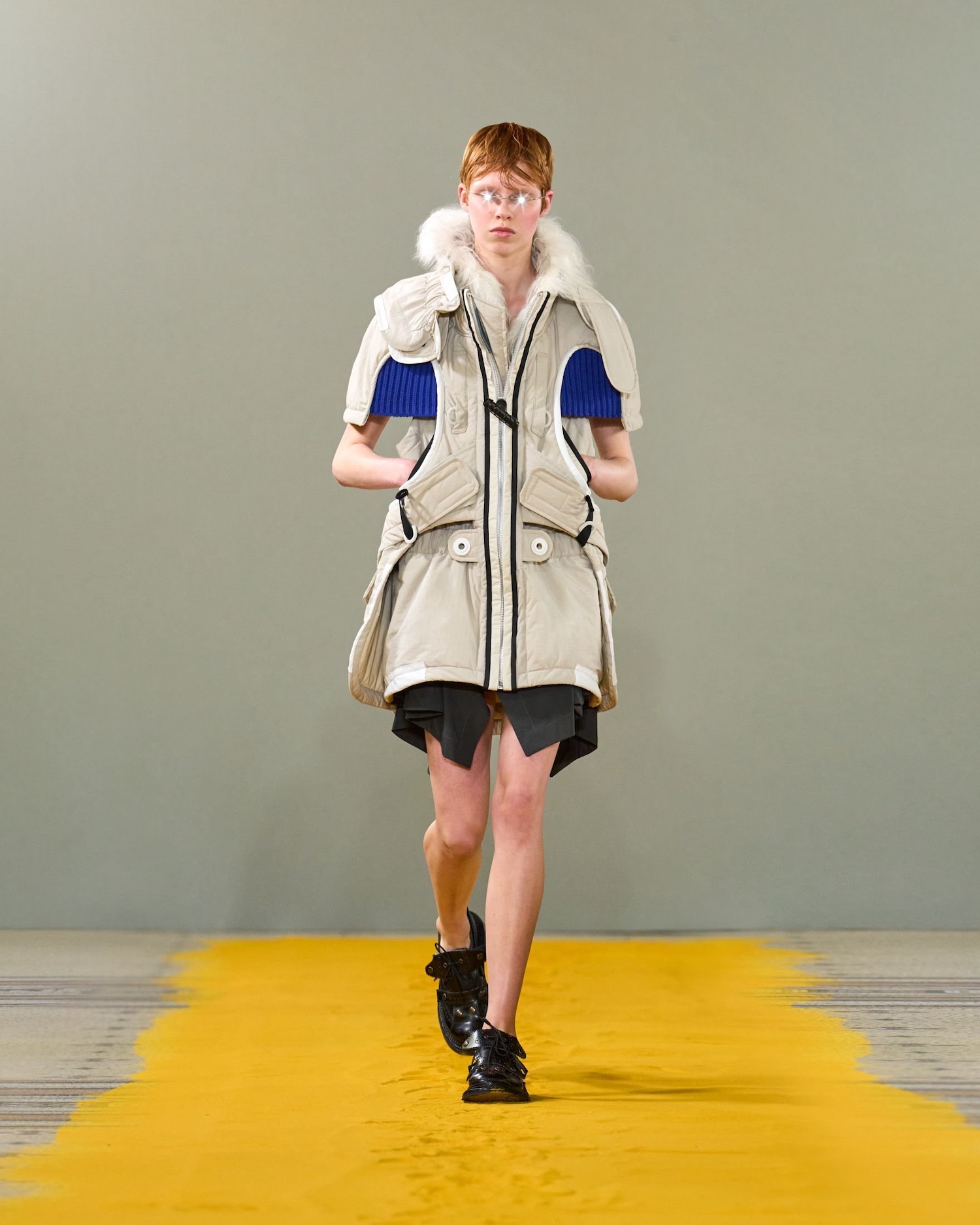 Drawing inspiration from The Beatles’ late-1960s psychedelic surge, the British designer spoke backstage about their remarkable creative burst, a spirit that infused his work with layered textures and unexpected combinations. Military-style parkas blended seamlessly into skirts, shirts were embellished with vintage floral appliqués, and airy knits featured deliberate tears along the plackets. Sand was also implemented physically into the collection, cuddled in pockets and hems.