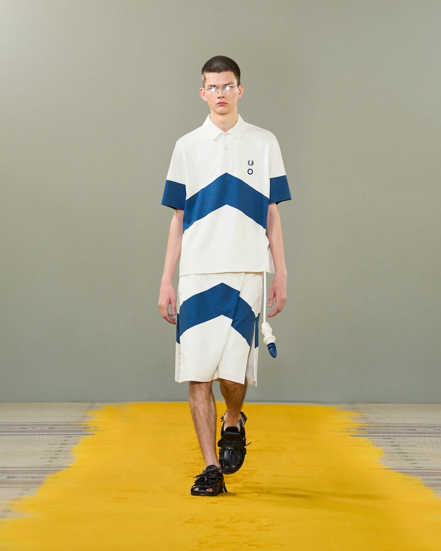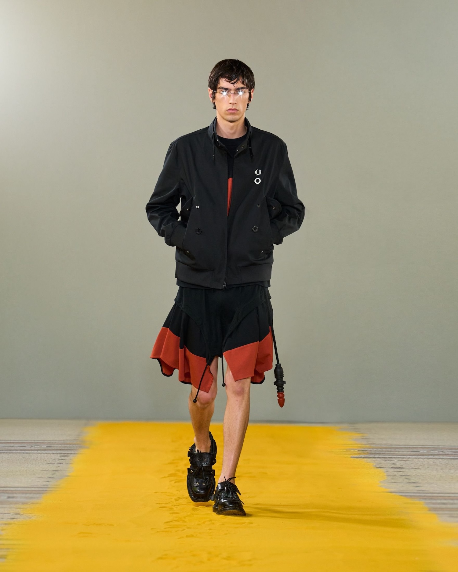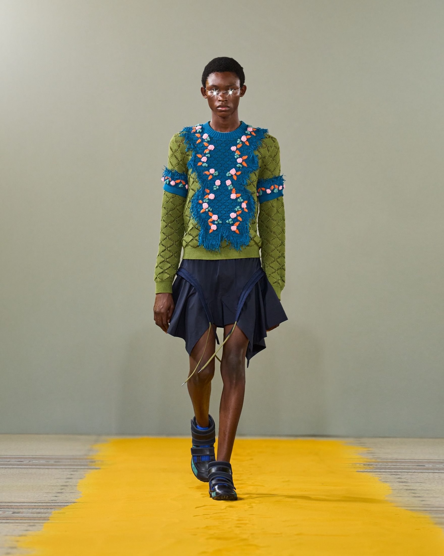 Drawing inspiration from The Beatles’ late-1960s psychedelic surge, the British designer spoke backstage about their remarkable creative burst, a spirit that infused his work with layered textures and unexpected combinations. Military-style parkas blended seamlessly into skirts, shirts were embellished with vintage floral appliqués, and airy knits featured deliberate tears along the plackets. Sand was also implemented physically into the collection, cuddled in pockets and hems.
