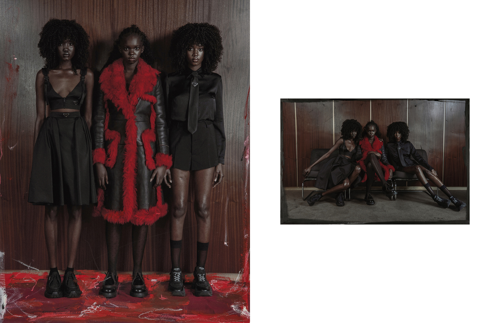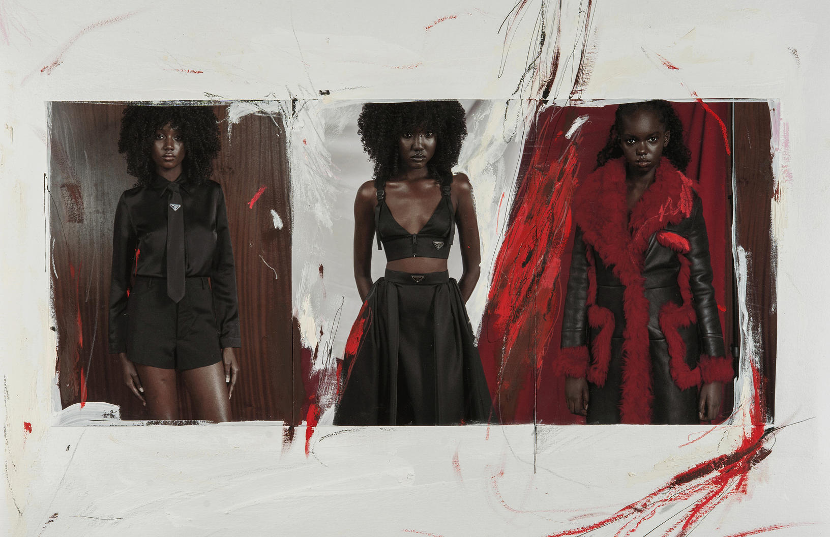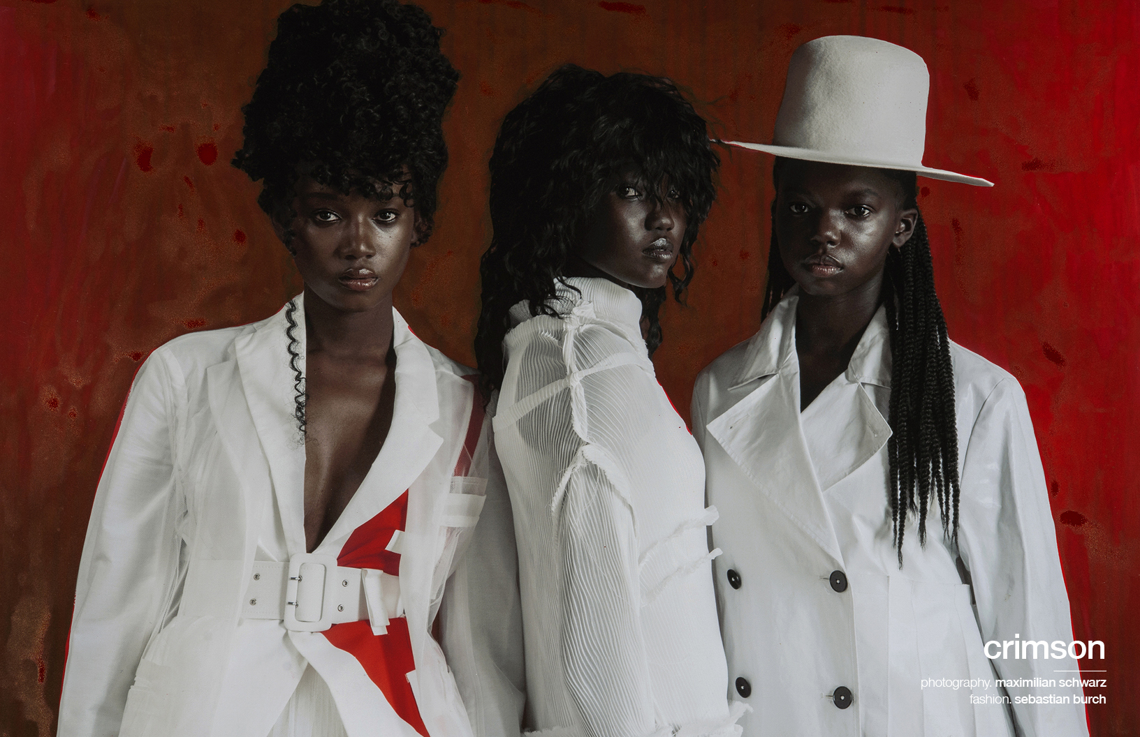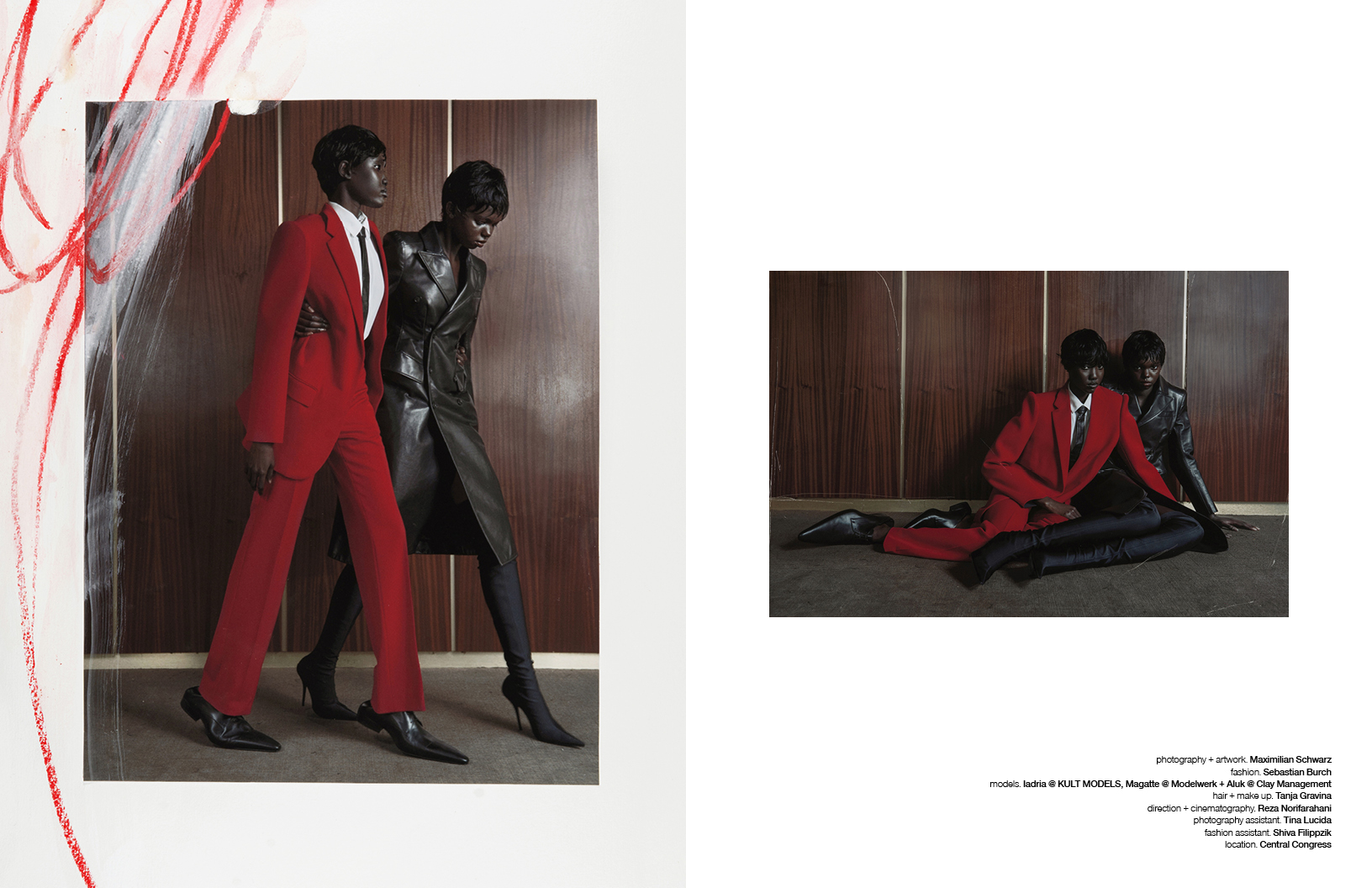Crimson red flashes throughout this Schön! editorial produced by photographer Maximilian Schwarz with direction and cinematography by Reza Norifarahani. Fashion is by Sebastian Burch who dresses Iadria, Magatte and Aluk in looks by Comme des Garçons, Jil Sander, Prada and others, with hair and make up by Tanja Gravina.