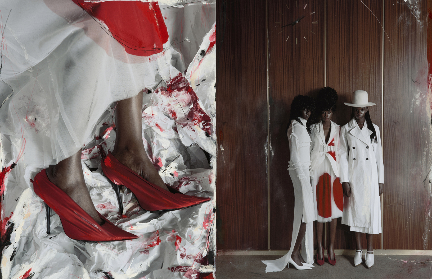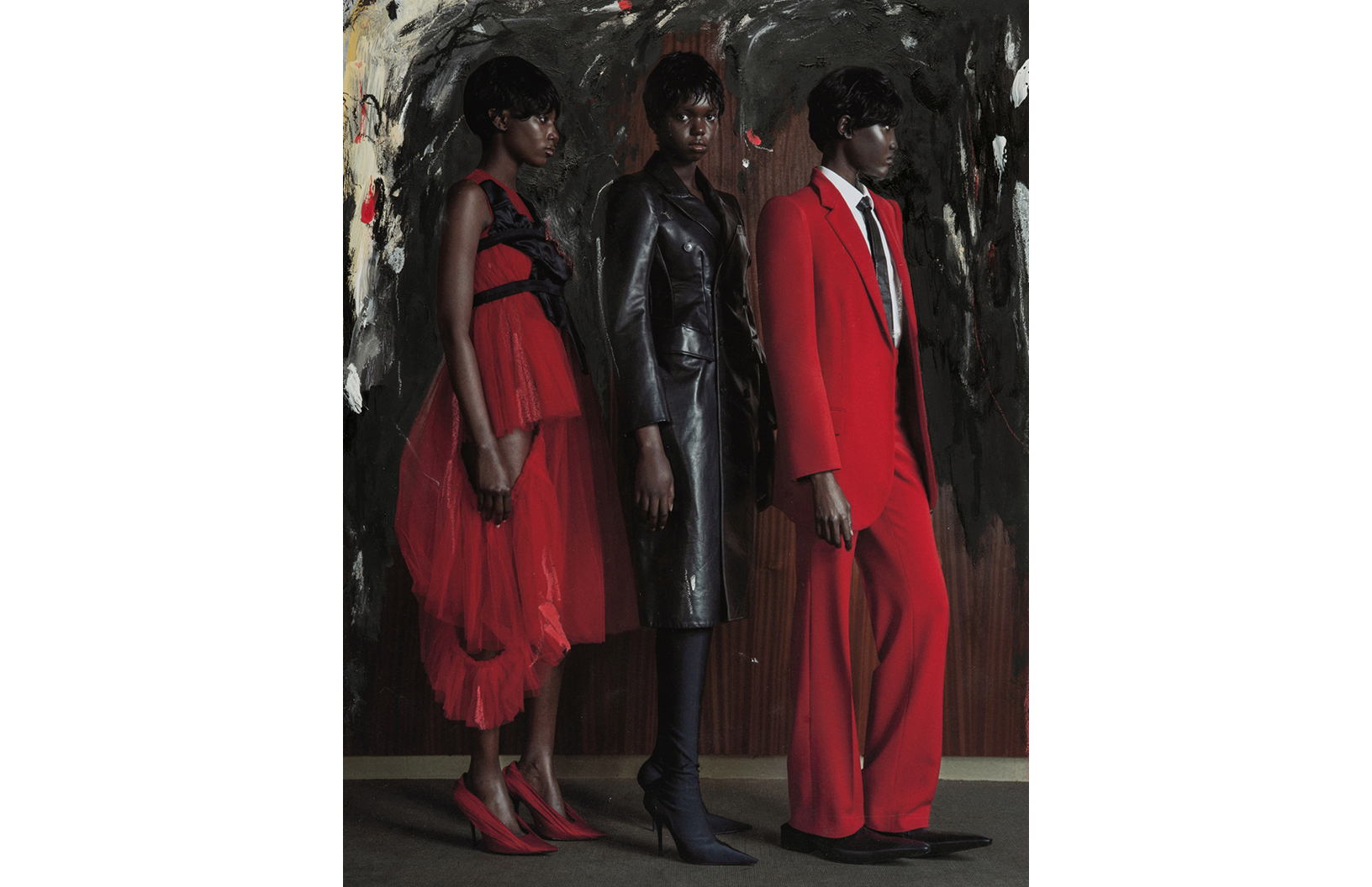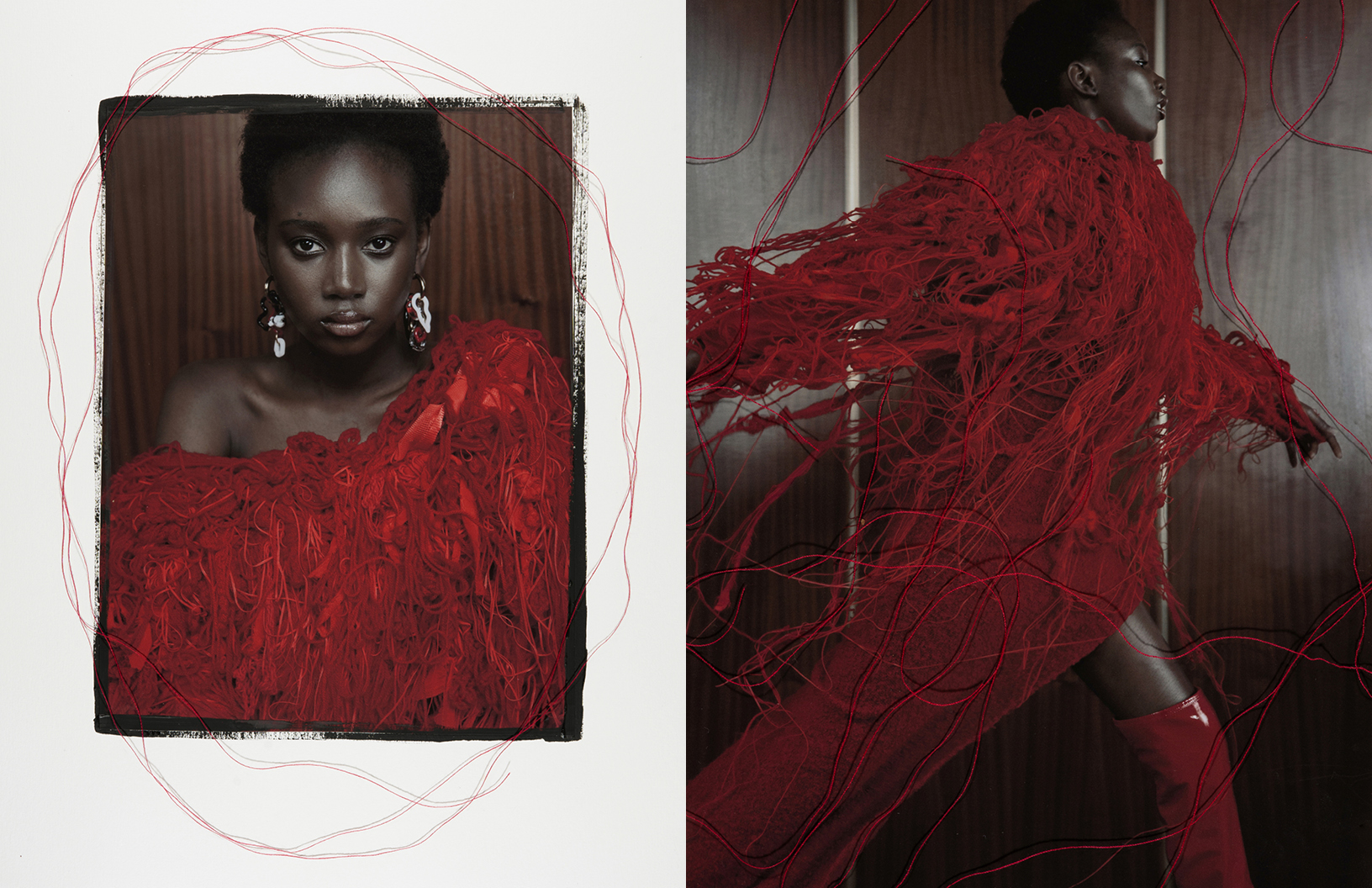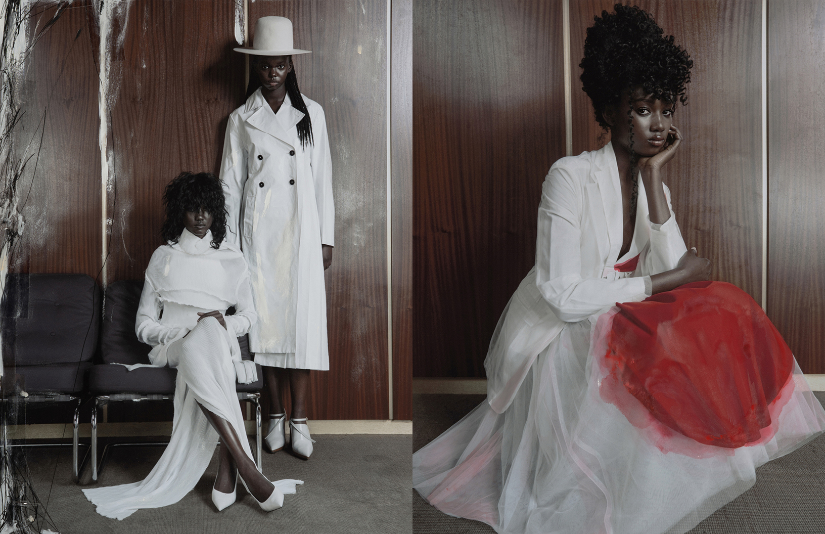 Crimson red flashes throughout this Schön! editorial produced by photographer Maximilian Schwarz with direction and cinematography by Reza Norifarahani. Fashion is by Sebastian Burch who dresses Iadria, Magatte and Aluk in looks by Comme des Garçons, Jil Sander, Prada and others, with hair and make up by Tanja Gravina.