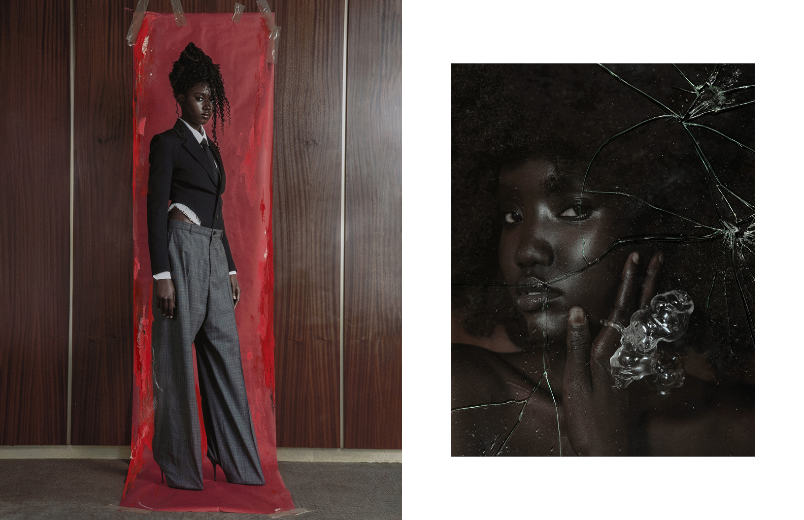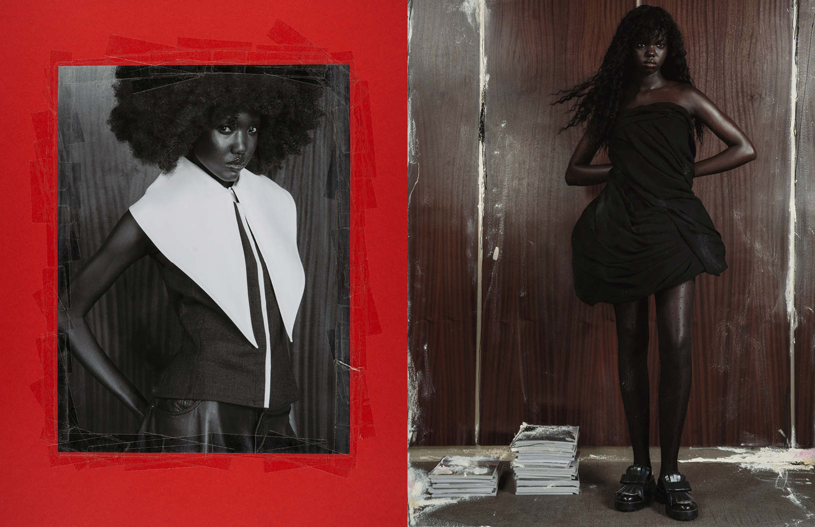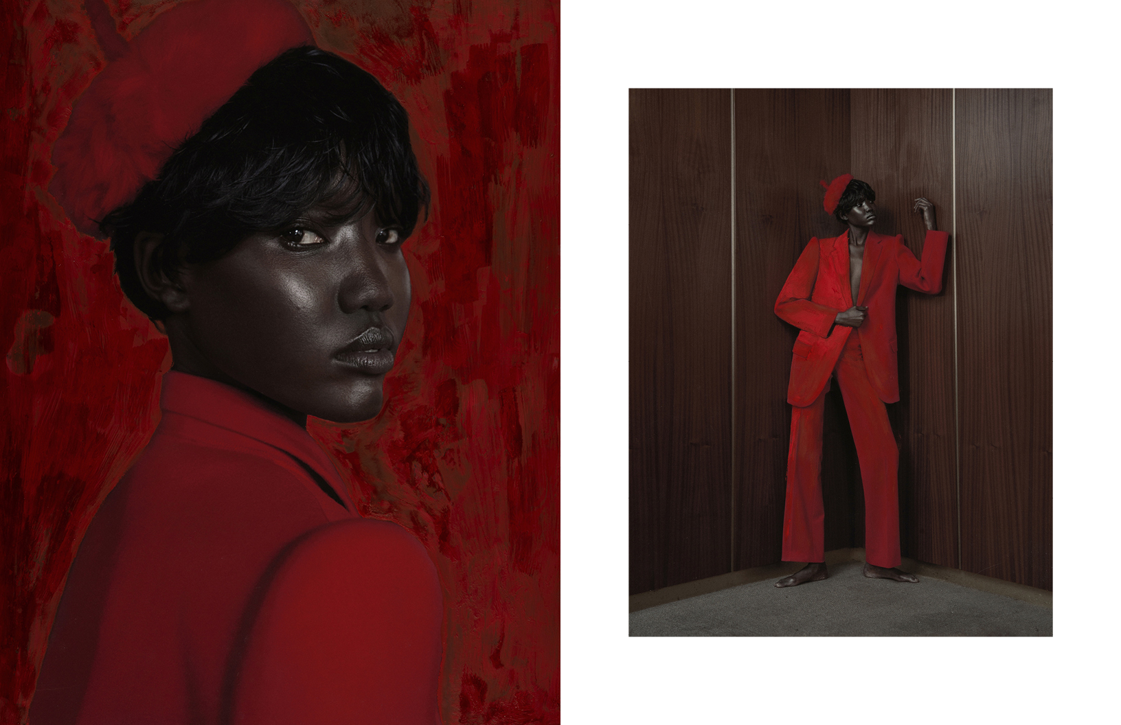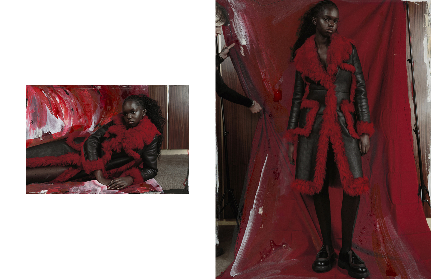 Crimson red flashes throughout this Schön! editorial produced by photographer Maximilian Schwarz with direction and cinematography by Reza Norifarahani. Fashion is by Sebastian Burch who dresses Iadria, Magatte and Aluk in looks by Comme des Garçons, Jil Sander, Prada and others, with hair and make up by Tanja Gravina.