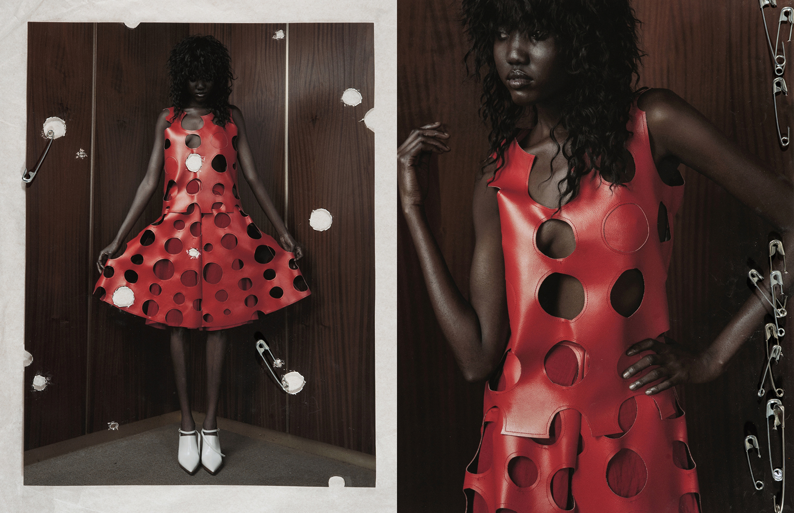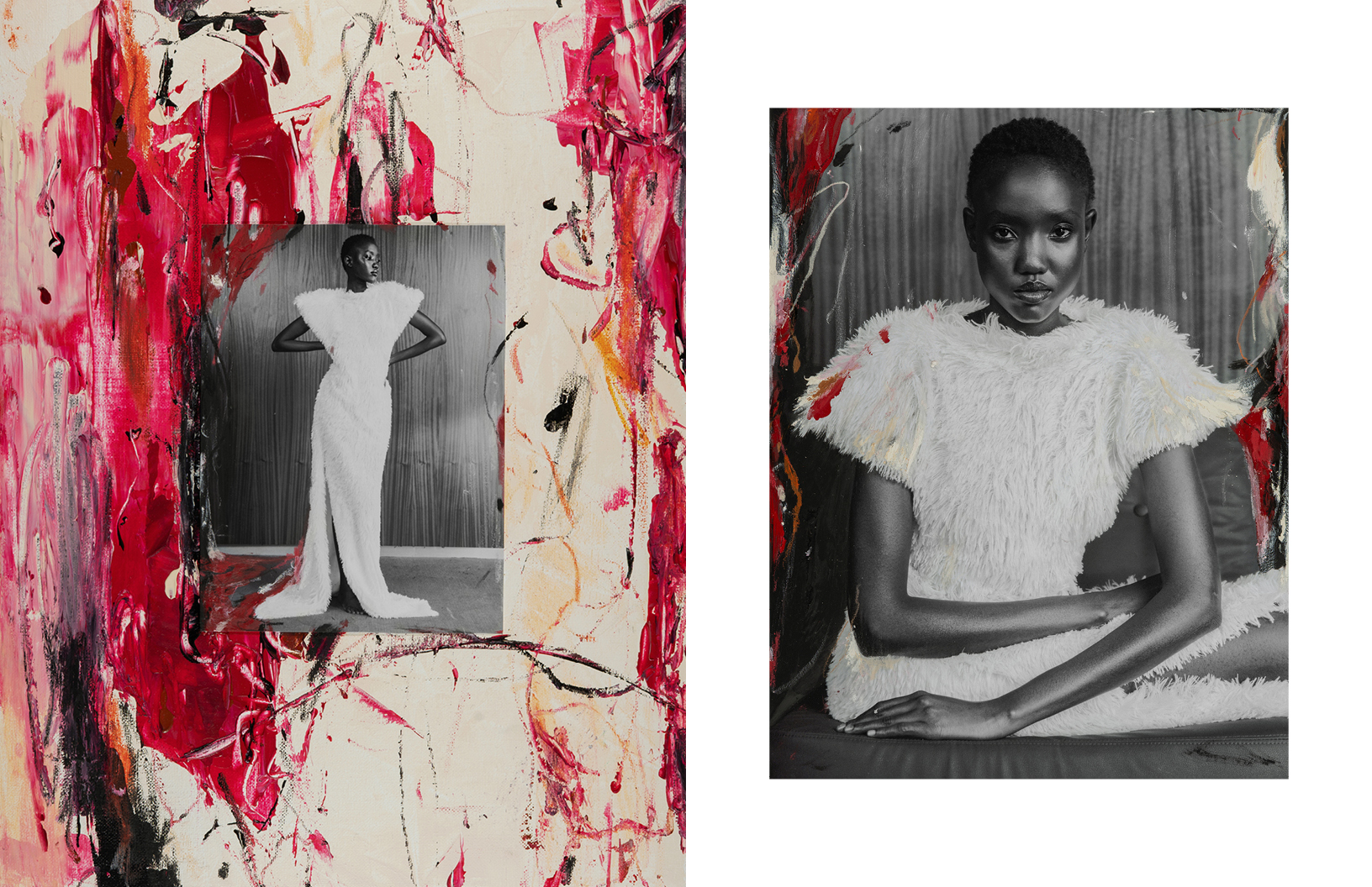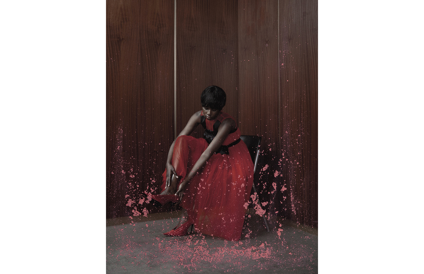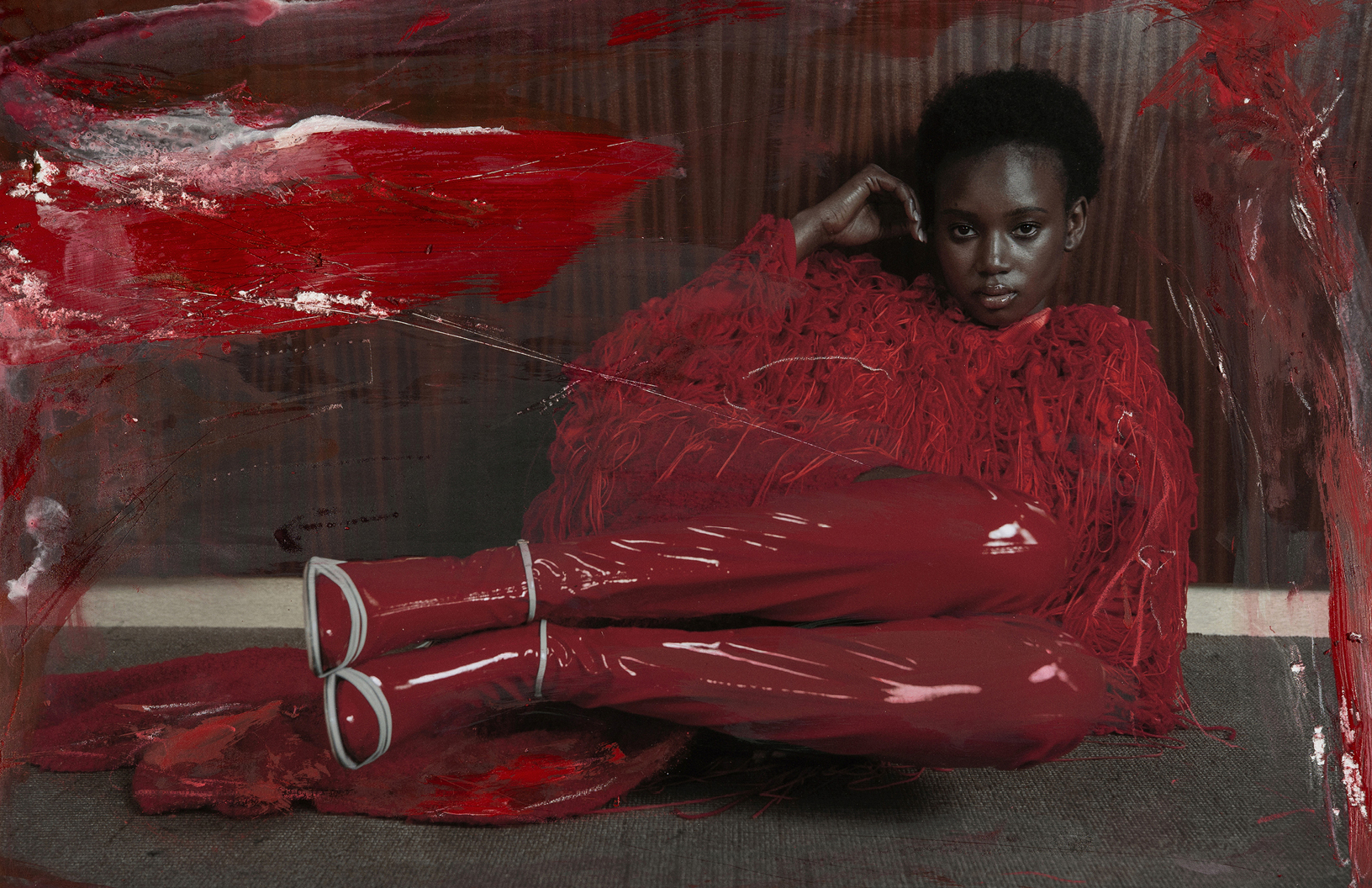 Crimson red flashes throughout this Schön! editorial produced by photographer Maximilian Schwarz with direction and cinematography by Reza Norifarahani. Fashion is by Sebastian Burch who dresses Iadria, Magatte and Aluk in looks by Comme des Garçons, Jil Sander, Prada and others, with hair and make up by Tanja Gravina.