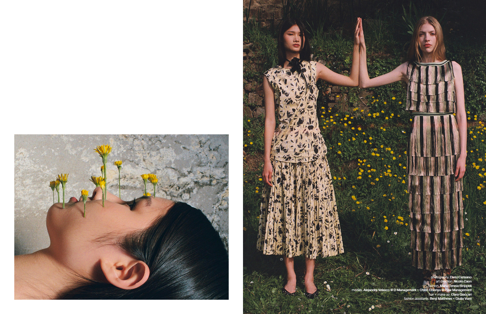 Although some may think that dandelions — or known as “dente di leone” which is Italian for “lion’s tooth” — are weeds, but photographer Dario Cerisano and art directior Nicolò Caon invite you to look at them from a new perspective in this Schön! editorial featuring fashion by Maria Teresa Strippoli who styles Alejandra Velasco and Chien Chienyu in looks by Fendi, Vivetta, Marsèll, and others. Hair and make up by artist Clara Giaccari.