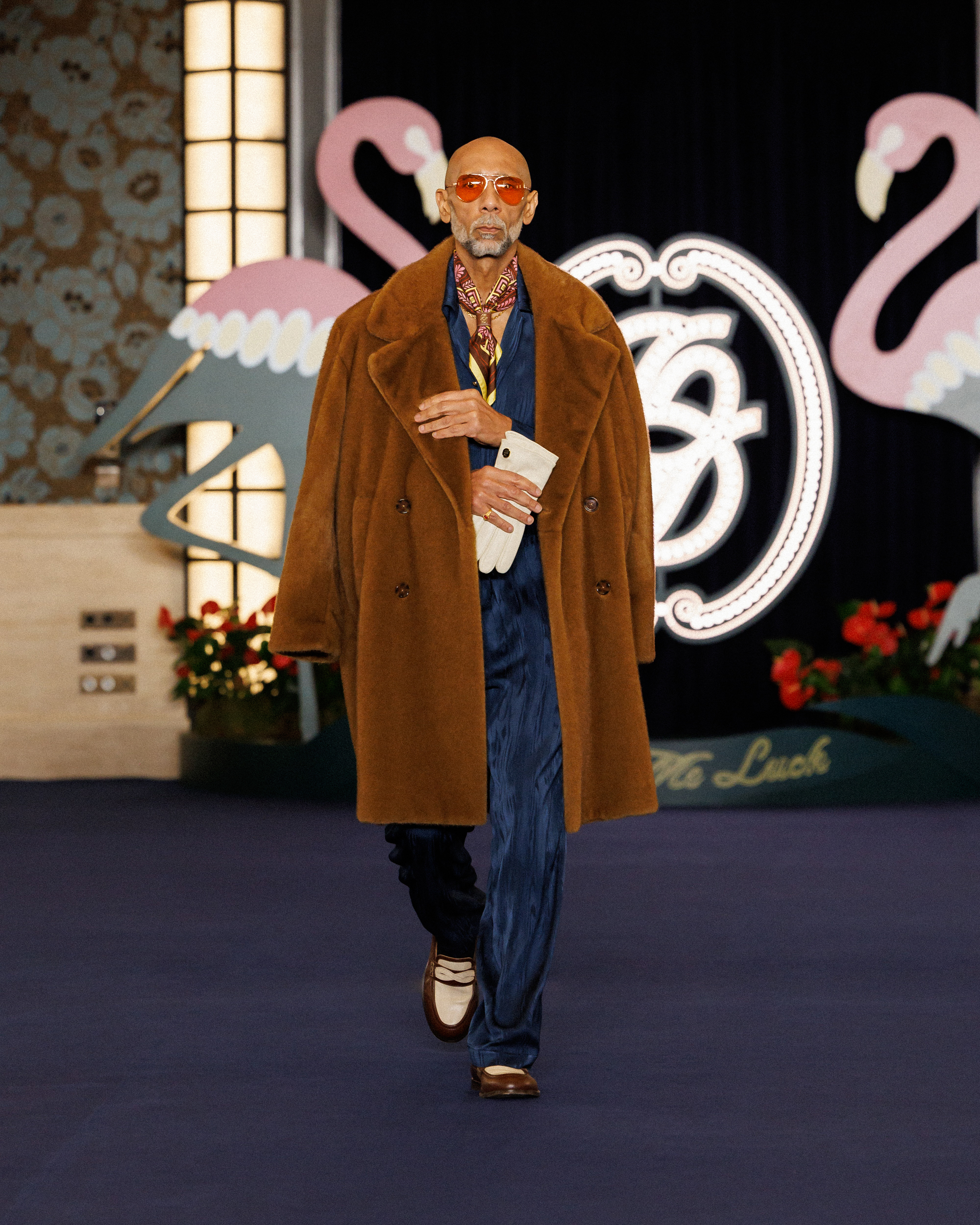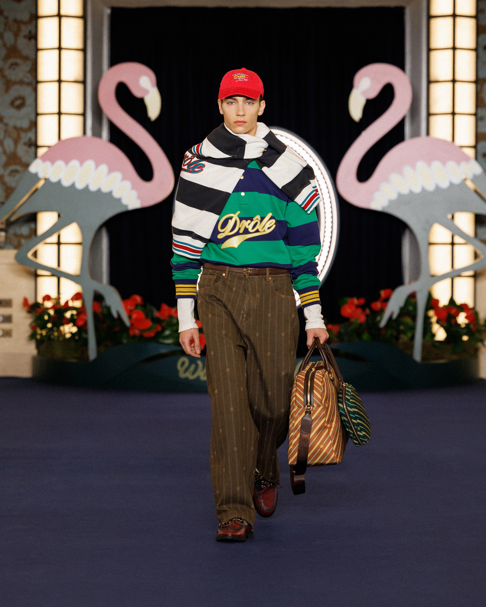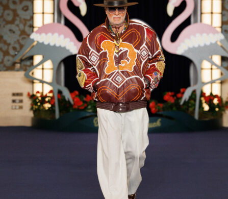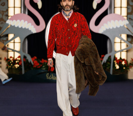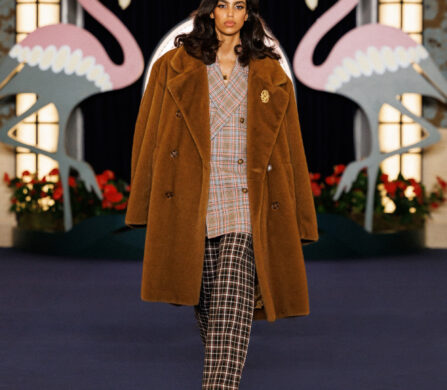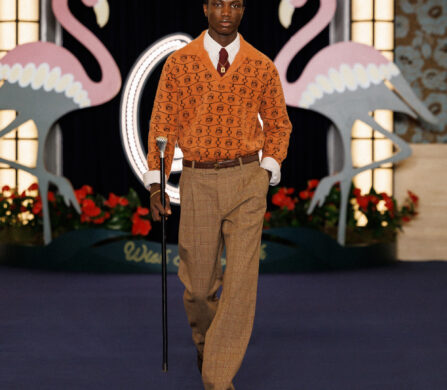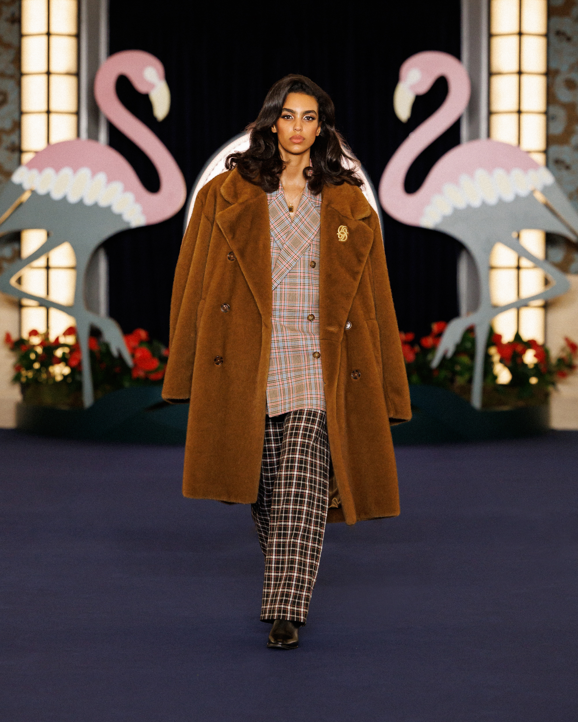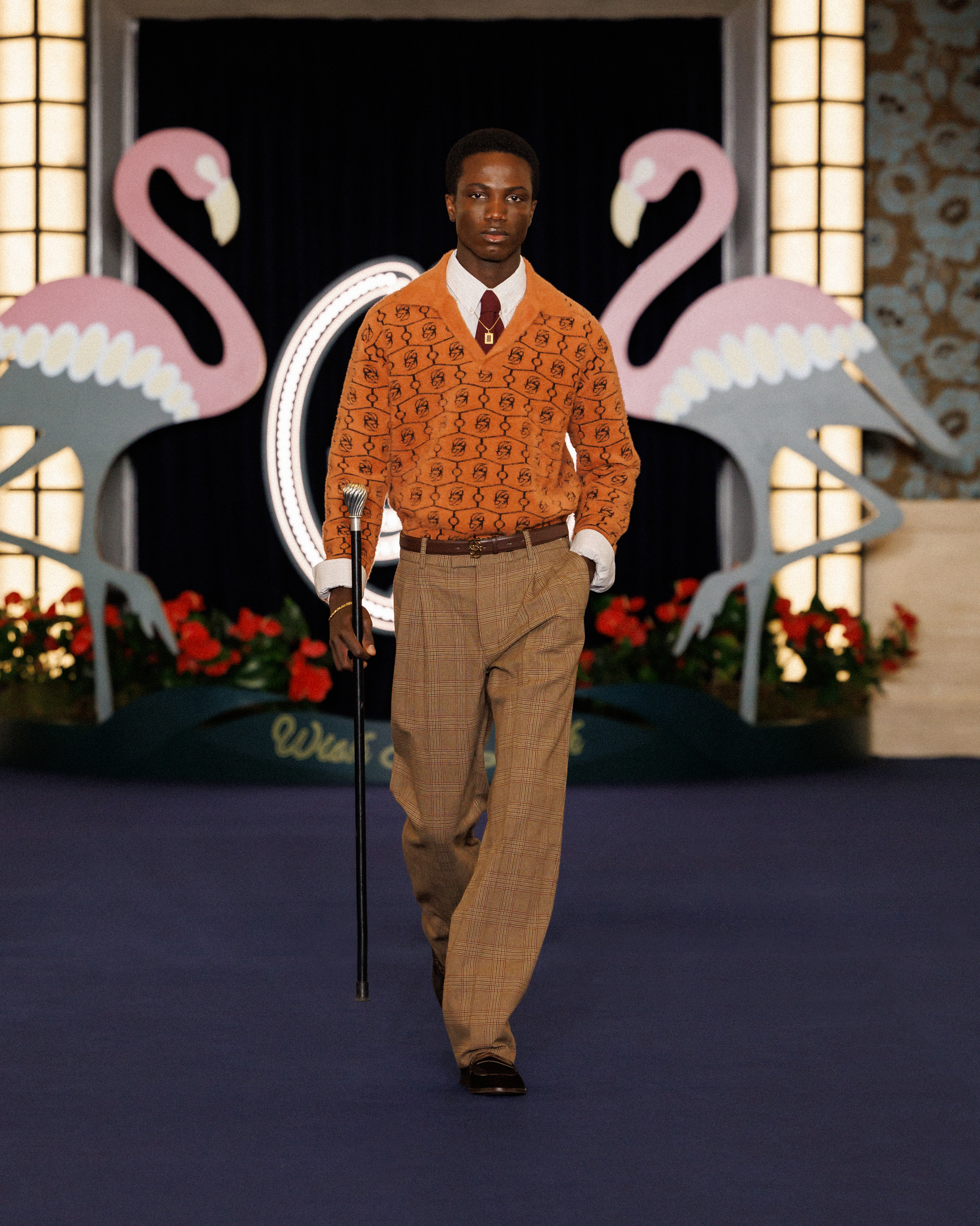 In the show notes, they mention the opening of the Flamingo – a casino hotel on the Las Vegas Strip – in 1946, and how “the city transformed into a glittering set where luxury, glamour and power shaped a singular, dramatic world, immortalized by cinema and its iconic high-society figures.” This idea materialises as more than just the two giant flamingoes flanking the runway backdrop; it’s evident in the vintage-inspired prints (think plaid on plaid, stripes on stripes, floral motifs, and wood-inspired patterns), excessive layering, and gold jewellery. It’s not quiet, but it’s not chaotic either. Somehow, burnt oranges, bright reds, cognacs, deep blues, and vibrant greens balance one another out.