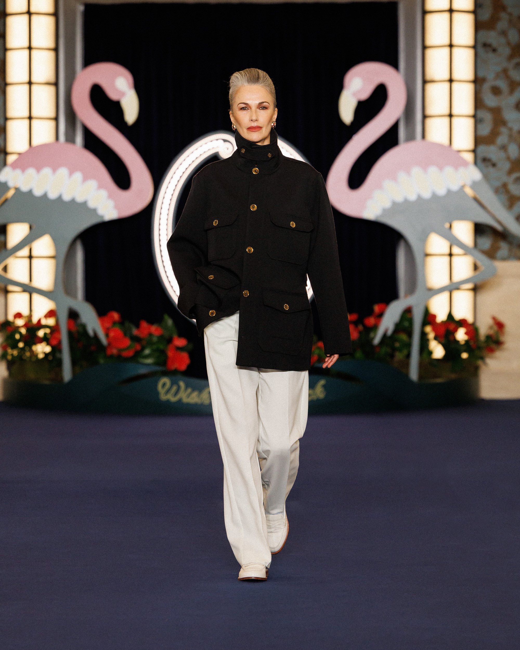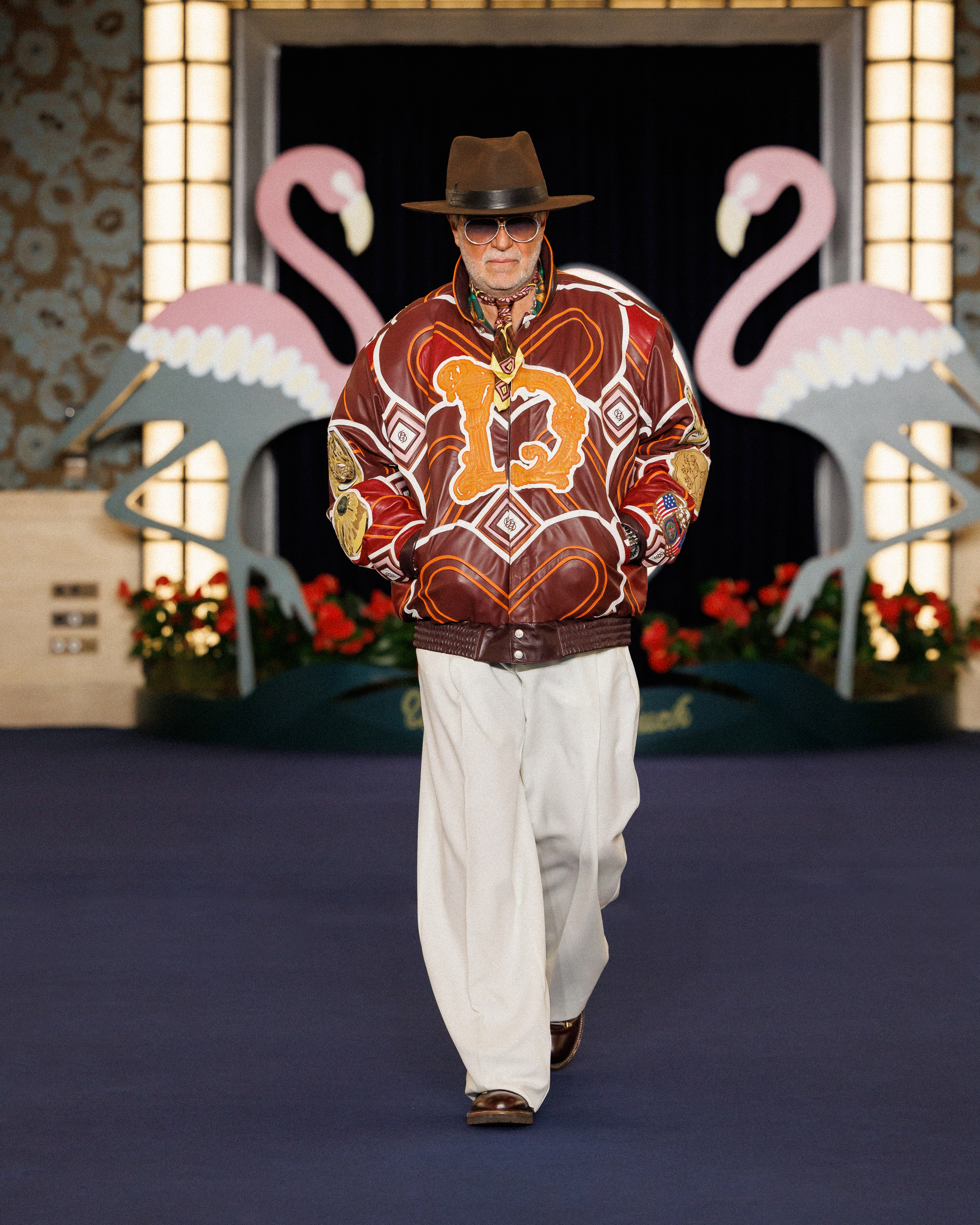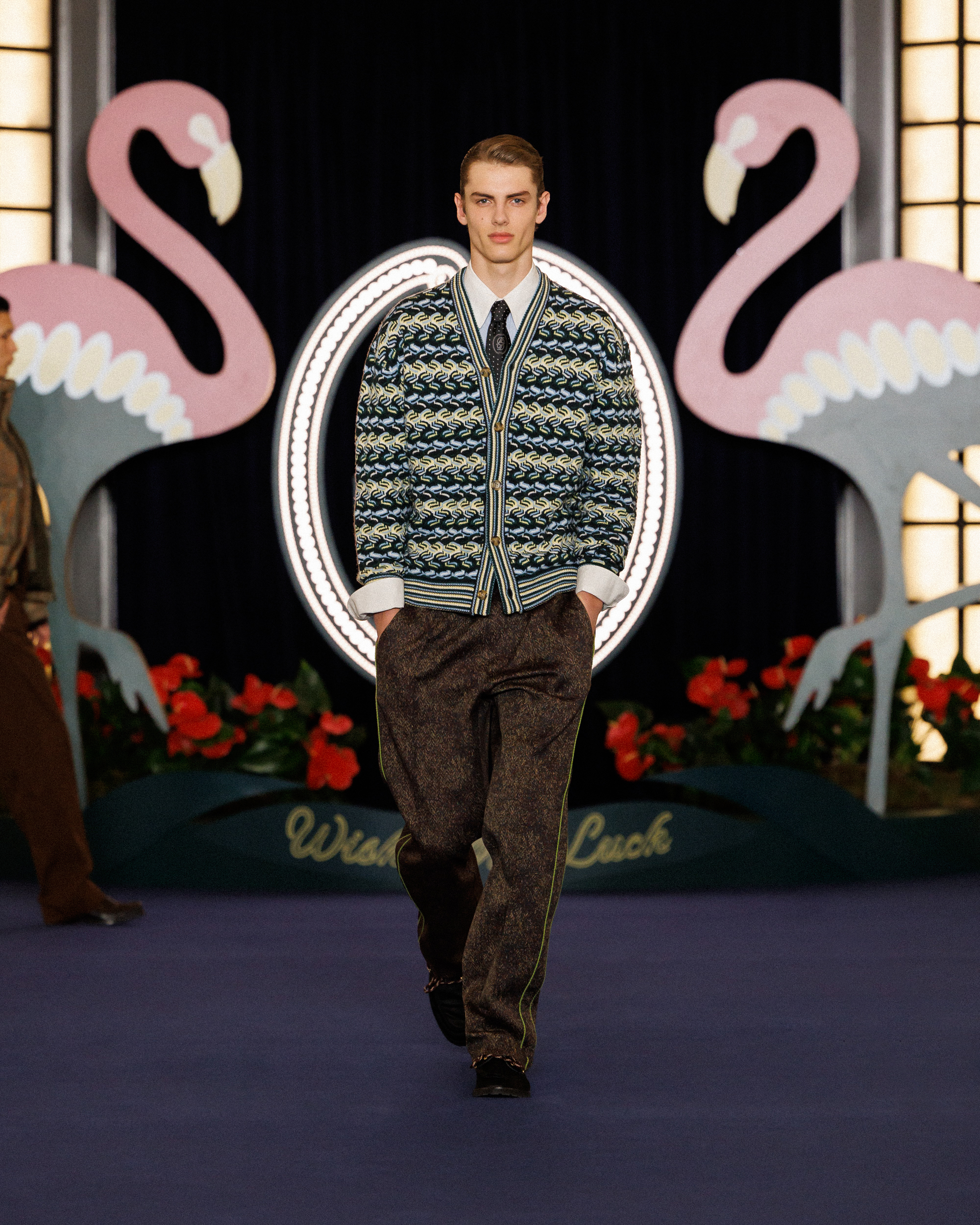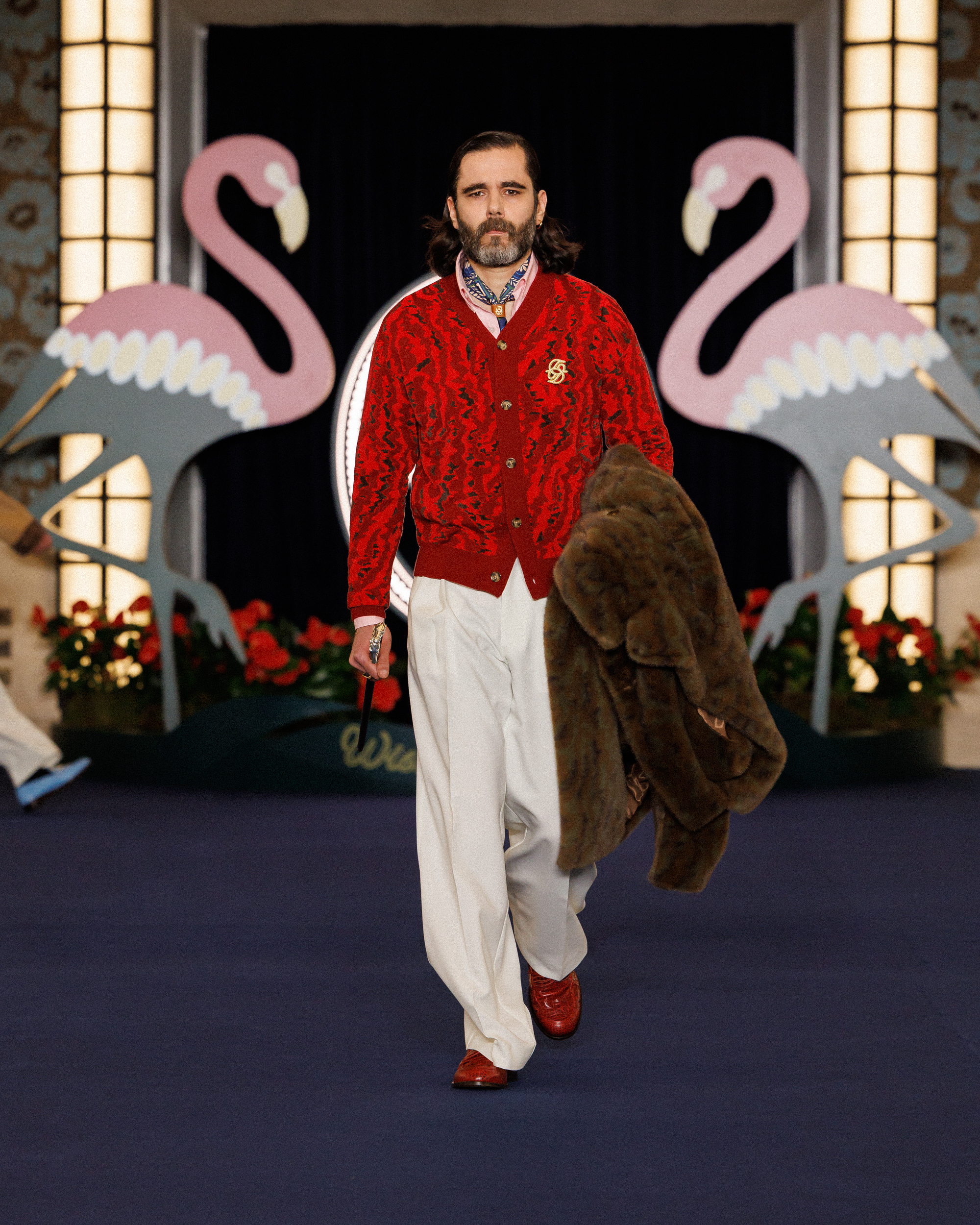In the show notes, they mention the opening of the Flamingo – a casino hotel on the Las Vegas Strip – in 1946, and how “the city transformed into a glittering set where luxury, glamour and power shaped a singular, dramatic world, immortalized by cinema and its iconic high-society figures.” This idea materialises as more than just the two giant flamingoes flanking the runway backdrop; it’s evident in the vintage-inspired prints (think plaid on plaid, stripes on stripes, floral motifs, and wood-inspired patterns), excessive layering, and gold jewellery. It’s not quiet, but it’s not chaotic either. Somehow, burnt oranges, bright reds, cognacs, deep blues, and vibrant greens balance one another out.