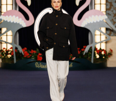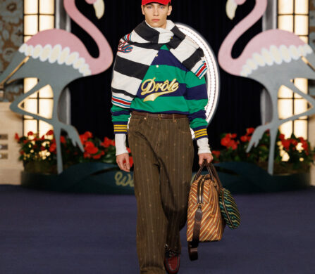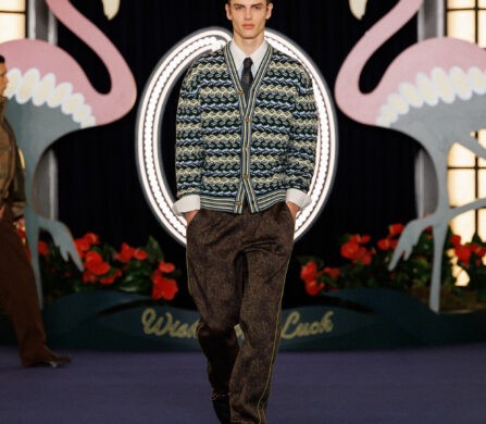 When it comes to silhouettes, it’s Casino – the 1995 crime thriller – that most directly influences the collection, bringing the Drôle de Monsieur world into crisp focus. Suiting is razor-sharp, coats are oversized and belted, wide-leg trousers are neatly pleated, and bomber jackets are cut to flatter – not cropped, yet not too long. Beyond evoking the spirit of Sin City, the collection feels thoughtful and precise in its design. The Drôle de Monsieur model knows their body, and exactly how it should be adorned.