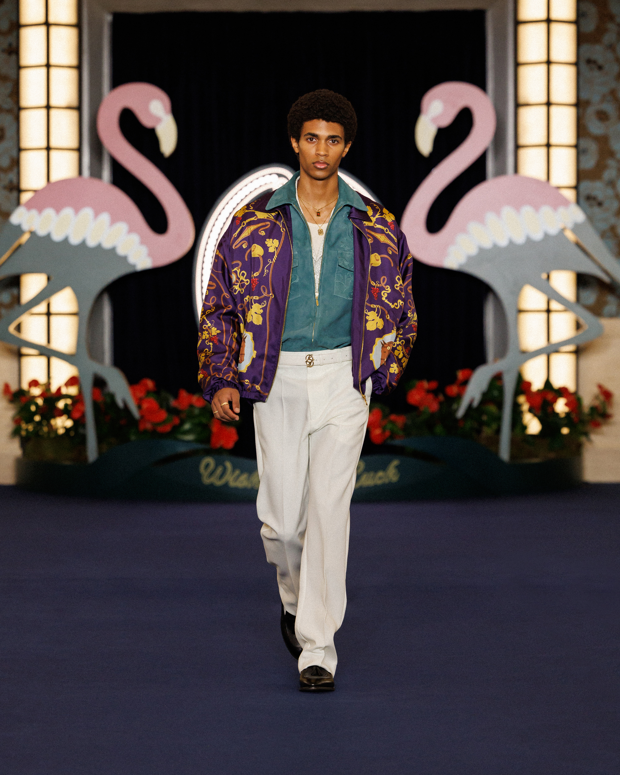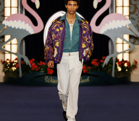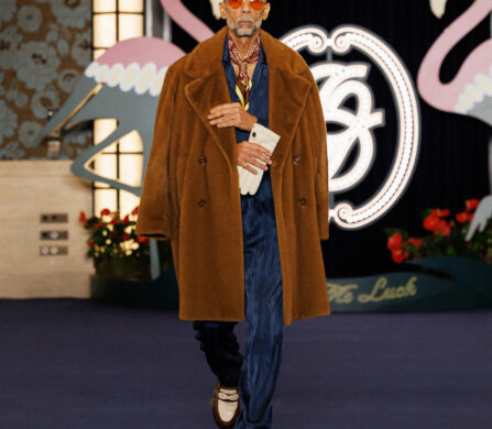 Caesar’s Palace marks a shift in the collection’s energy. The casino, much like the collection itself, welcomes a cast of characters: boxers, showgirls, show-offs, mobsters, entertainers, rappers, gamblers, and billionaires. It’s an eclectic mix that, while vastly different, works effortlessly together. These characters heighten the spectacle of the collection, where oversized coats and metal-ornamented canes are juxtaposed with striped sports jerseys and matching satin sets.