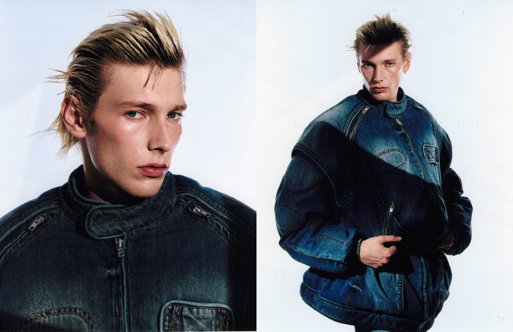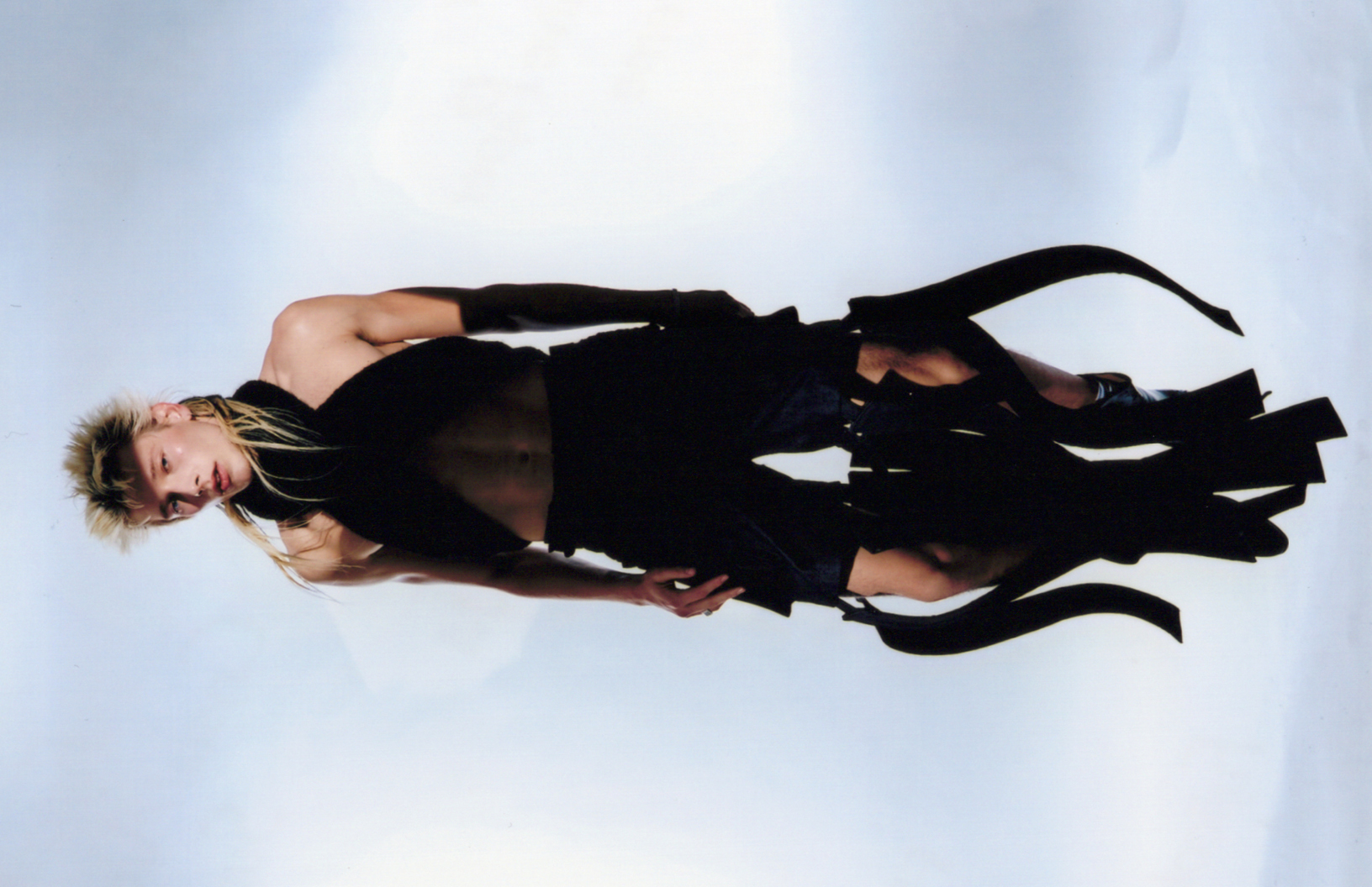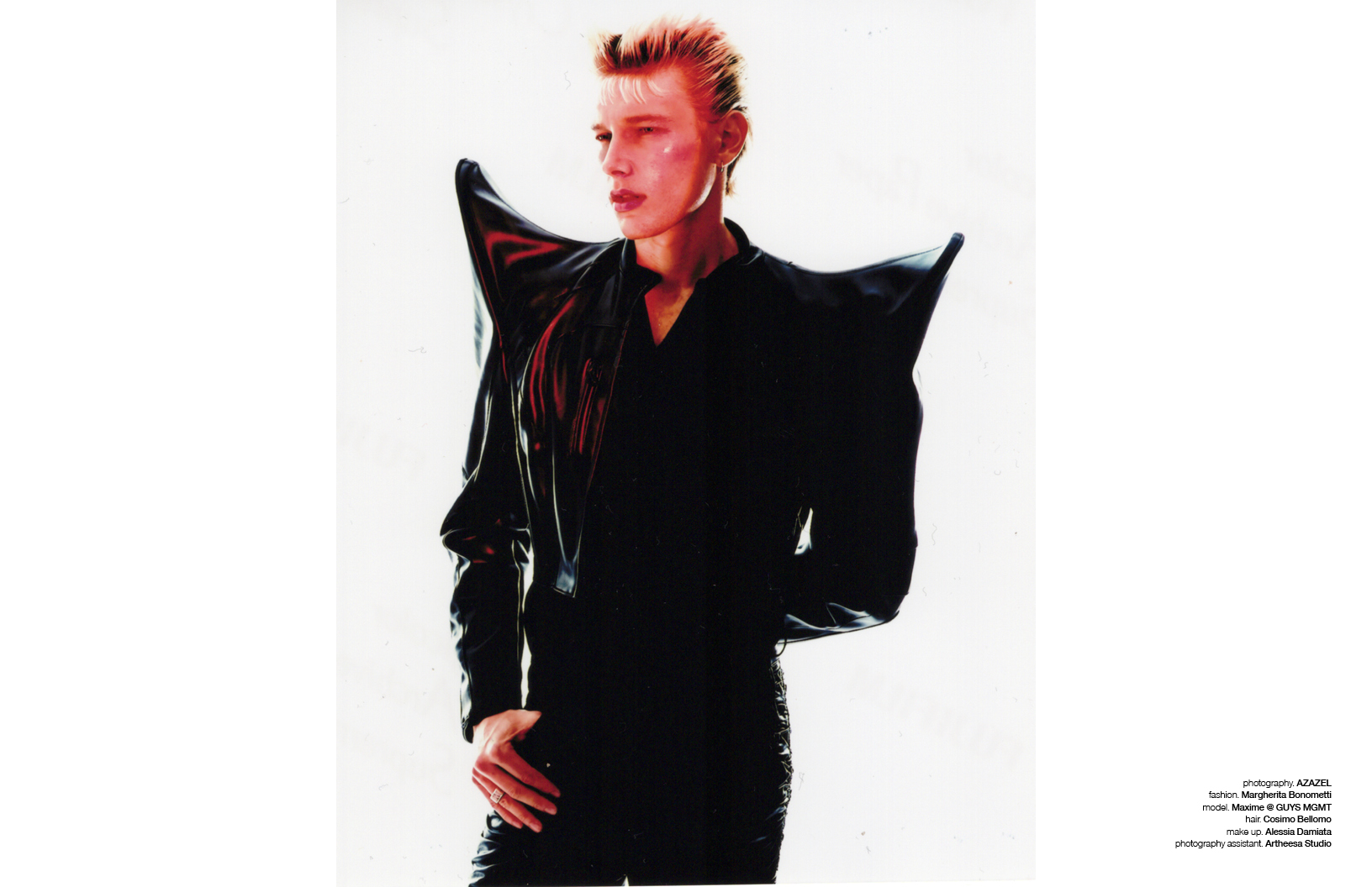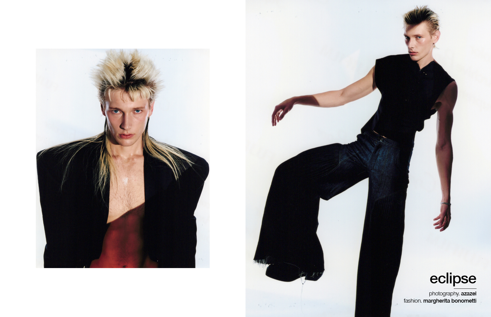 There is no slipping under the shadows of the eclipse in this Schön! editorial photographed by AZAZEL with fashion by Margherita Bonometti who dresses Maxime in looks by Namilia, Bottega Veneta, R5H5 and others. Hair by stylist Cosimo Bellomo with make up by Alessia Damiata.