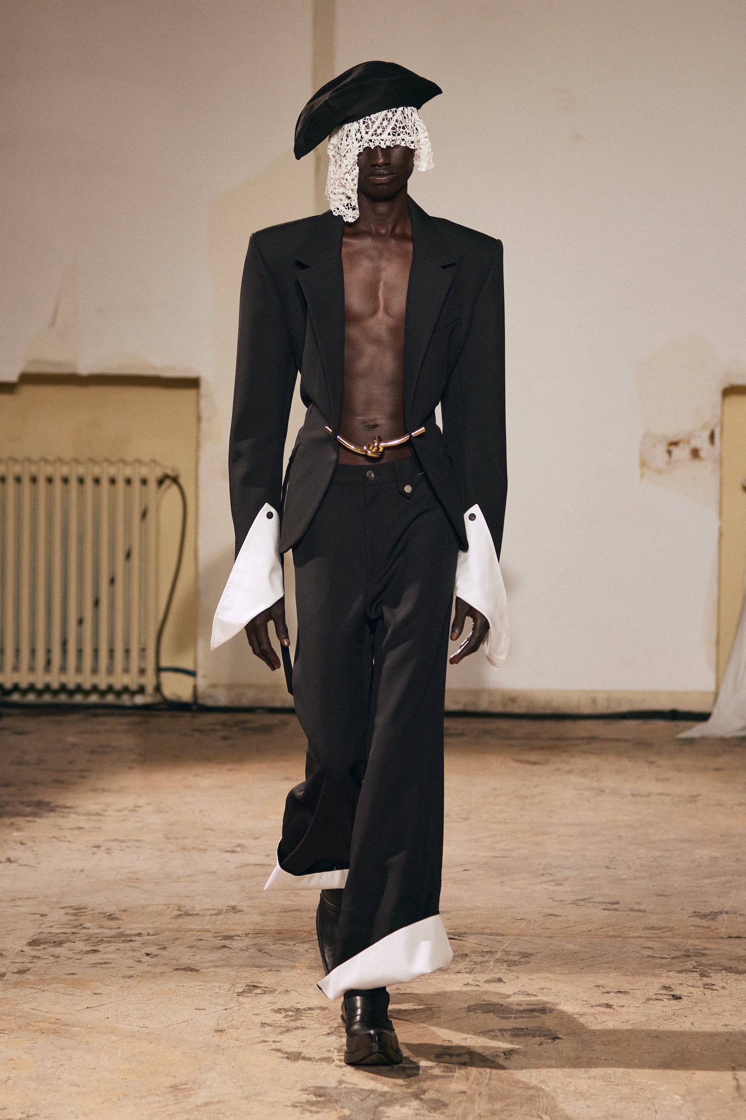 The tailoring is still sharp, but a gentler touch has crept in. Eased shoulders, hoods that fall into capes, and trousers that breathe create a relaxed yet elegant look. Tradition isn’t boxed up here; it’s unpacked and worn. Breton heritage is evident in the oversized collars (Bigoudène geometry, if you know, you know), laces and embroidery borrowed from family archives, and sleeves that button like naval jackets. It’s as if past life energy is being breathed into these garments in the best way possible.