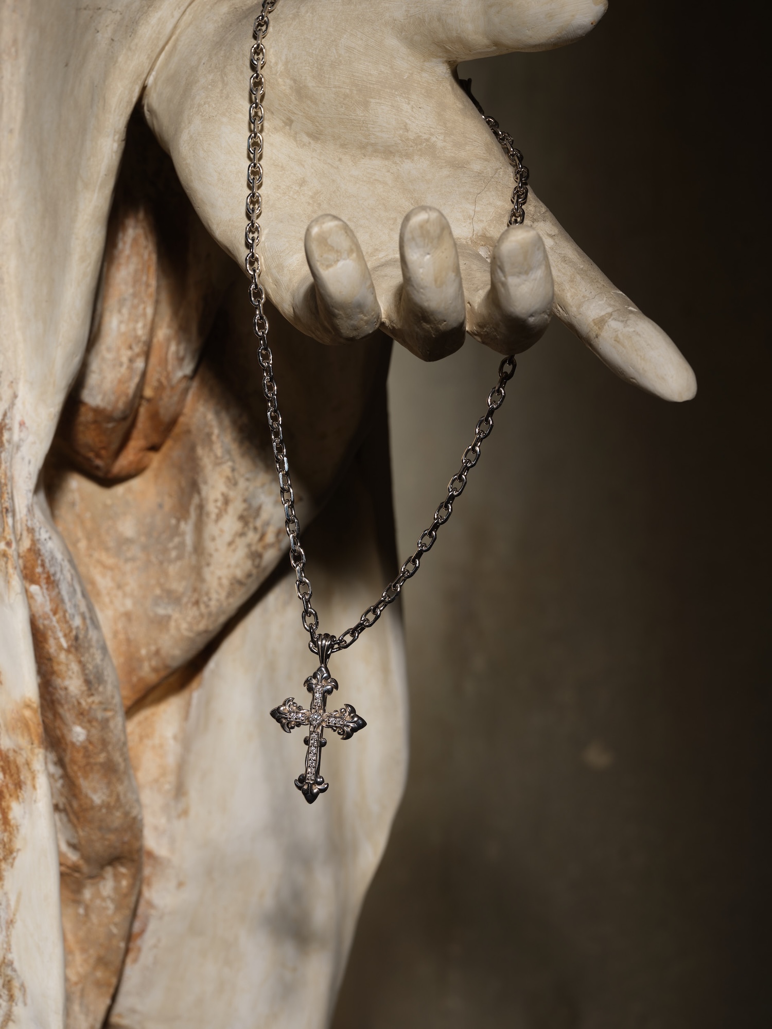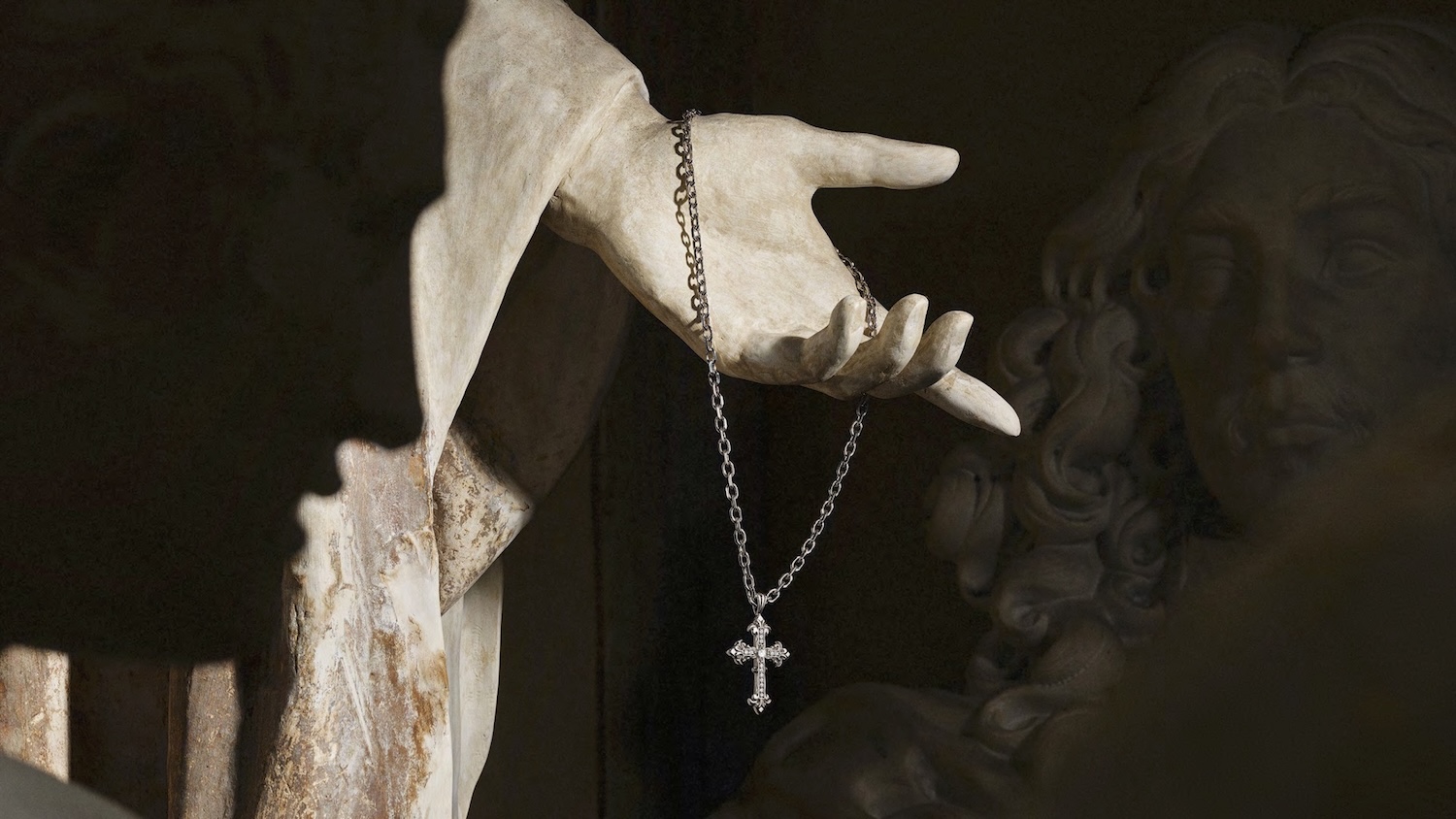Other pieces, like the exquisite ornate cross necklaces available in both solid yellow gold and silver, showcase intricate filigree that speaks directly to Bicocchi’s gothic leanings. A delicate line of vibrant rubies (or sapphires and emeralds in alternative versions) set into the centre transforms them from edgy pieces into truly luxurious emblems, making them a perfect fusion of his bold sensibility and Pisa 1940s deep heritage with precious stones.