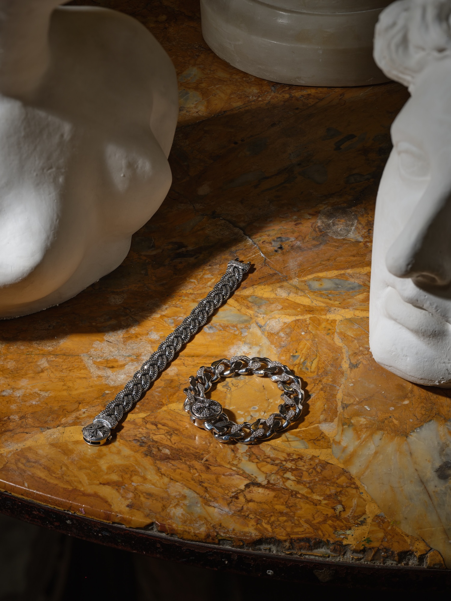 The visual language is unmistakable yet utterly luxurious. Bicocchi’s hallmark chunky curb chains, known for their satisfying weight and underground sensibility, are elevated to pure status symbols, rendered in polished yellow gold with diamond settings meticulously tracing the contours of the links. His robust, sculptural crest and coat-of-arms rings, once bold statements in oxidised silver, are now forged in gold and paved with precious, colourful stones that transform a simple gesture into a sparkling modern heirloom.